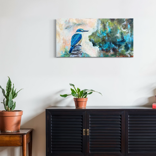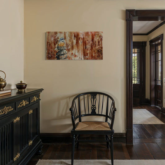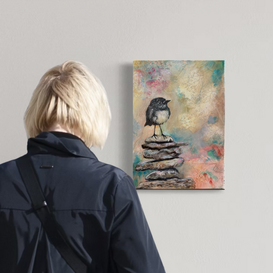 Finding Centre is a collection of paintings that explore the delicate balance between stillness and movement, weight and lightness, earth and sky. Each piece features a bird perched upon carefully stacked stones, embodying the quiet harmony found in nature and within ourselves.