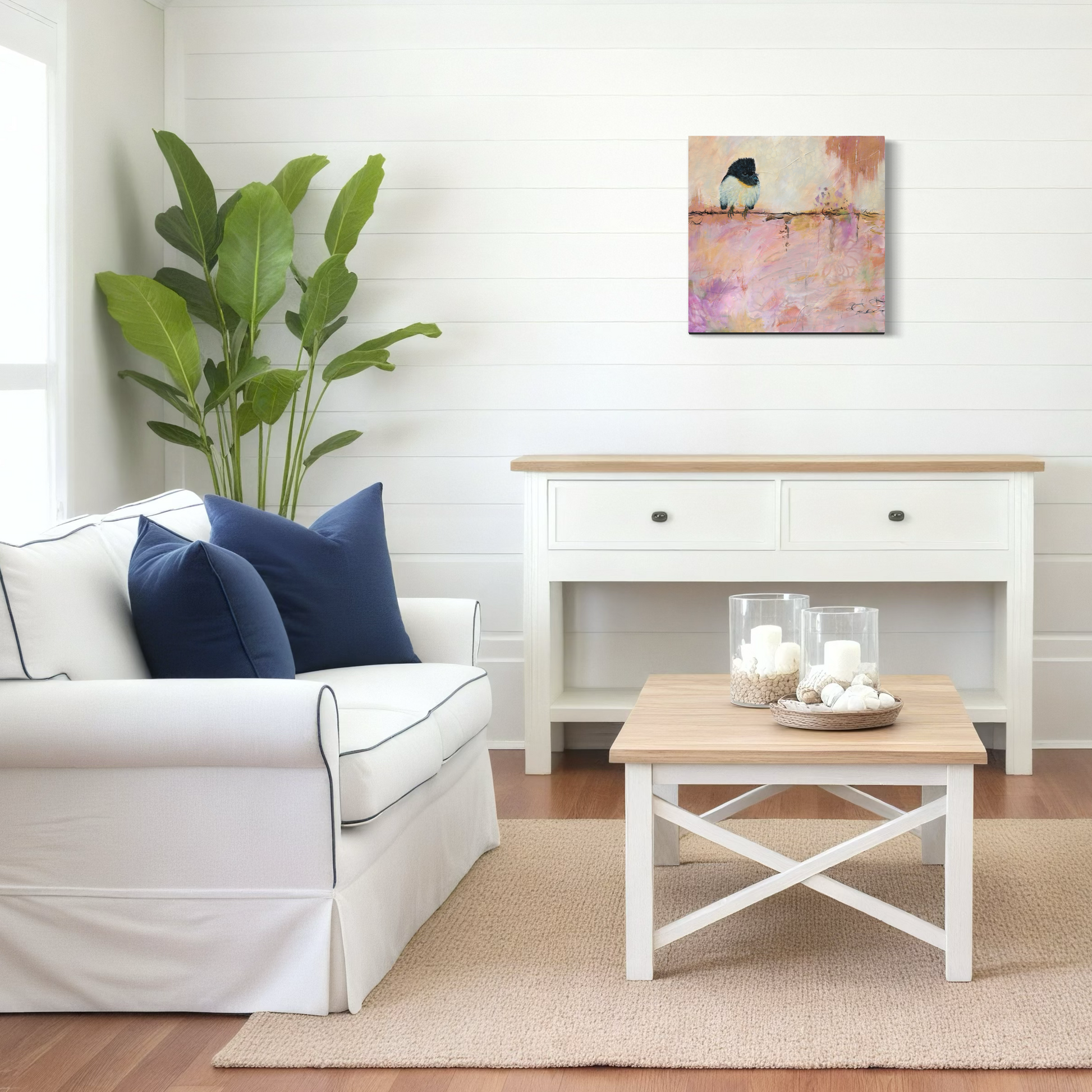 In The Tomtit’s Whisper in Gold, I wanted to capture that moment of pause—the space where whispers of the soul can be heard. The soft golds, warm pinks, and ethereal creams create a dreamlike atmosphere, a place where past and present merge, where the unseen becomes felt. The tomtit, perched lightly on a delicate wire, embodies the quiet strength found in stillness, the power of observation, and the beauty of simplicity.