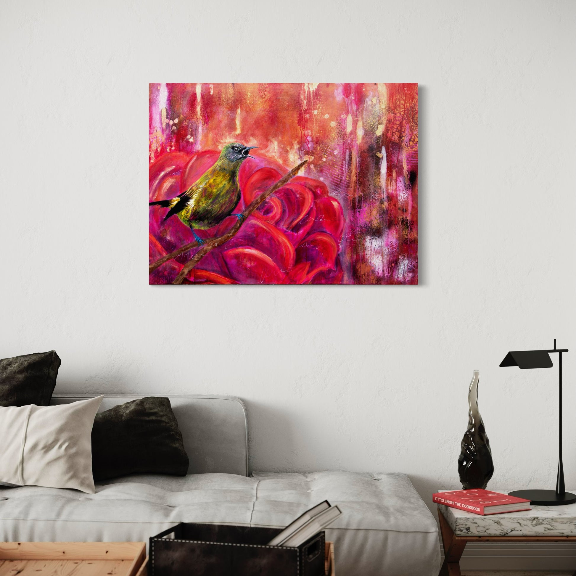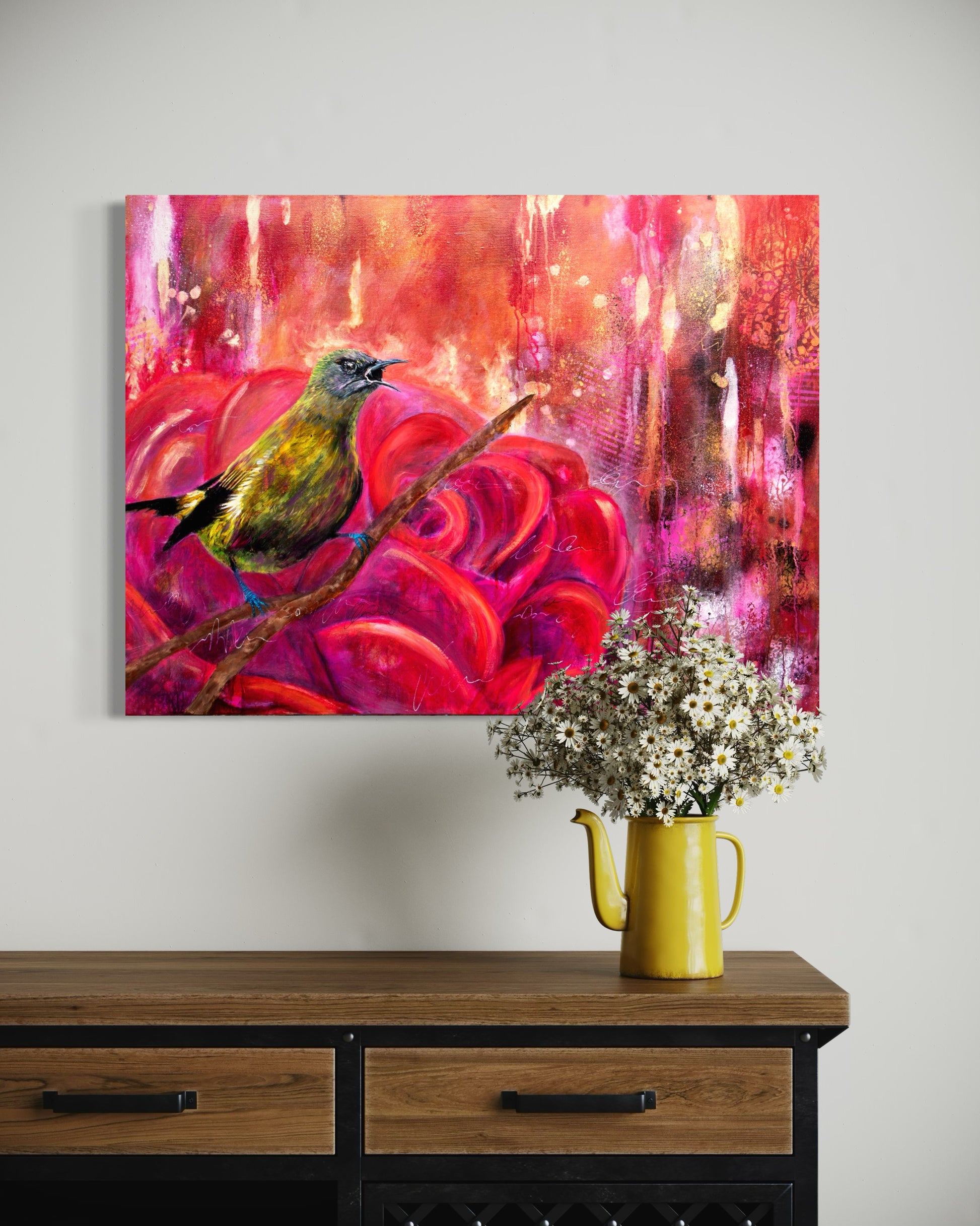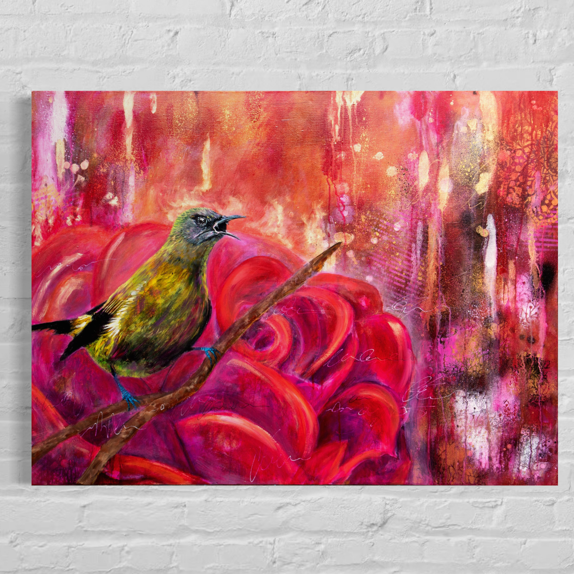 Amidst a cascade of rich crimson and luminous gold, the bellbird lifts its voice, filling the air with a melody of joy and presence. Nestled within soft, unfolding petals, it is completely at ease—immersed in the splendour that surrounds it, effortlessly radiant.
