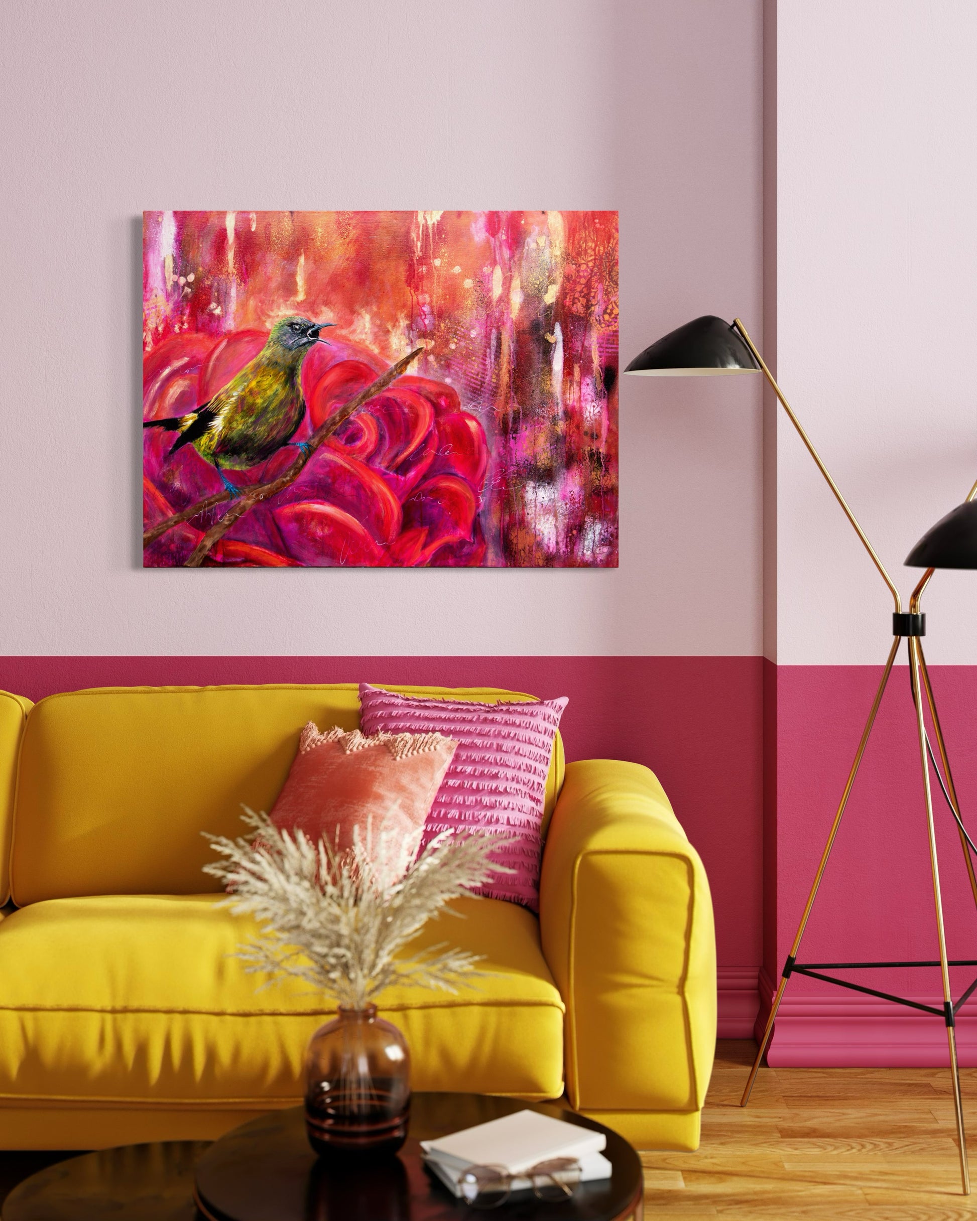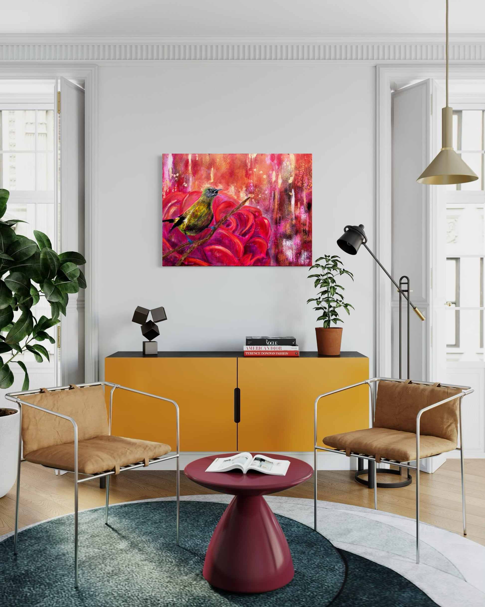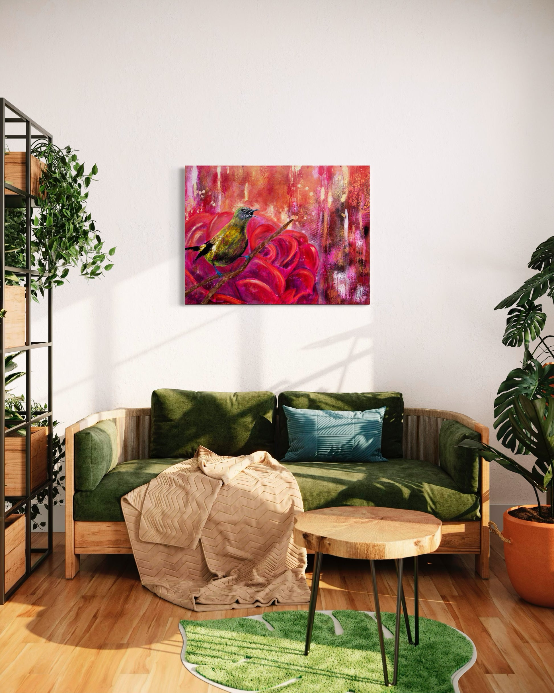 Amidst a cascade of rich crimson and luminous gold, the bellbird lifts its voice, filling the air with a melody of joy and presence. Nestled within soft, unfolding petals, it is completely at ease—immersed in the splendour that surrounds it, effortlessly radiant.