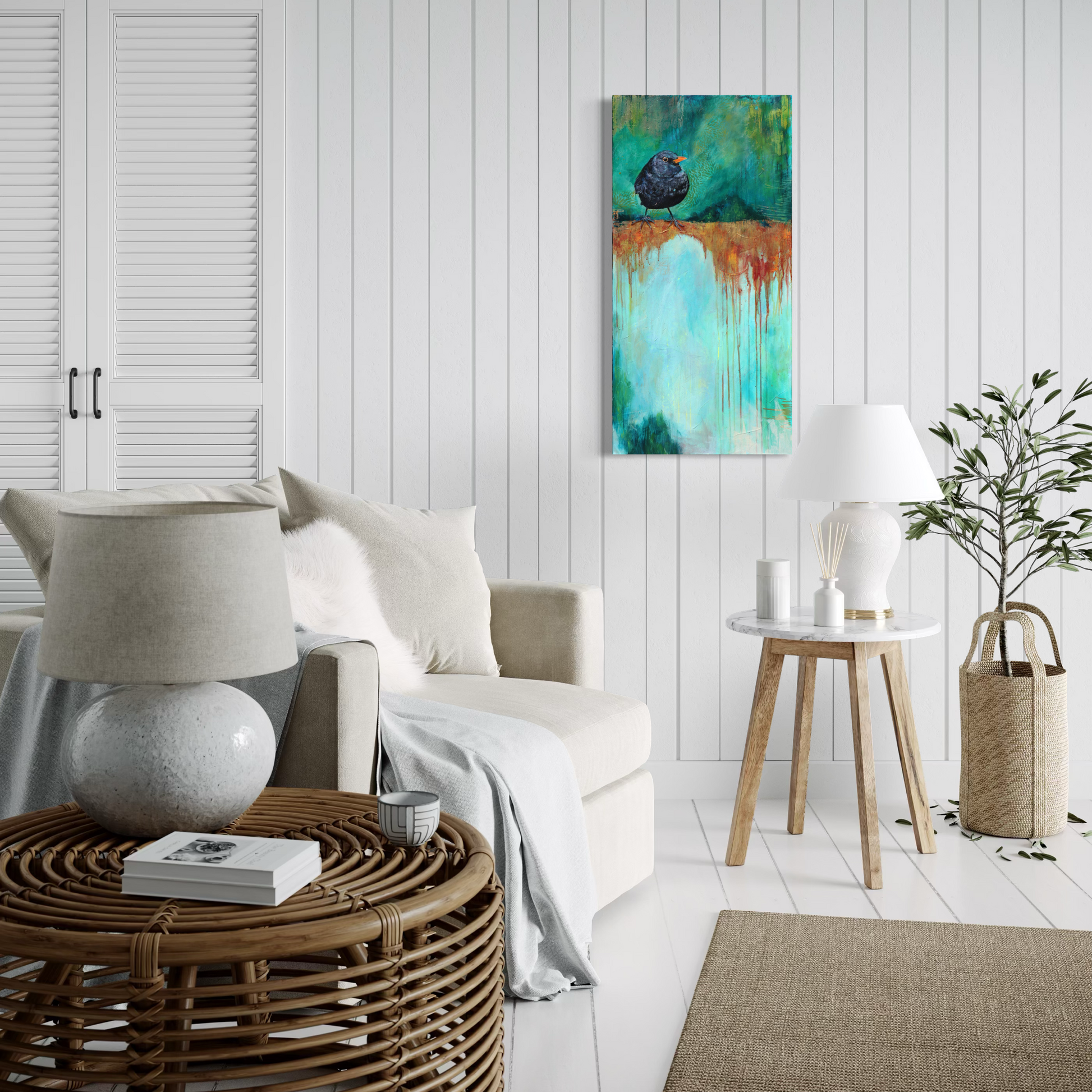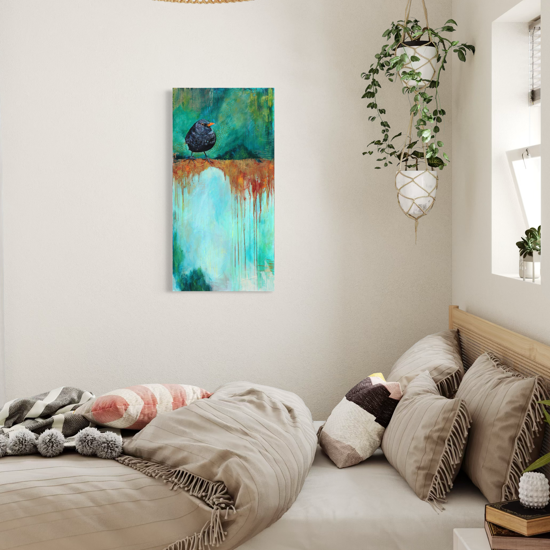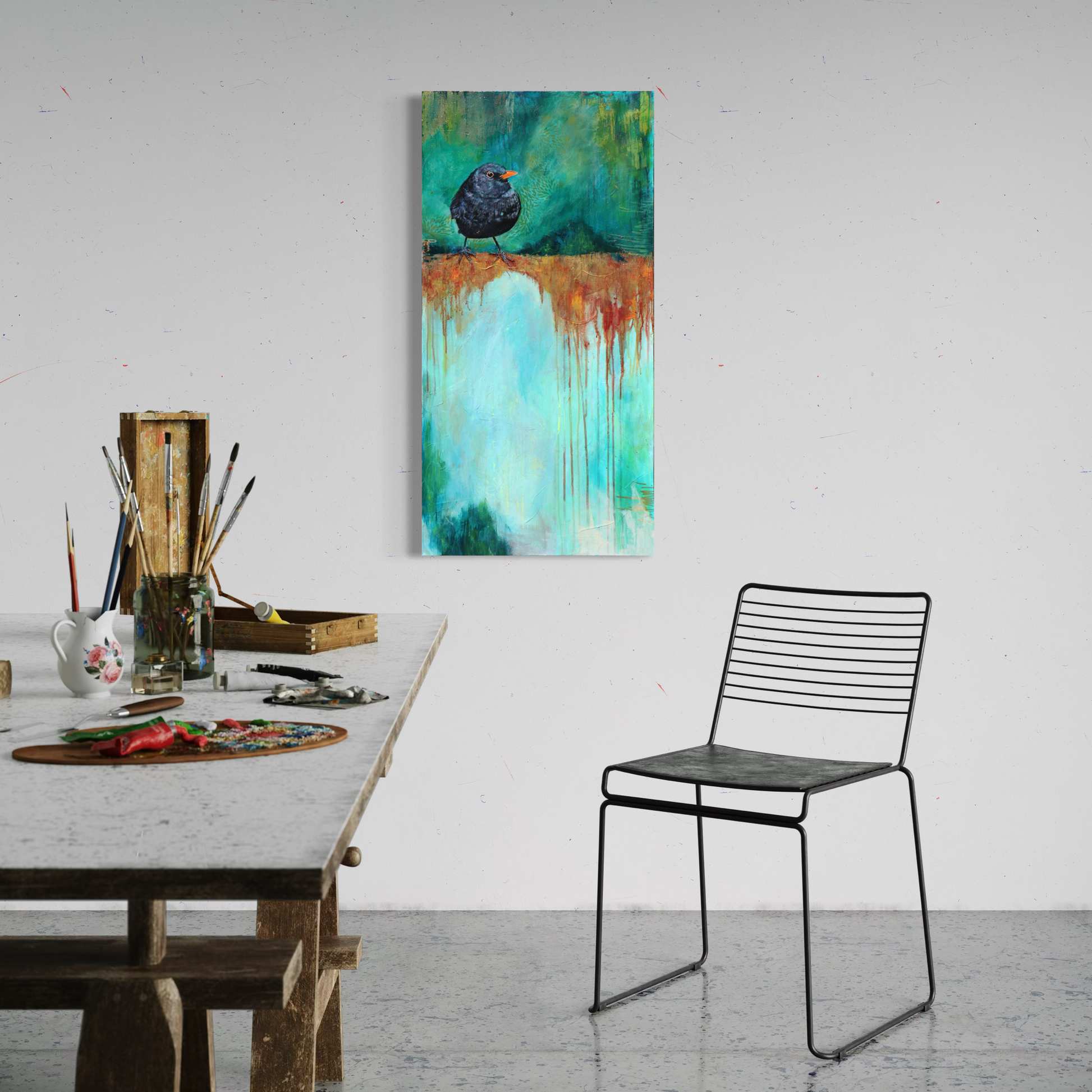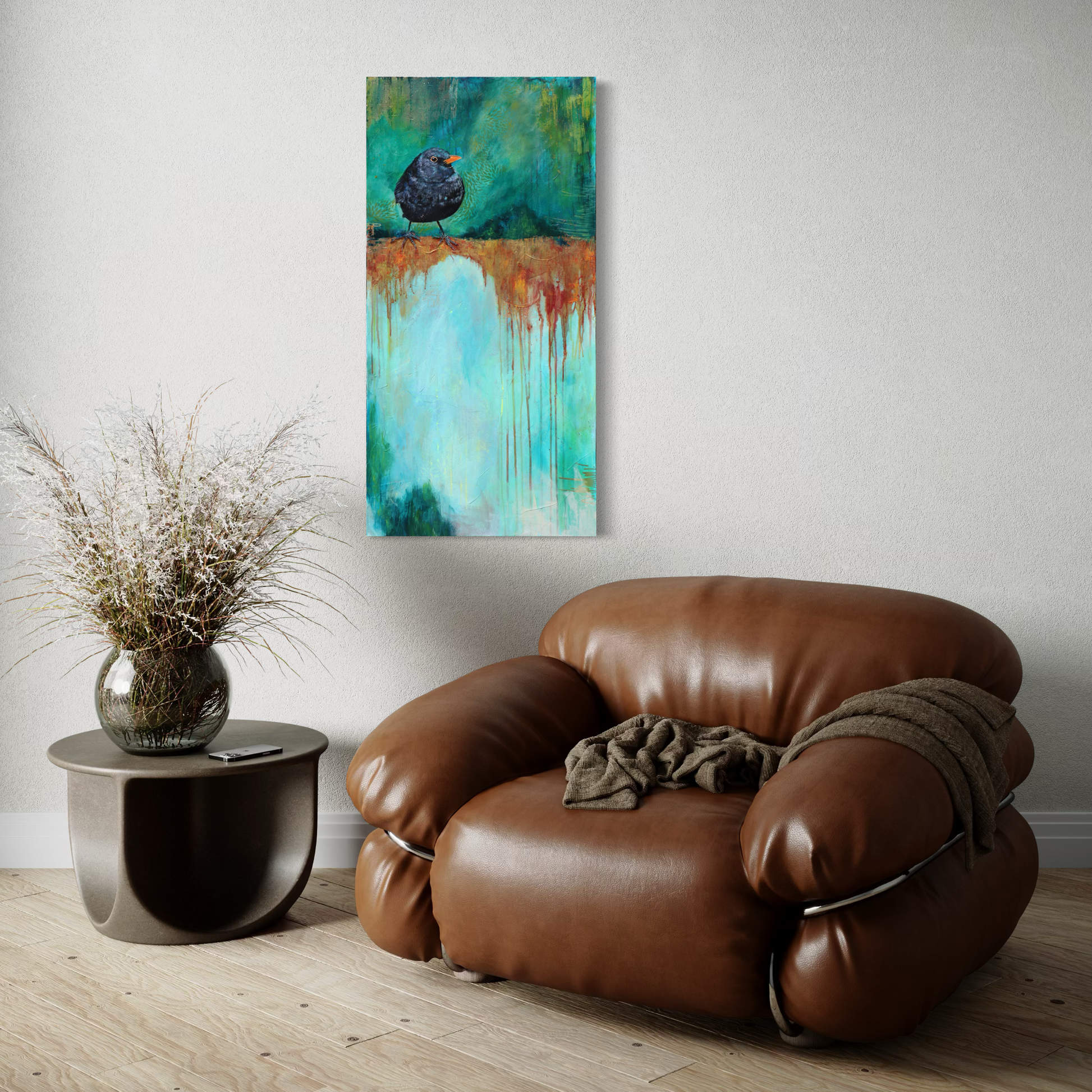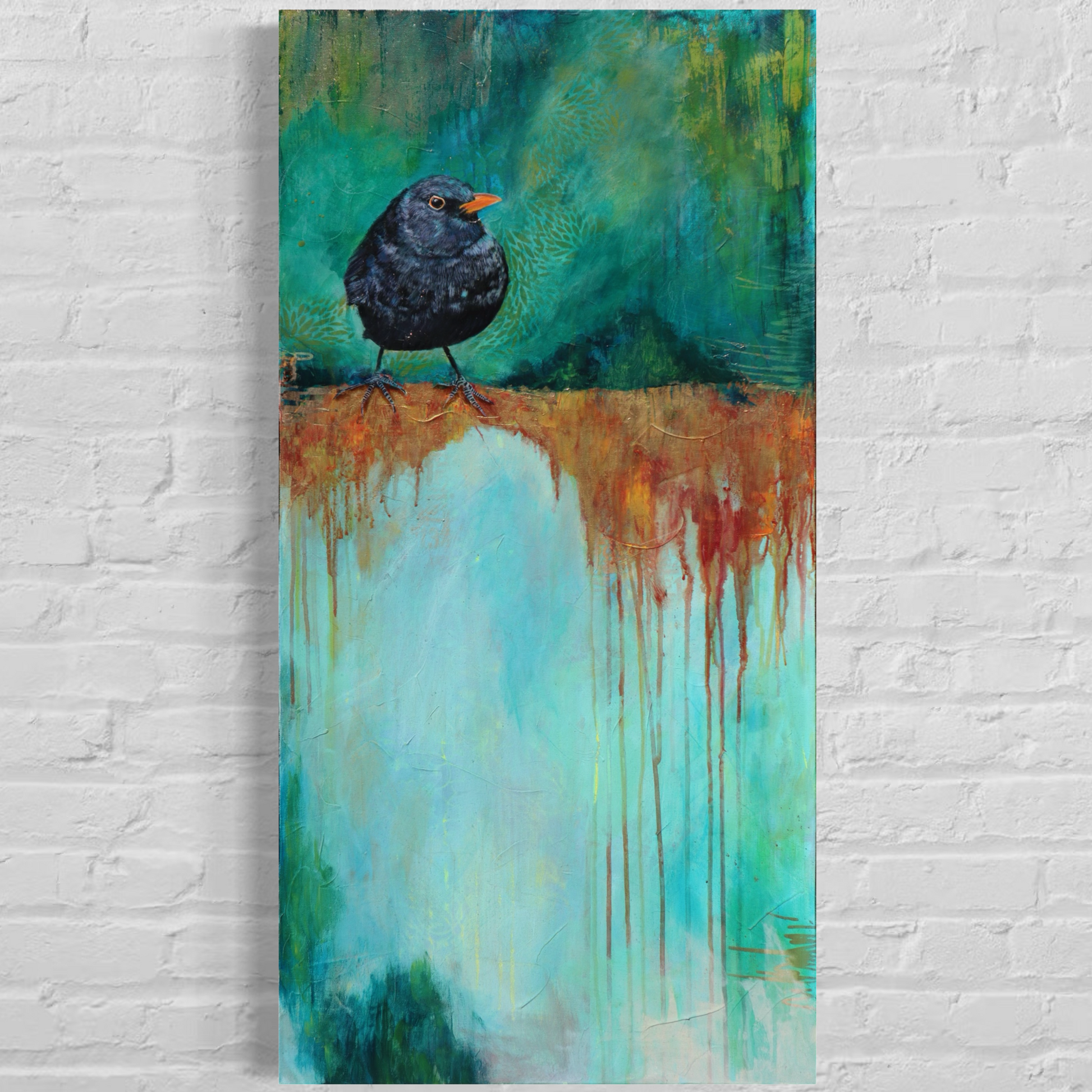 The deep emerald greens whisper of hidden realms, the places where intuition speaks in symbols and the past lingers in echoes. Below, golds and ochres drip like ancient wisdom surfacing, calling to be remembered. The blackbird, a quiet guardian of secrets, perches at the edge of the unknown, carrying the energy of prophecy, renewal, and shadowed wisdom.