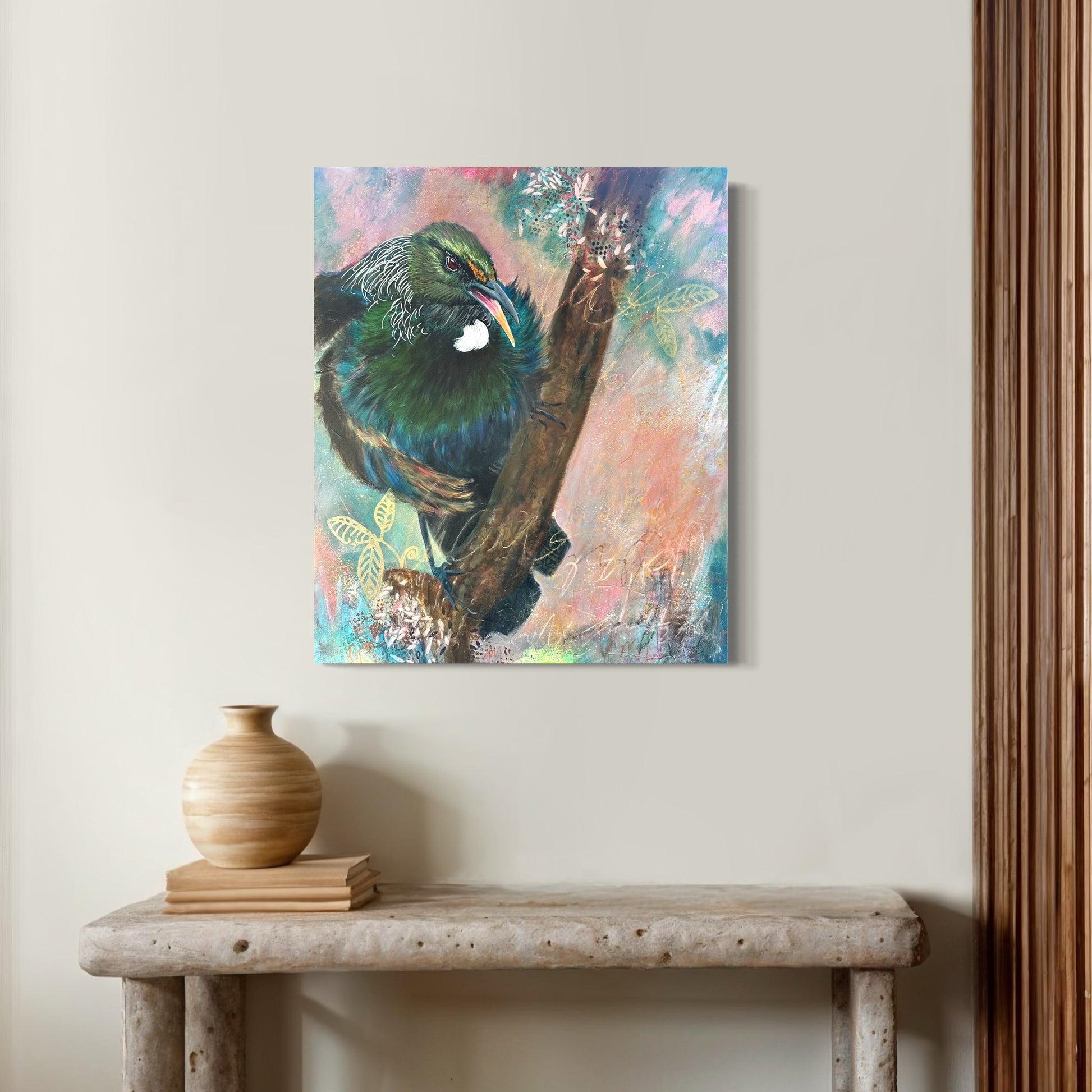 With a warrior’s cry and an unshakable stance, Braveheart Tui embodies the essence of courage and conviction. Perched with fierce determination, this tūī is a symbol of resilience, calling forth the strength to stand unwavering in the face of life’s battles. The rich iridescent blues and greens of its plumage shimmer with an almost ethereal energy, while the background hints at the unseen forces that guide and empower us.