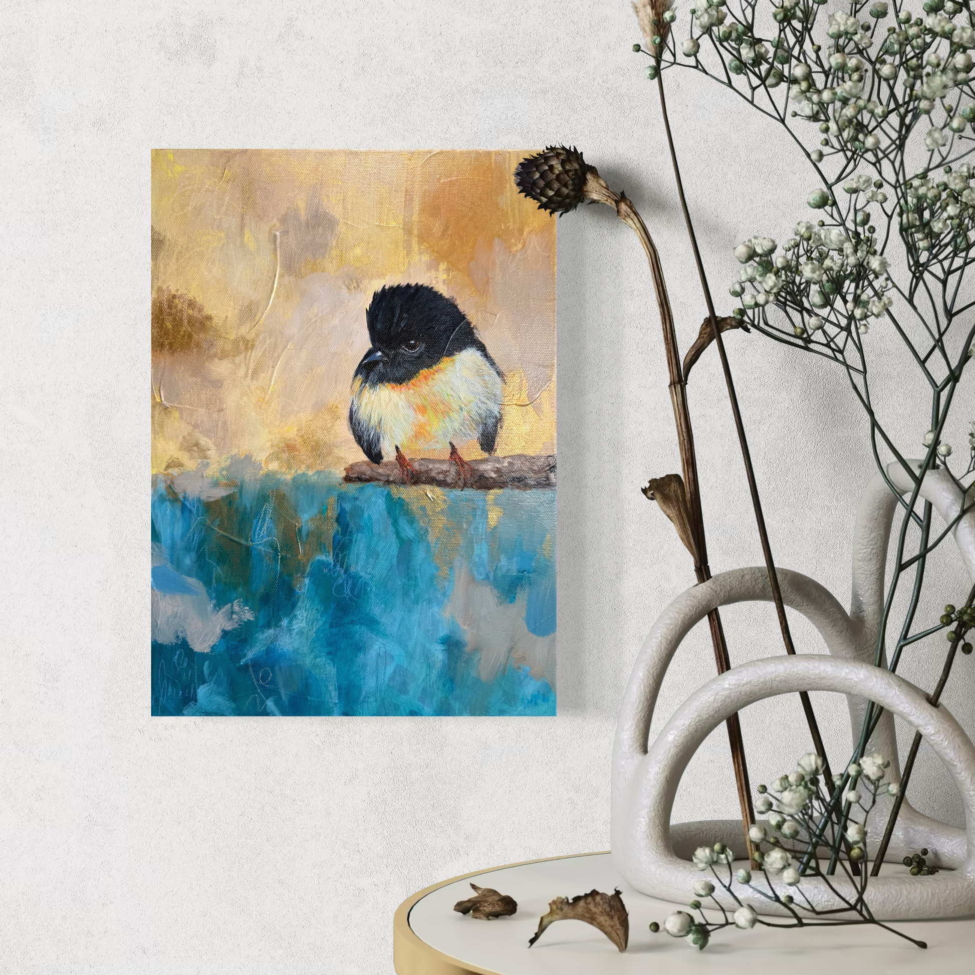 With a wild crest of feathers and an intense gaze, this little tomtit appears as if it has weathered the fiercest of storms. Yet, beneath it, the deep blues of water reflect back a sense of peace—proof that the waves have settled, and calmer seas lie ahead.