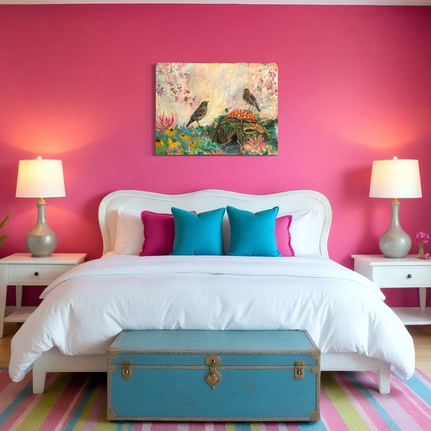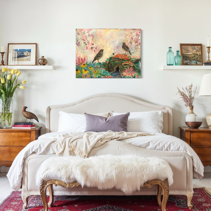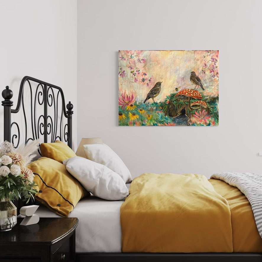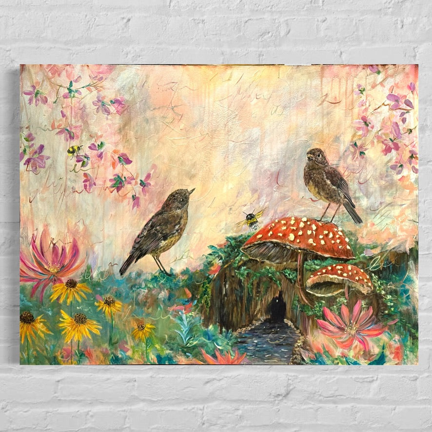 Beneath candy-coloured blooms and soft golden light, two North Island robins (toutouwai) stand watch at the edge of a mossy mushroom cave - a portal to somewhere magical. The stream winds inward, drawing you toward the unknown, while bees hover like gentle guardians of a secret world.