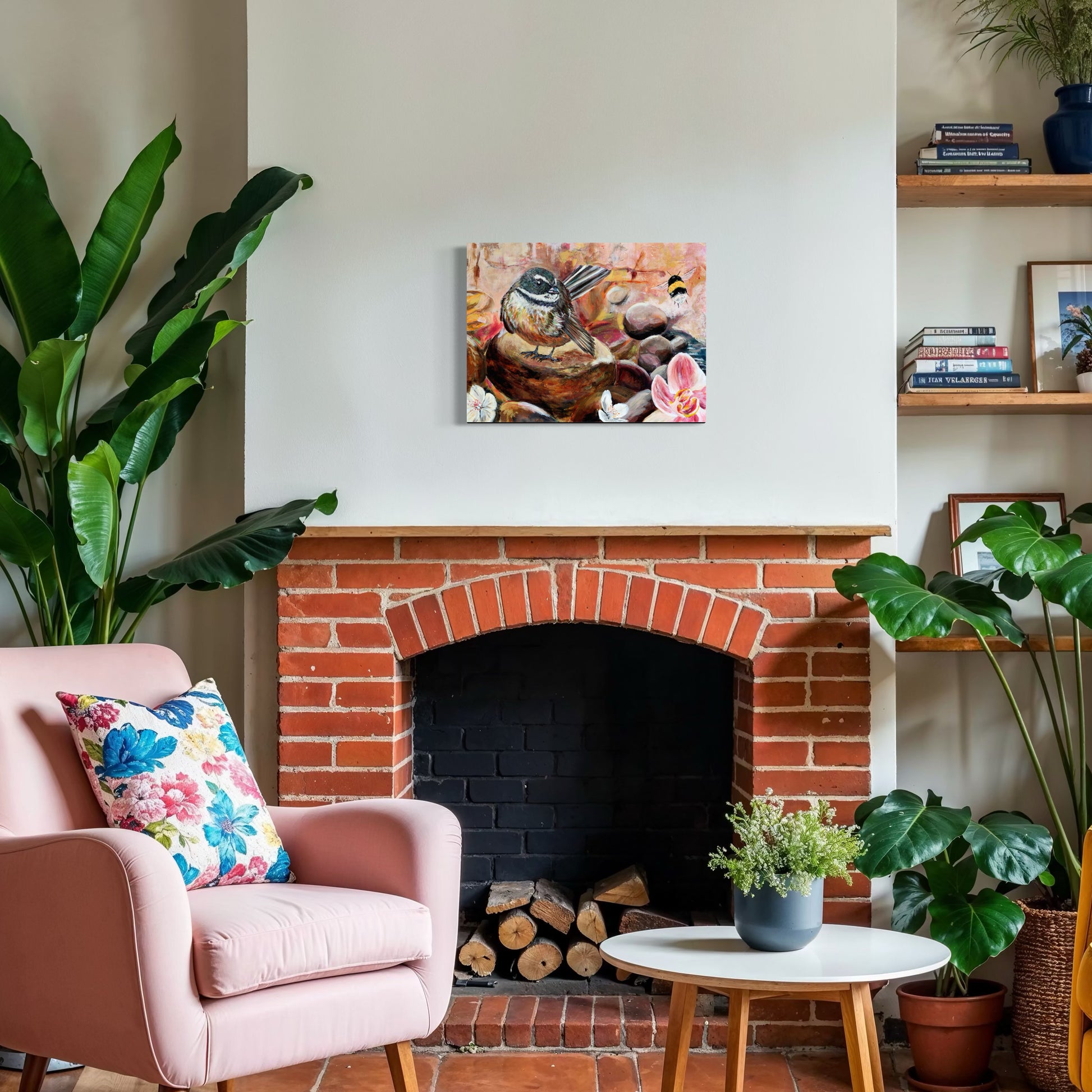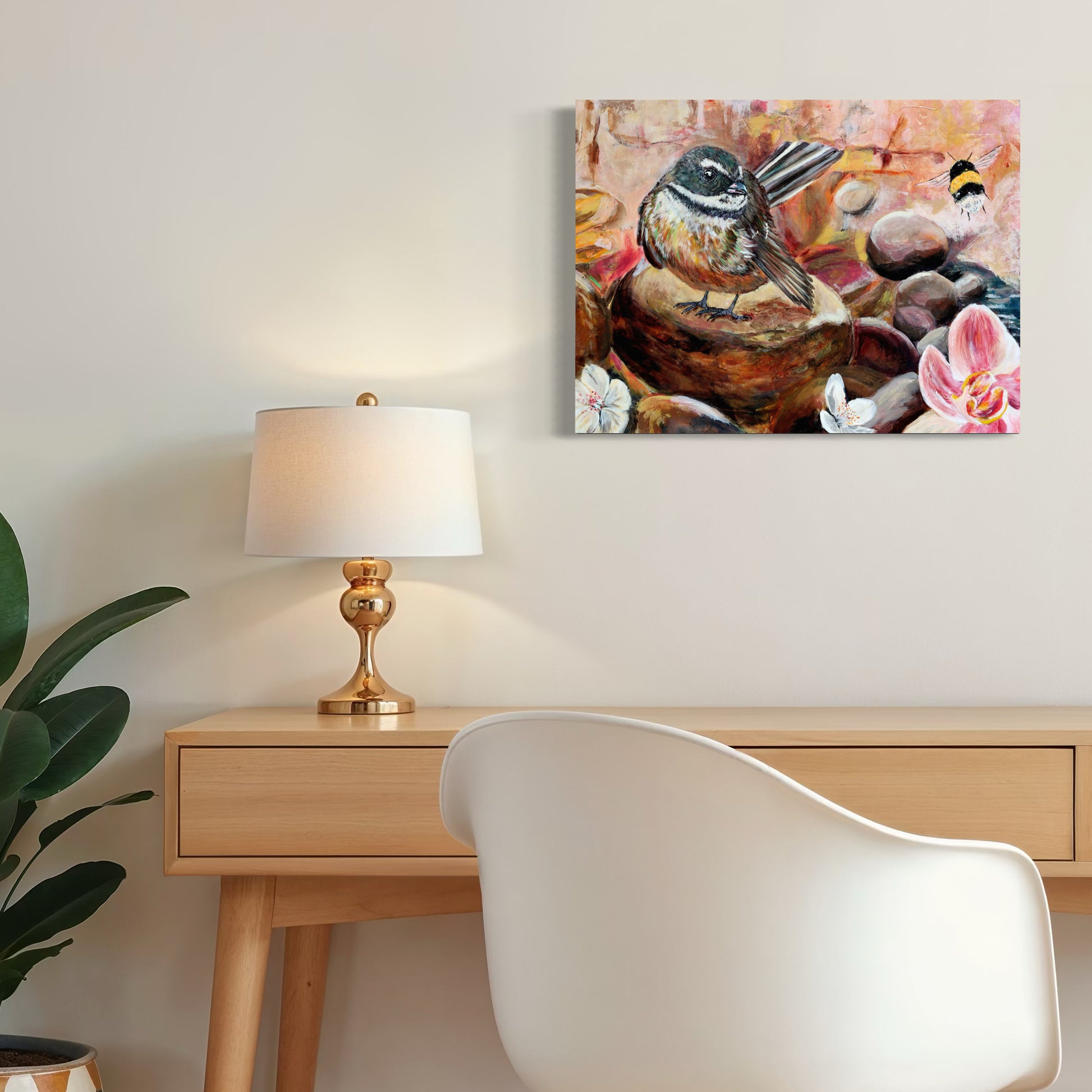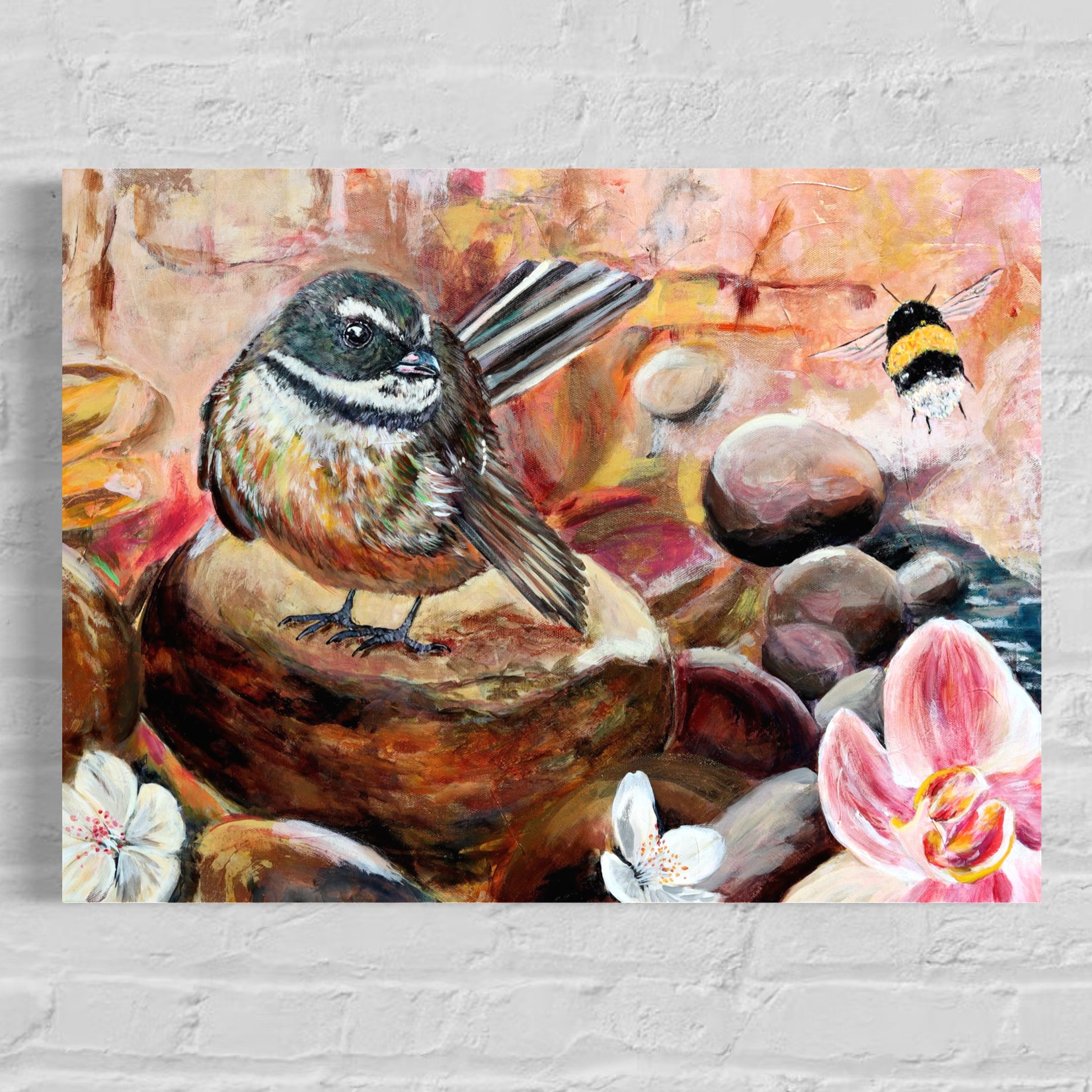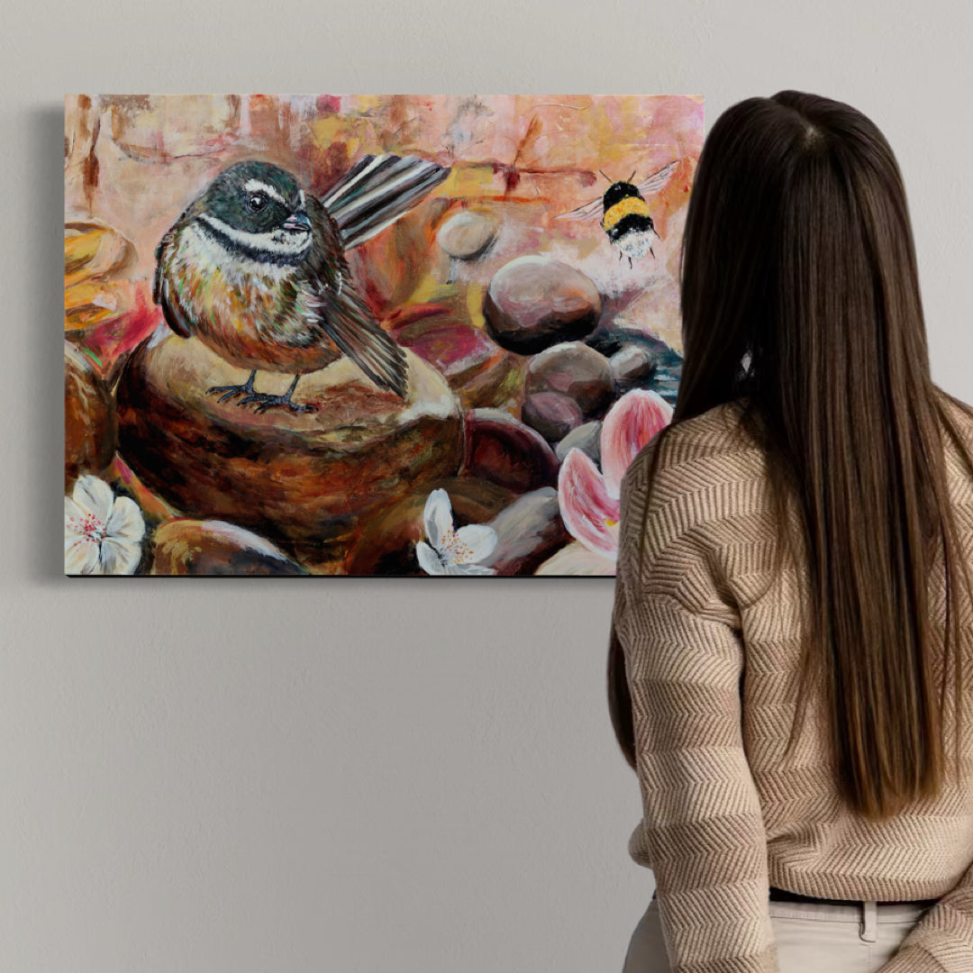 Soft Surrender is about ease - that quiet strength found in letting go. The piwakawaka rests among golden stones and warm light, surrounded by the hum of life. The bee moves with purpose, the orchid blooms with quiet confidence, and she simply stays present - steady, calm, unhurried.