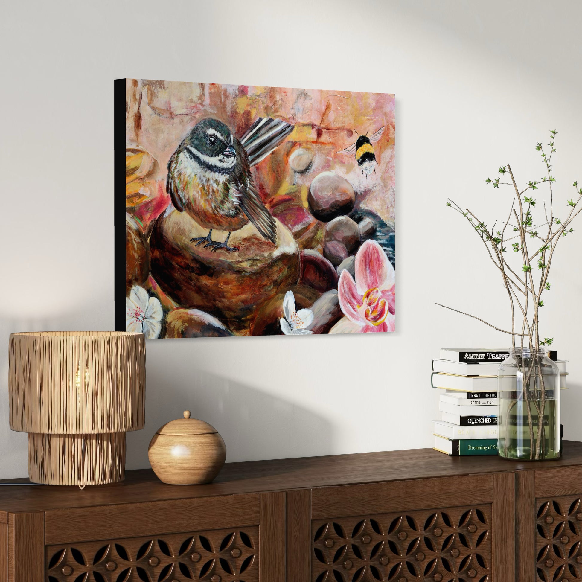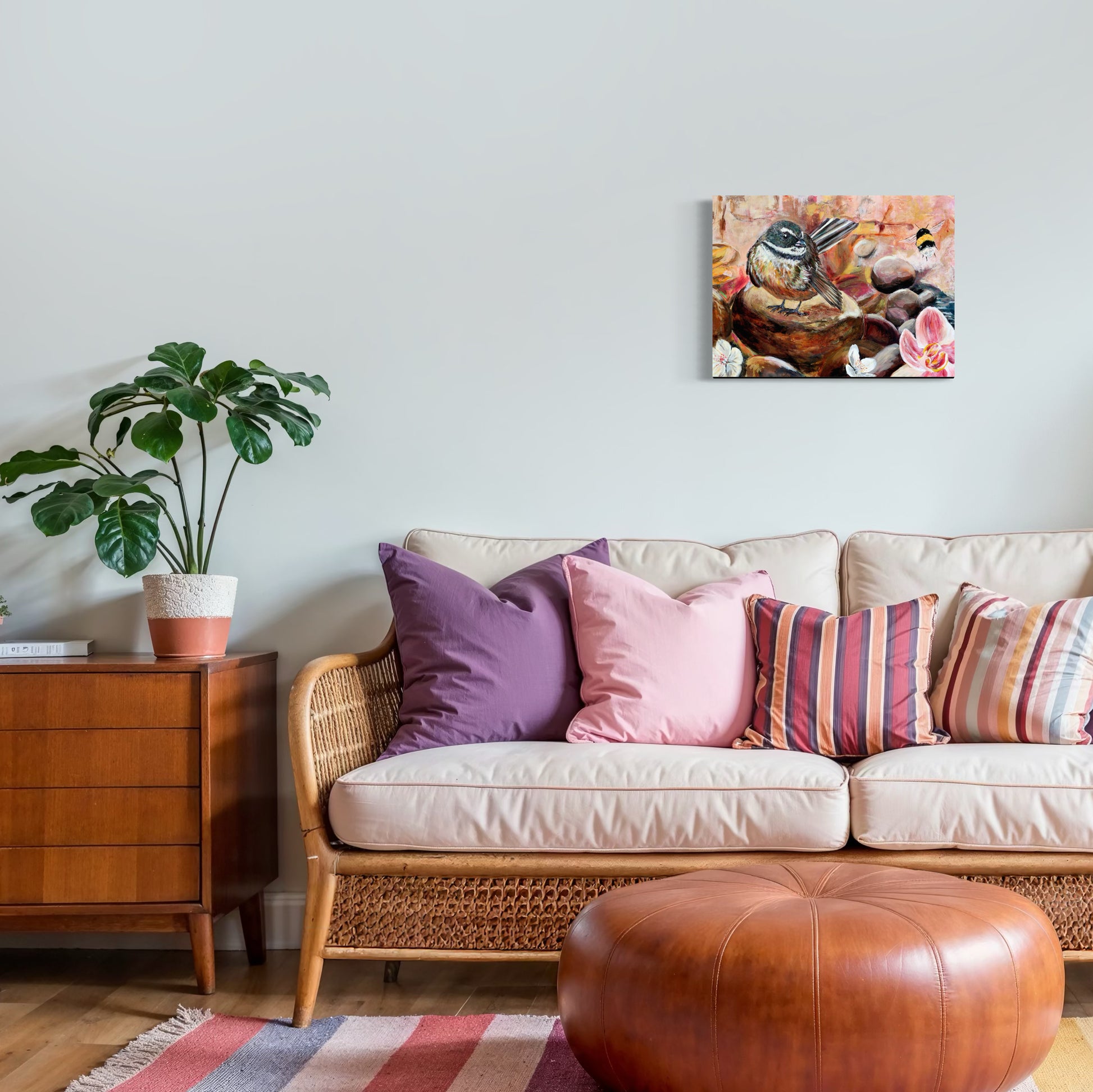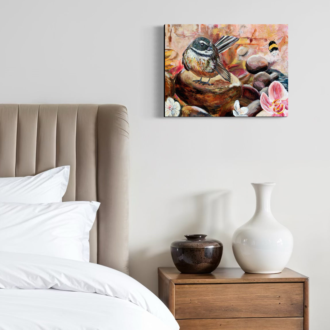 Soft Surrender is about ease - that quiet strength found in letting go. The piwakawaka rests among golden stones and warm light, surrounded by the hum of life. The bee moves with purpose, the orchid blooms with quiet confidence, and she simply stays present - steady, calm, unhurried.