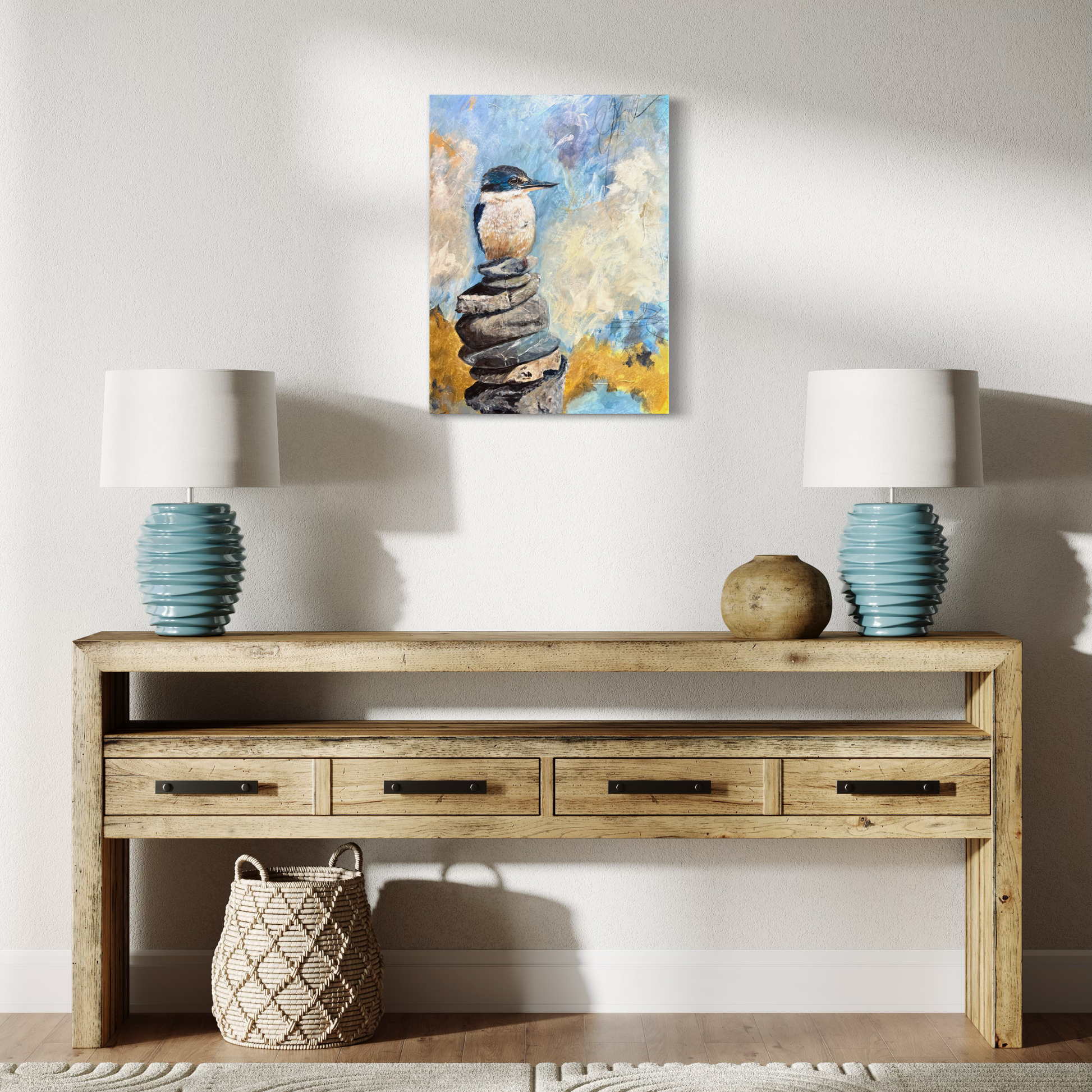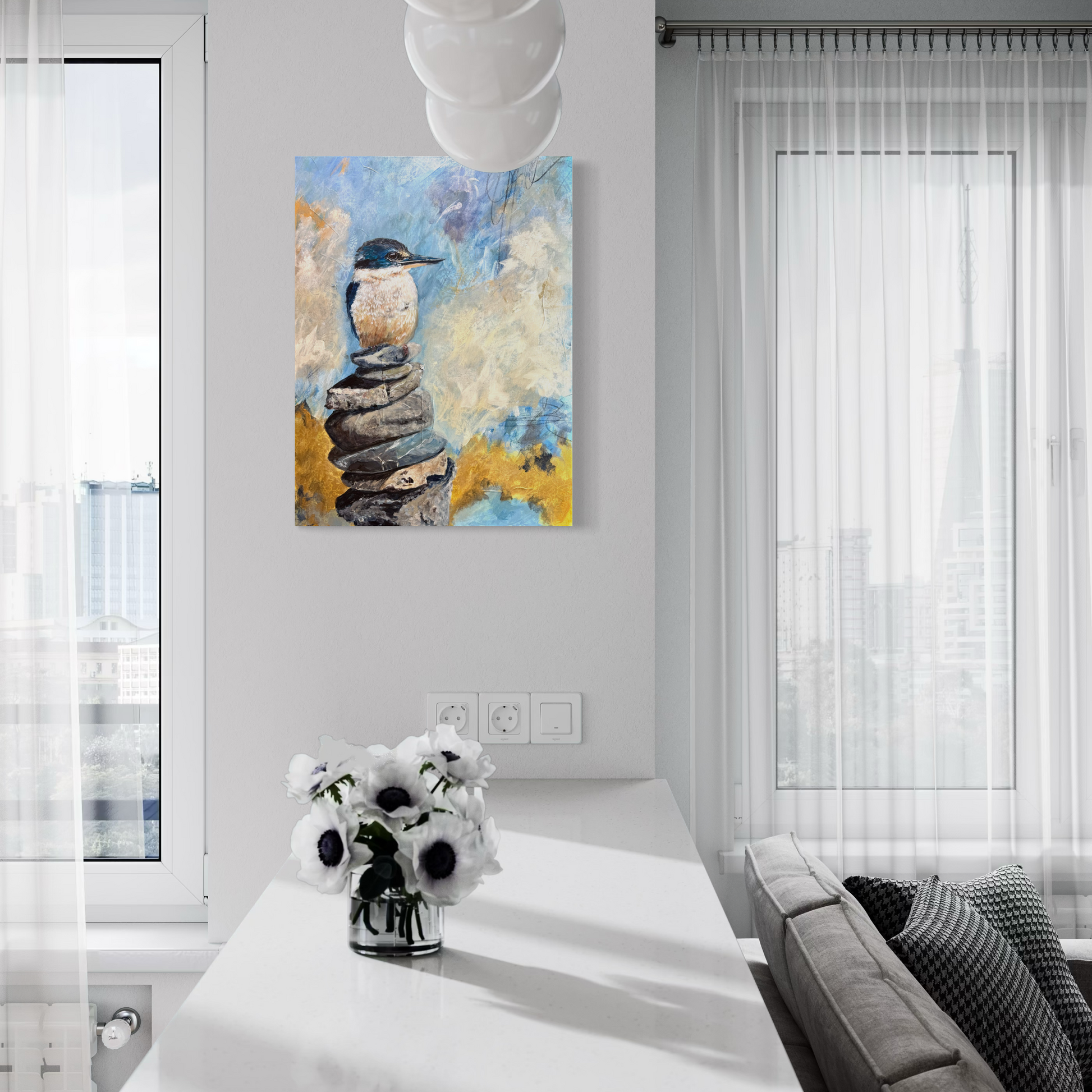 The kingfisher, perched atop a tower of carefully stacked stones, embodies this knowing. It does not rush. It does not falter. It waits until the wind whispers the right moment to take flight. As I layered the deep blues, warm golds, and soft ethereal textures, I felt the quiet strength of this scene, a reminder that true power comes not from constant motion but from perfect alignment.