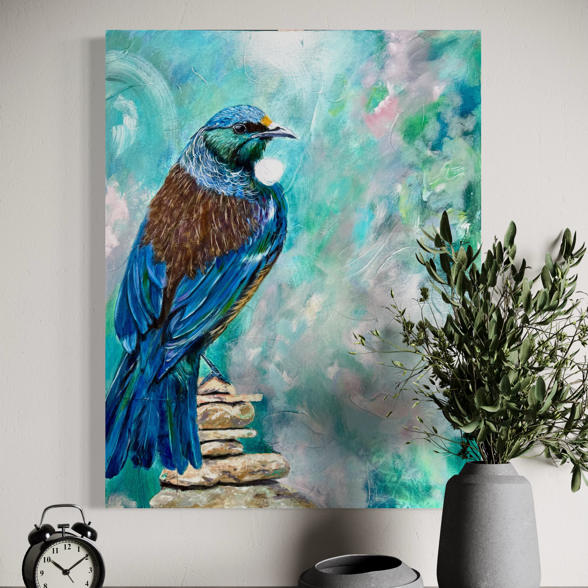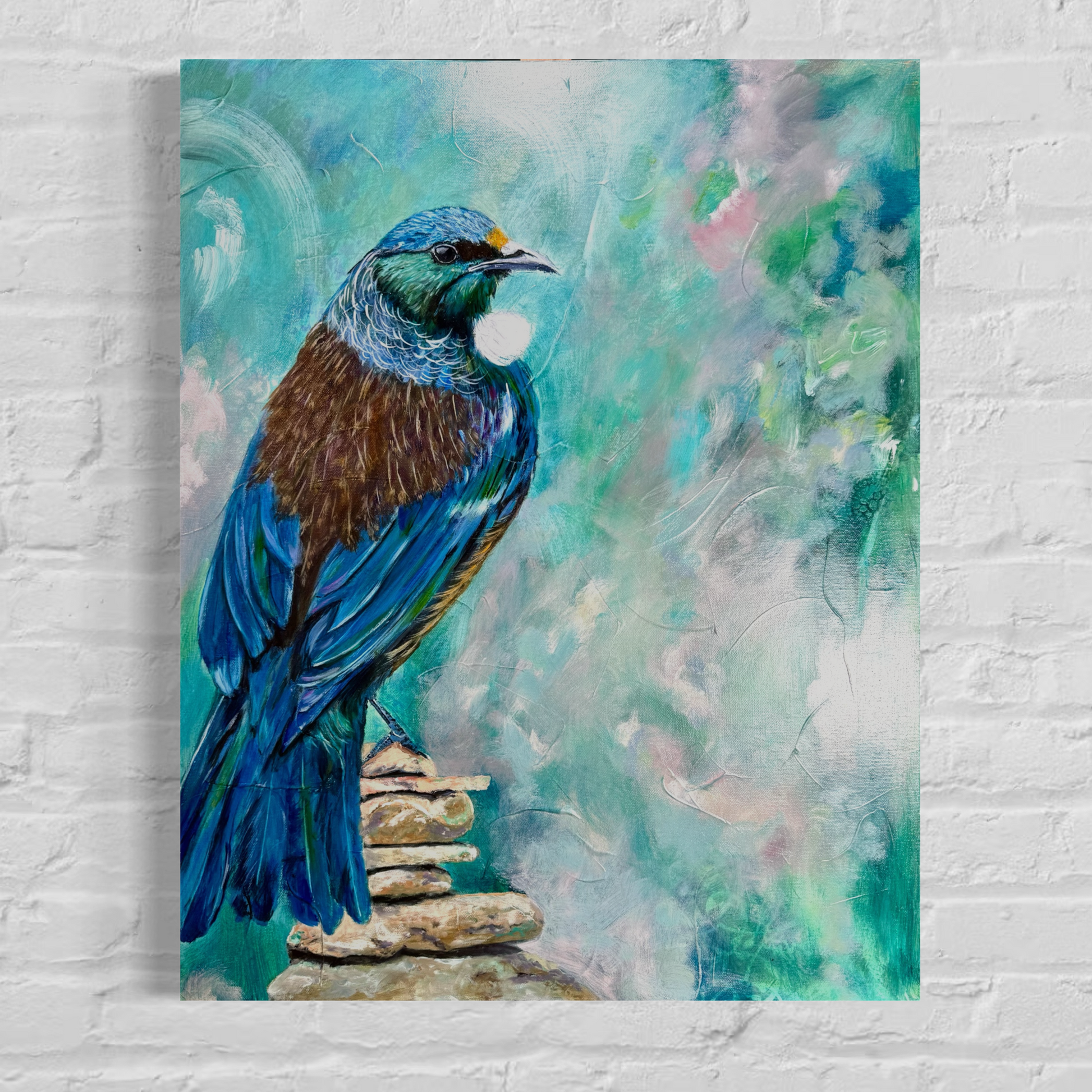 As I painted this piece, I felt the contrast of motion and stillness, of vibrancy and calm. The tūī, perched delicately atop a stack of stones, embodies the art of balance—not just physical, but spiritual. The soft, swirling greens and hints of ethereal light create a dreamlike backdrop, echoing the unseen energies that hold us steady when we choose to pause.