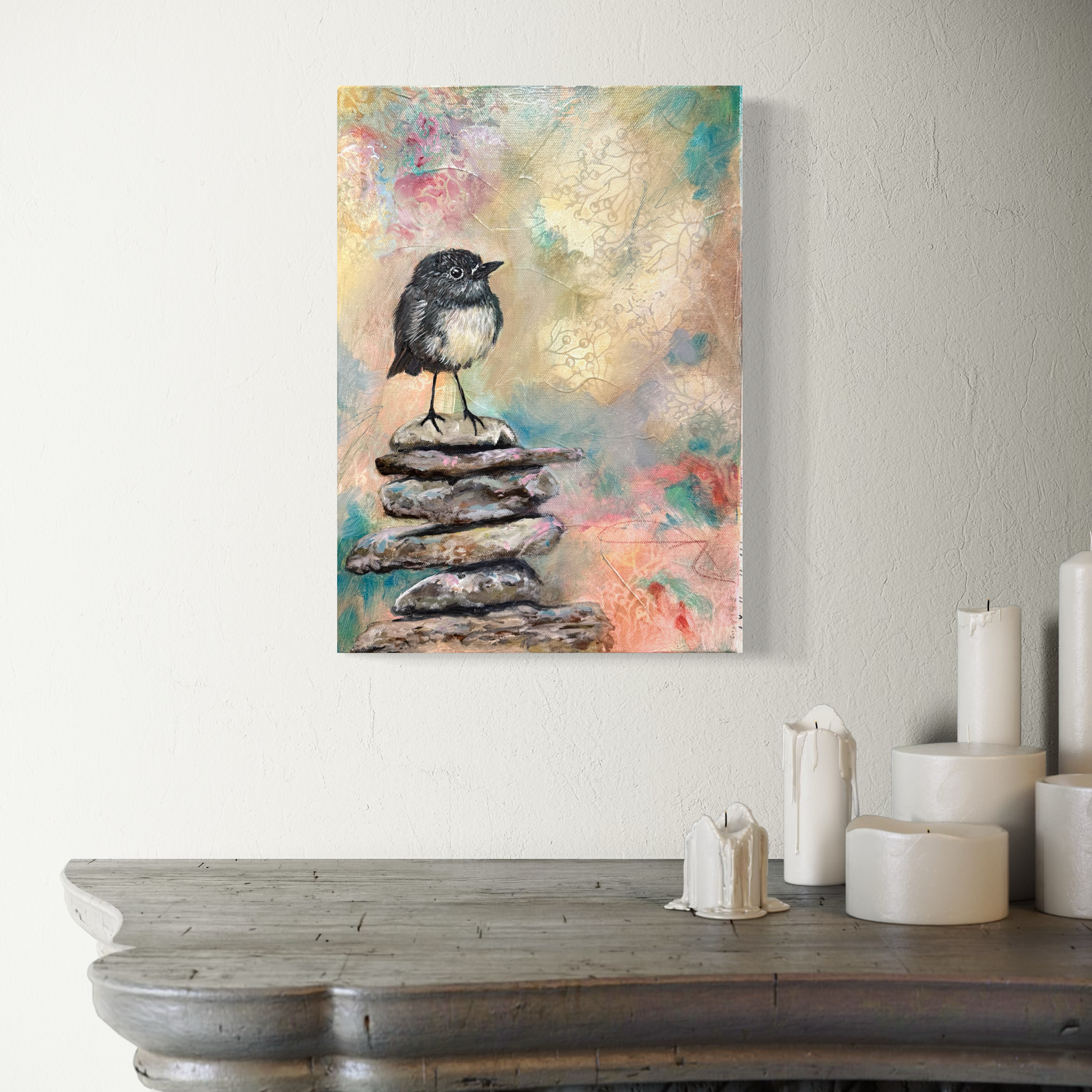 As I painted this piece, I was drawn to the contrast between energy and rest, movement and stillness. The soft yet vibrant colours reflect the robin’s lighthearted spirit, while the background whispers of unseen rhythms that guide us back to centre. This little bird reminds us that joy isn’t just found in movement—it also lives in the gentle spaces in between, the moments where we breathe, reset, and prepare for what comes next.