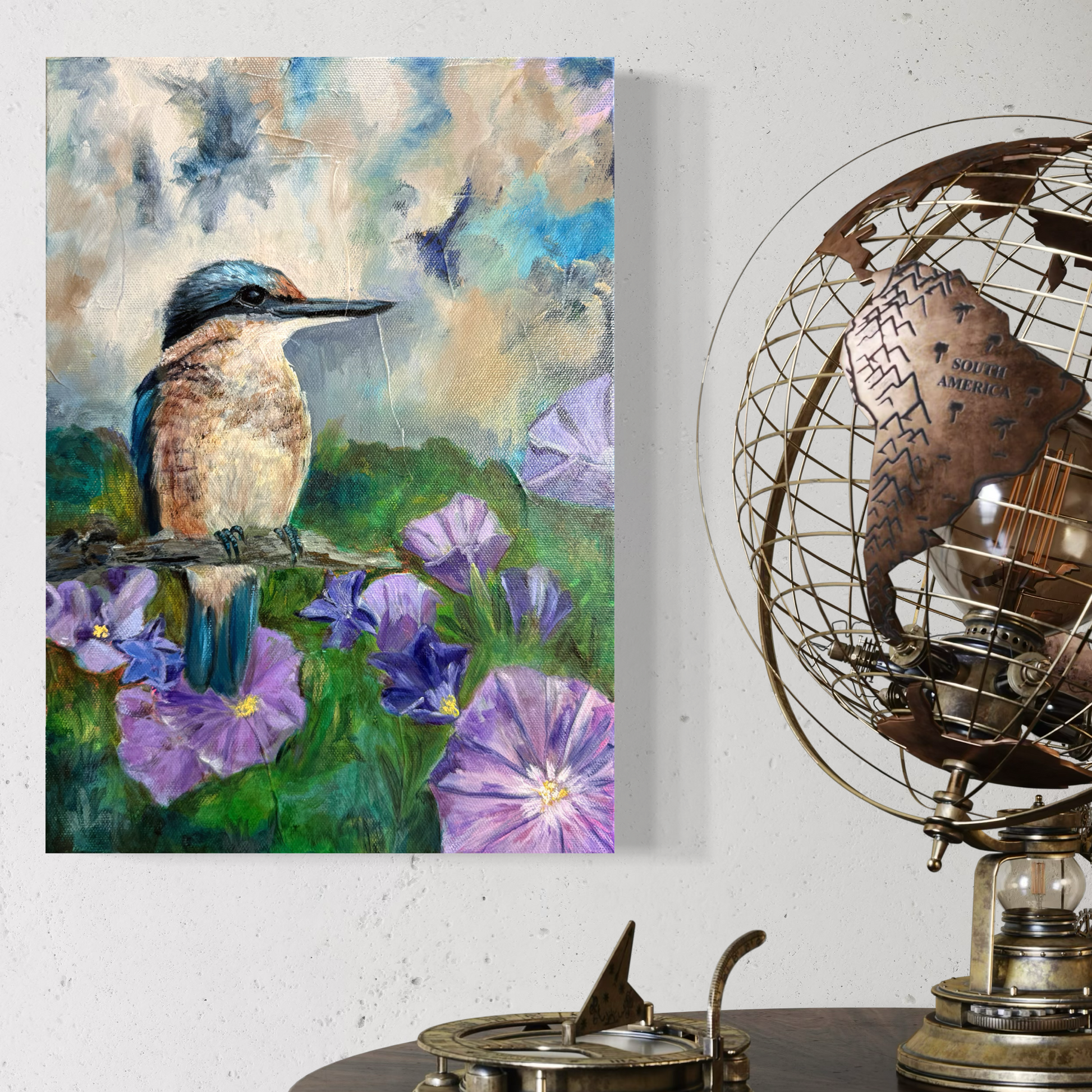 Perched with unwavering focus, the sacred kingfisher (kōtare) surveys its world, undeterred by the darkened sky above. Abstract storm clouds may gather, but they do not define him—his purpose is clear, his vision sharp. He is a symbol of resilience, of moving forward with confidence even when the path is uncertain.