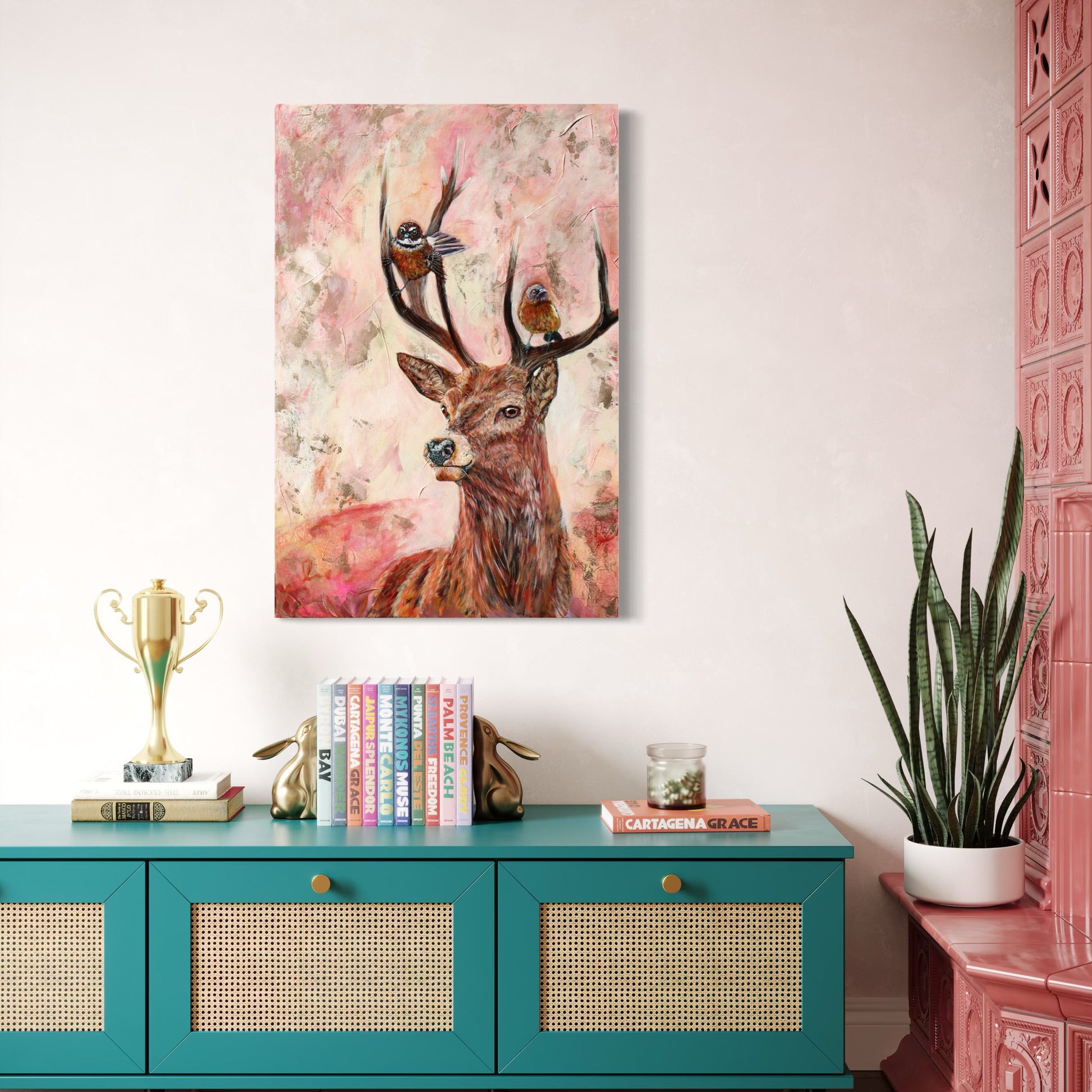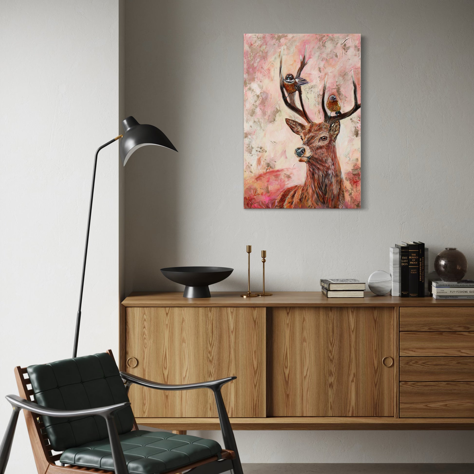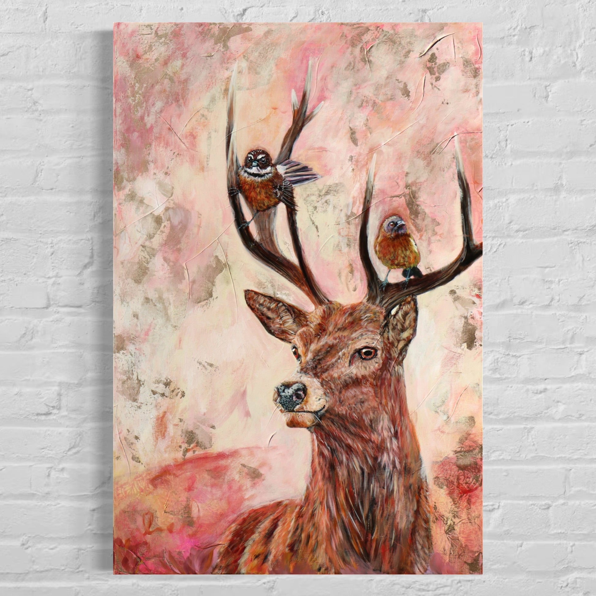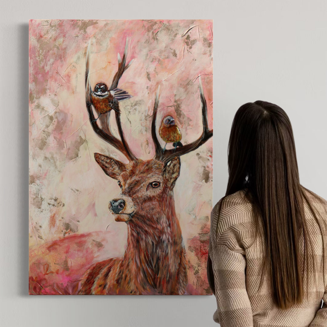 He Became Home captures that feeling in its purest form: a majestic stag, still and steady beneath the soft weight of two small native birds - the pīwakawaka and bellbird — who have chosen his antlers as their perch. Bathed in the soft warmth of golden hour, this unlikely gathering becomes a symbol of belonging beyond borders.
