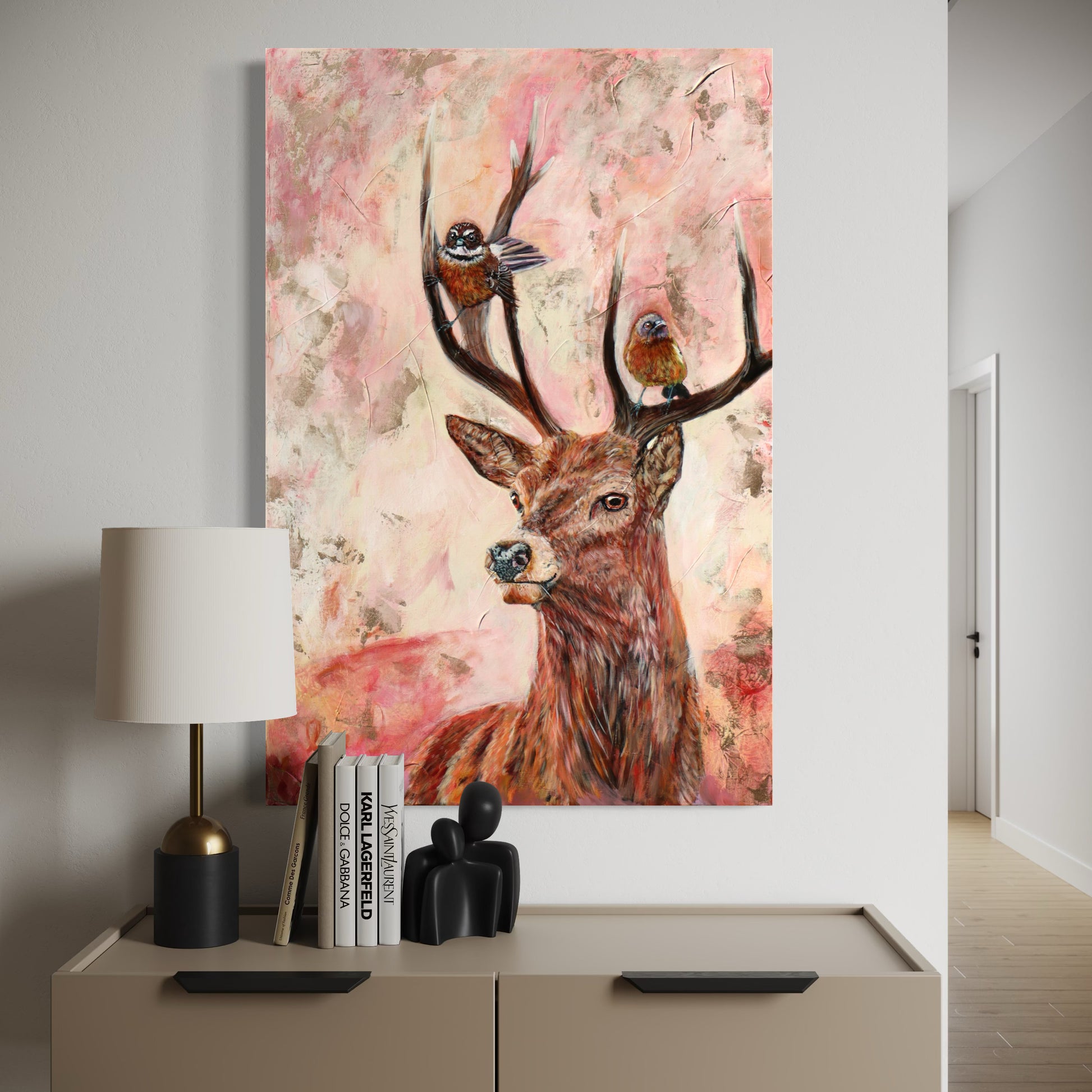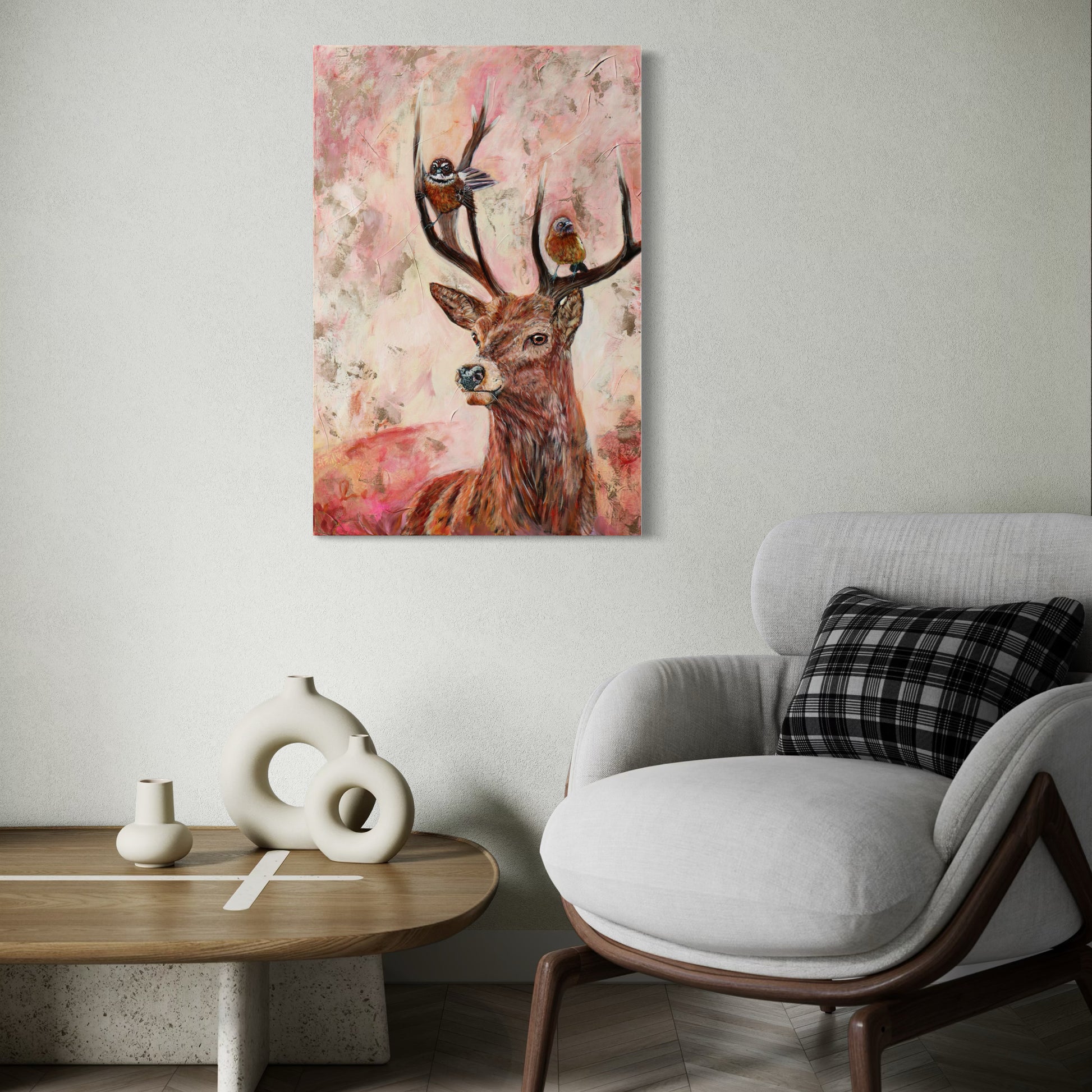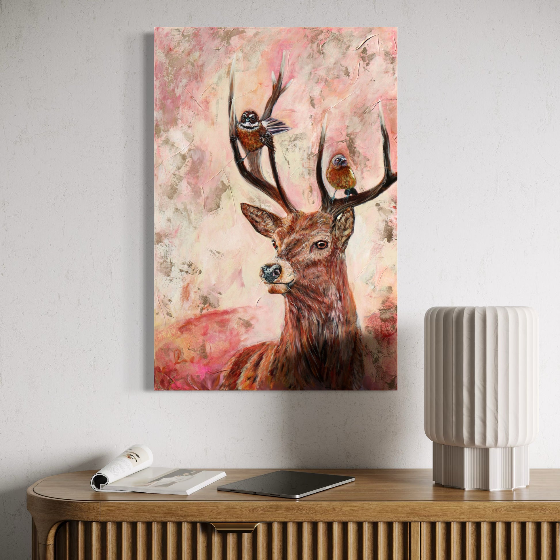 He Became Home captures that feeling in its purest form: a majestic stag, still and steady beneath the soft weight of two small native birds - the pīwakawaka and bellbird — who have chosen his antlers as their perch. Bathed in the soft warmth of golden hour, this unlikely gathering becomes a symbol of belonging beyond borders.