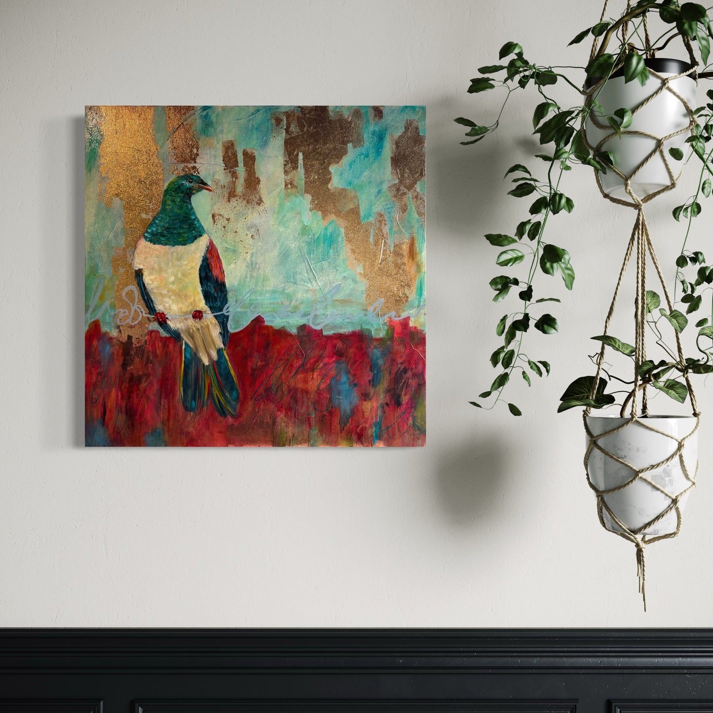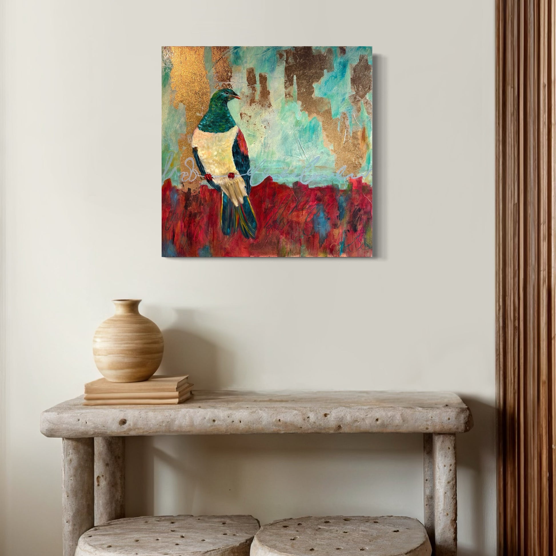 The luminous palette of rich greens, soft whites, deep reds, and golden highlights reflects the essence of the kererū as a guardian of balance in the natural and spiritual worlds. The interplay of textures and metallic gold evokes the ethereal connection between the earthly and the divine, a journey "above the line" into higher ethics and expanded consciousness.