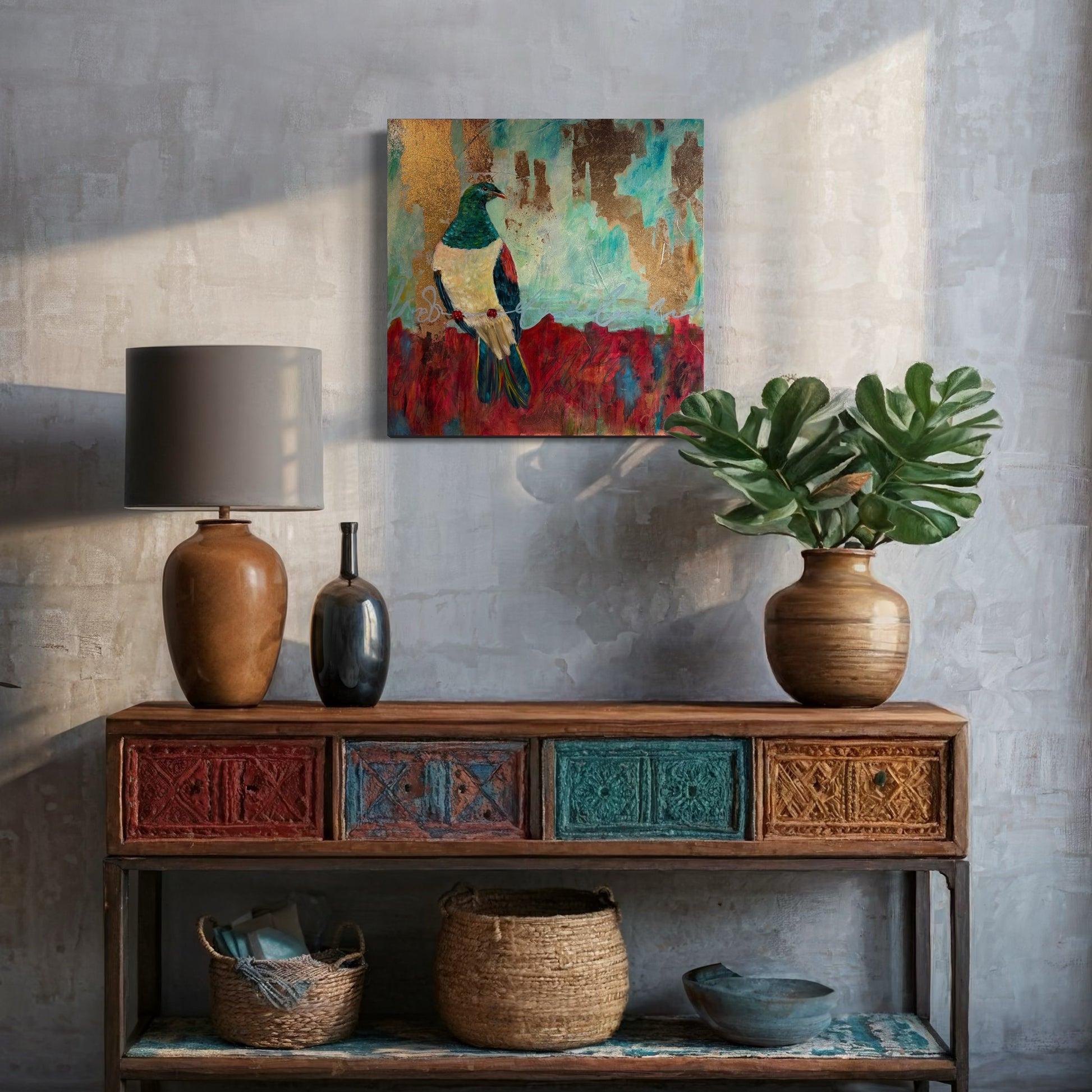 Whether for the corporate boardroom, where it inspires clarity and vision, or the heart of your home, where it fosters serenity and introspection, this painting resonates with those seeking beauty and meaning. Elevate your space with this timeless tribute to the kererū, a bird revered for its grace and symbolism.