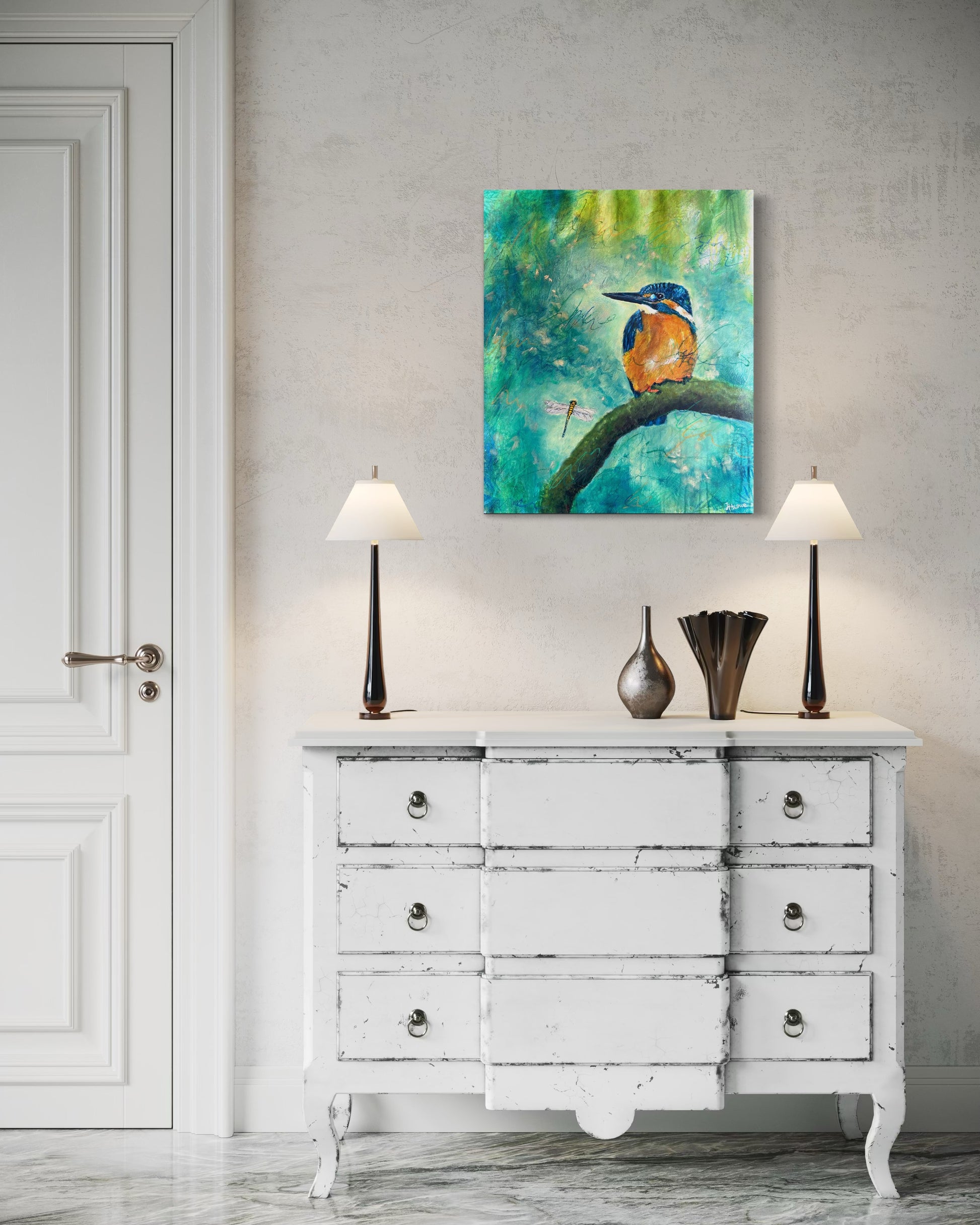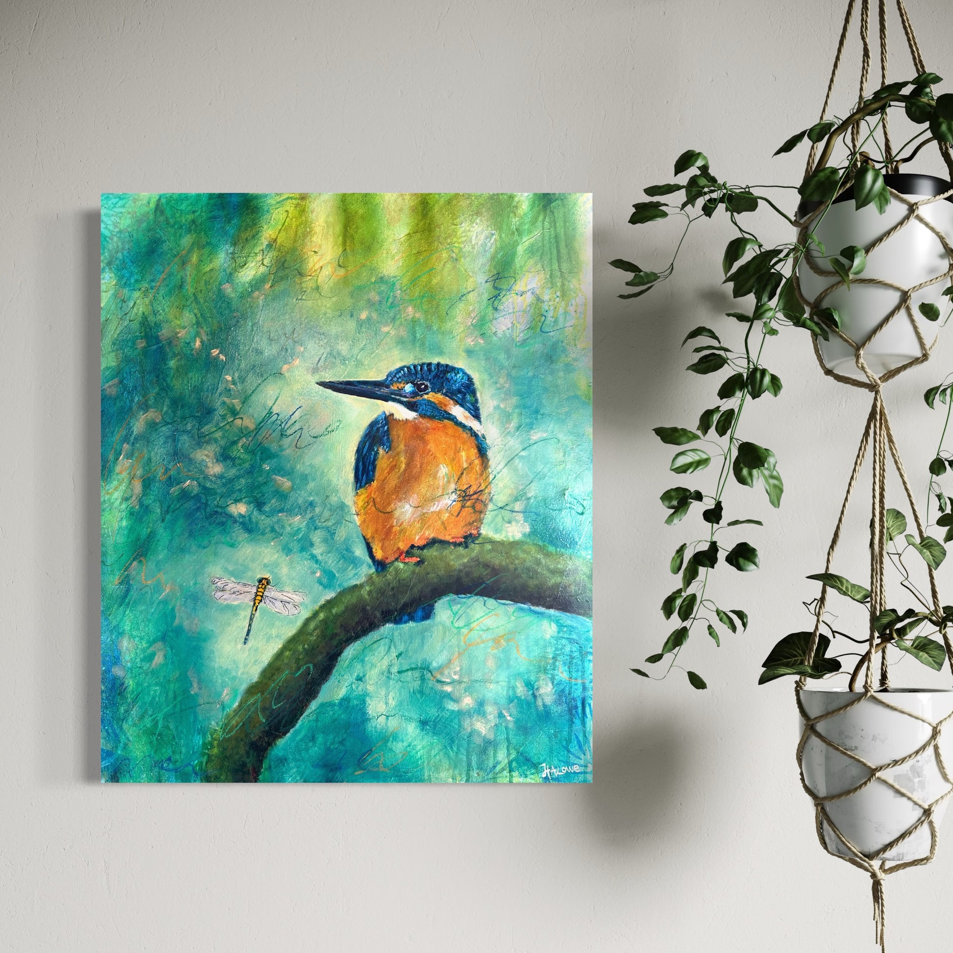 Perched in quiet reflection, the kingfisher gazes out over its world, taking in the beauty that surrounds it. In this moment of stillness, there is only peace—an awareness that life flows effortlessly, and all that is needed arrives in perfect timing. Nearby, a dragonfly hovers, its delicate wings catching the light, a symbol of transformation, adaptability, and the ever-changing nature of life.