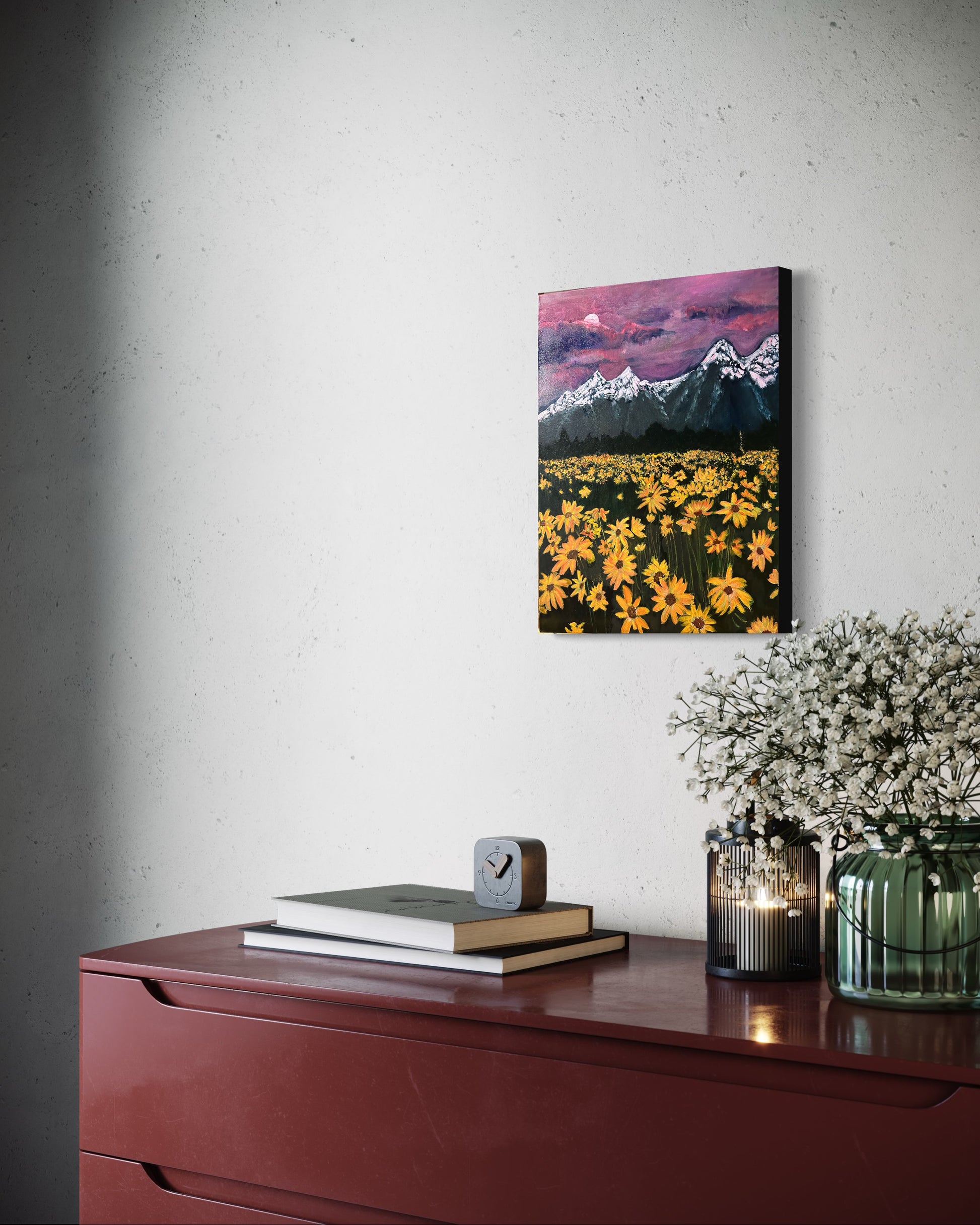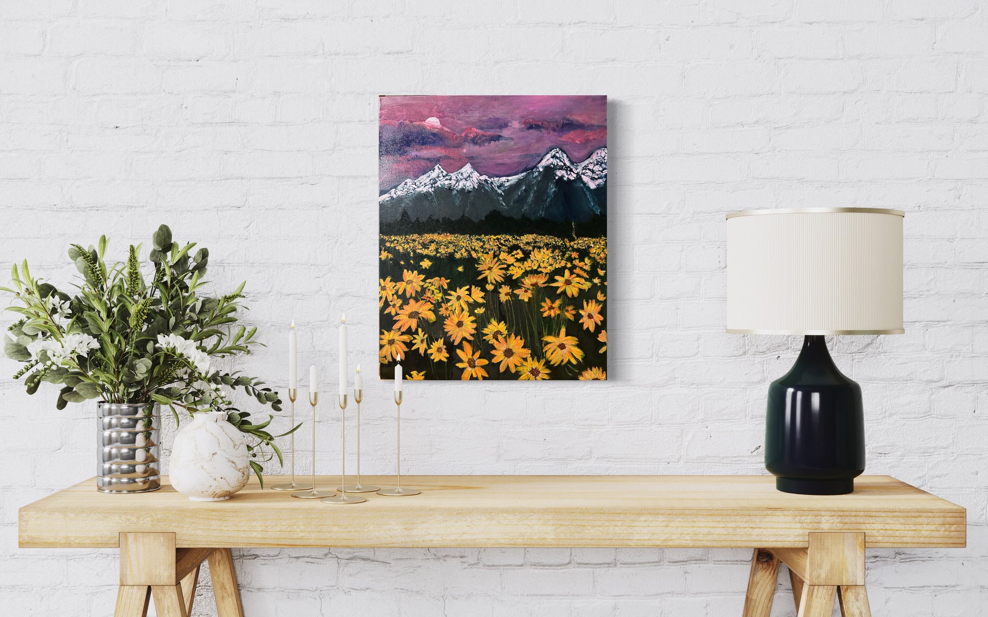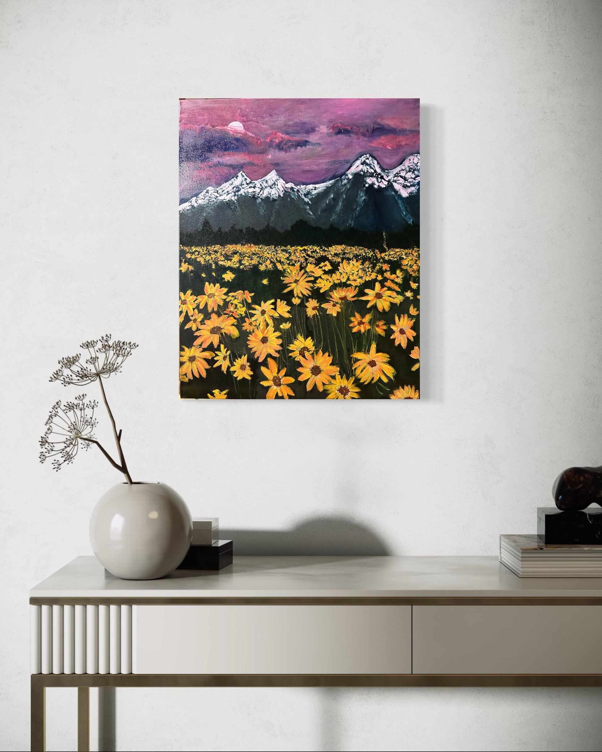 This artwork presents a stunning landscape rendered in glossy oils, where a pink sunset bathes the scene in a warm, serene glow. The sky transitions from soft pastels to deeper pinks as it meets the horizon, creating a gentle contrast against the rugged, snow-capped mountains that rise majestically in the background. In the foreground, bright yellow flowers stand out vividly, their petals catching the last light of day, adding a burst of colour and life to the scene. The reflective quality of the oils enhances the depth and richness of the landscape, making it a captivating and immersive experience.