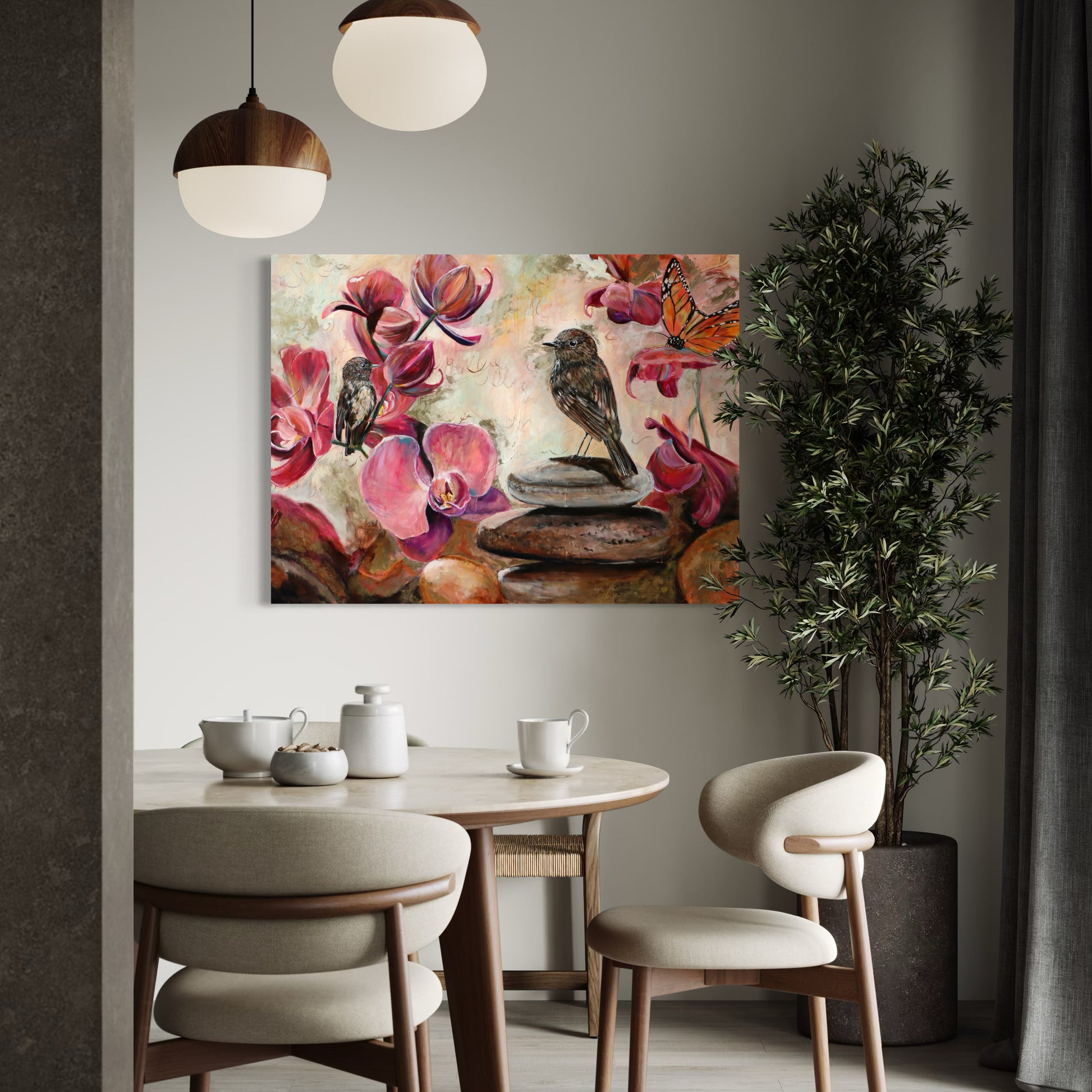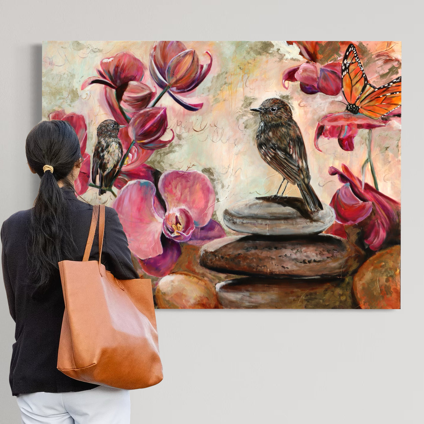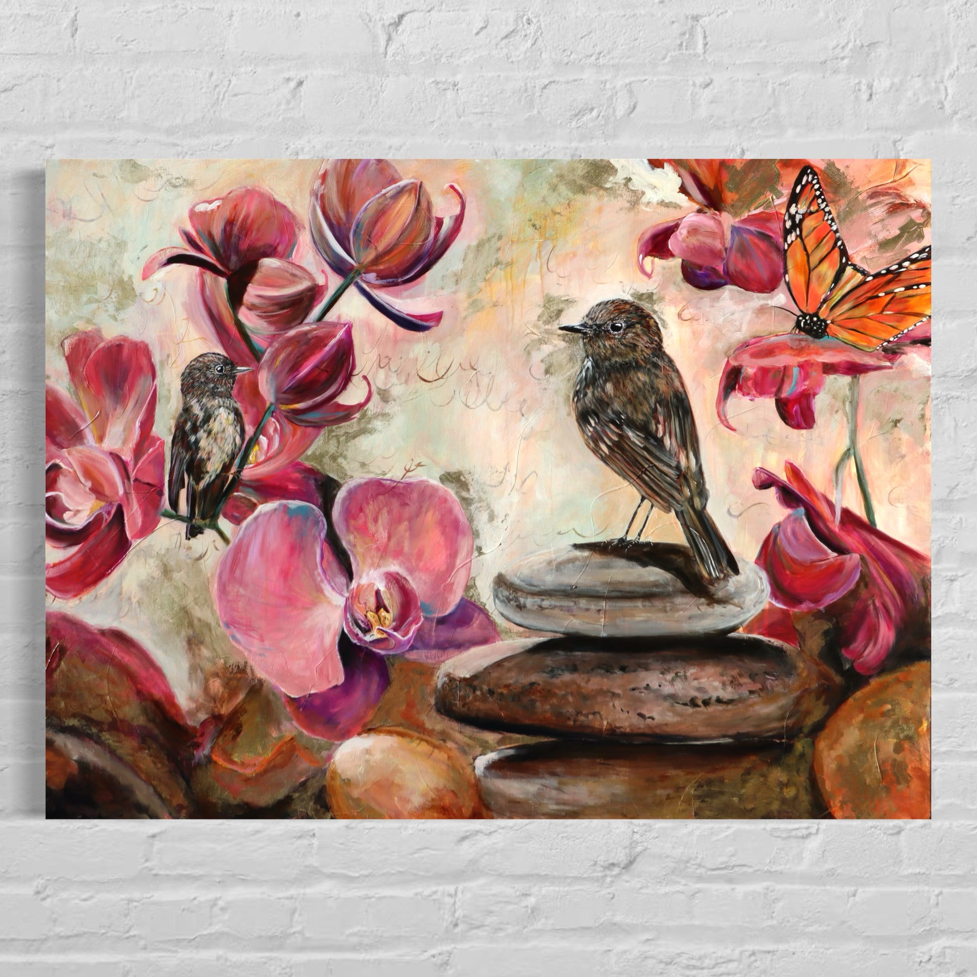 Cradled by vibrant orchids and the warm grounding of river stones, two North Island Robins rest and observe - one already perched in quiet confidence, the other preparing to land. A monarch butterfly hovers like a whisper of transformation, hinting at the magic that stirs when we dare to follow the heat of our own becoming.