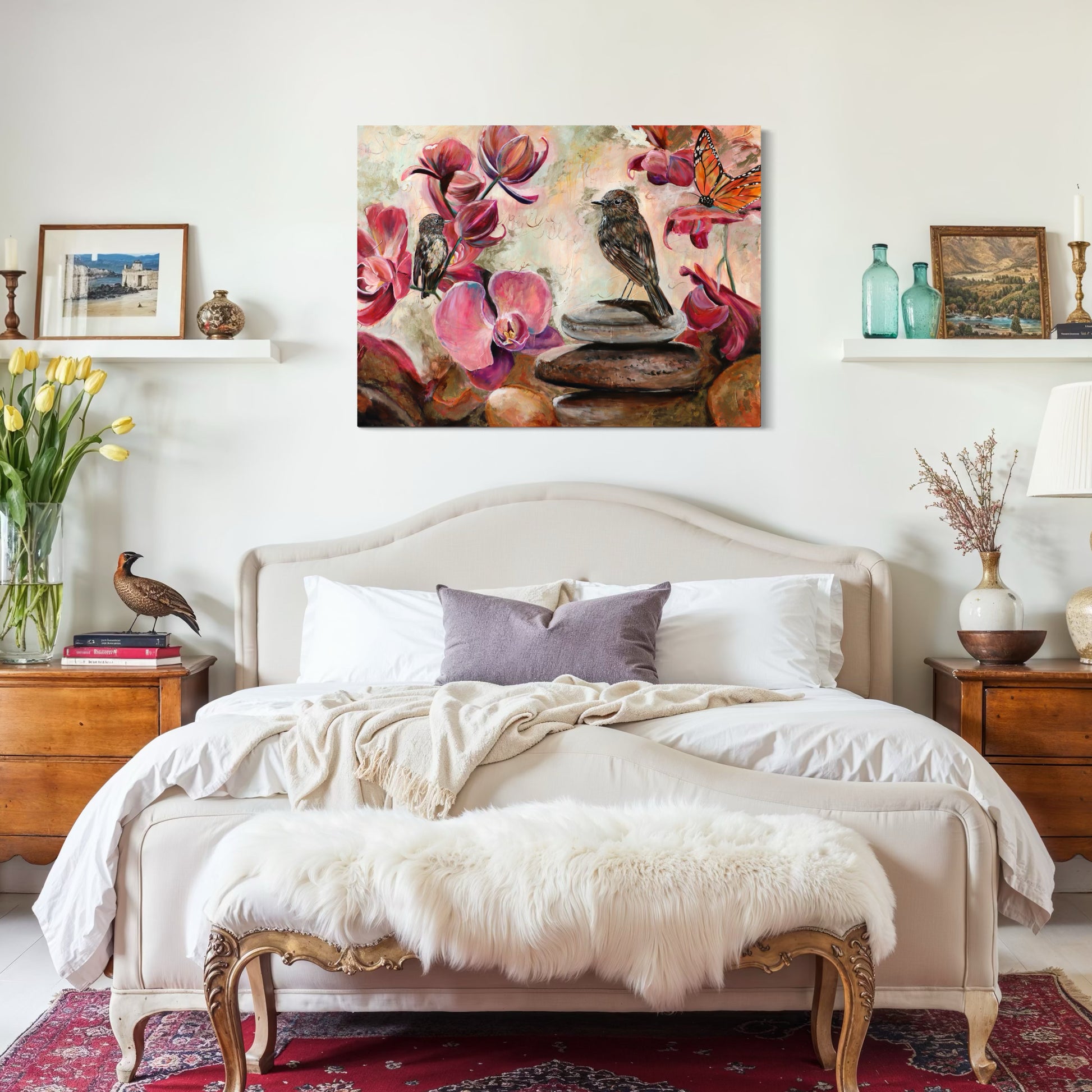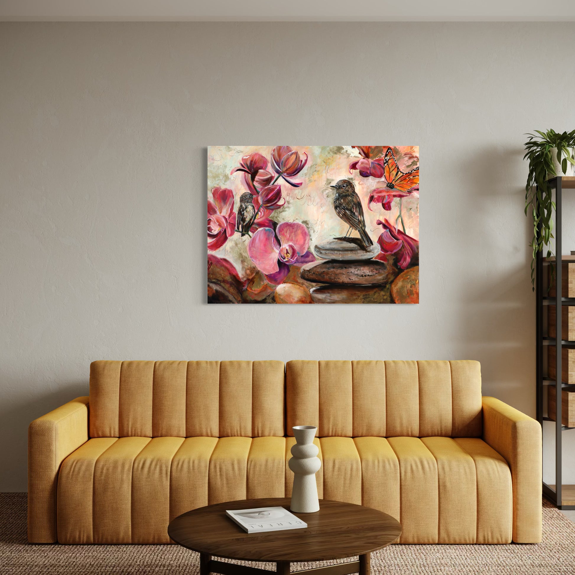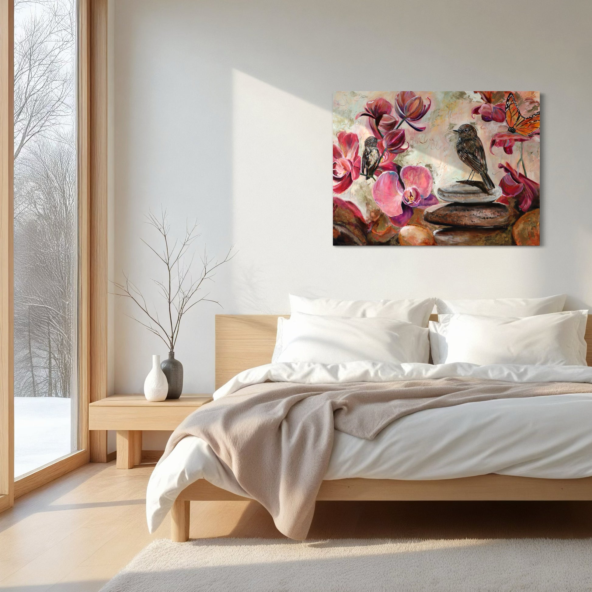 Cradled by vibrant orchids and the warm grounding of river stones, two North Island Robins rest and observe - one already perched in quiet confidence, the other preparing to land. A monarch butterfly hovers like a whisper of transformation, hinting at the magic that stirs when we dare to follow the heat of our own becoming.