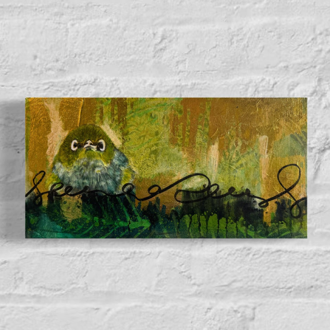 Set against a textured backdrop of lush greens and shimmering gold, the artwork evokes the vitality of the forest and the lightness of spirit the waxeye brings. The green tones symbolise growth, renewal, and harmony with nature, while the gold accents add a touch of magic, reflecting enlightenment and abundance.