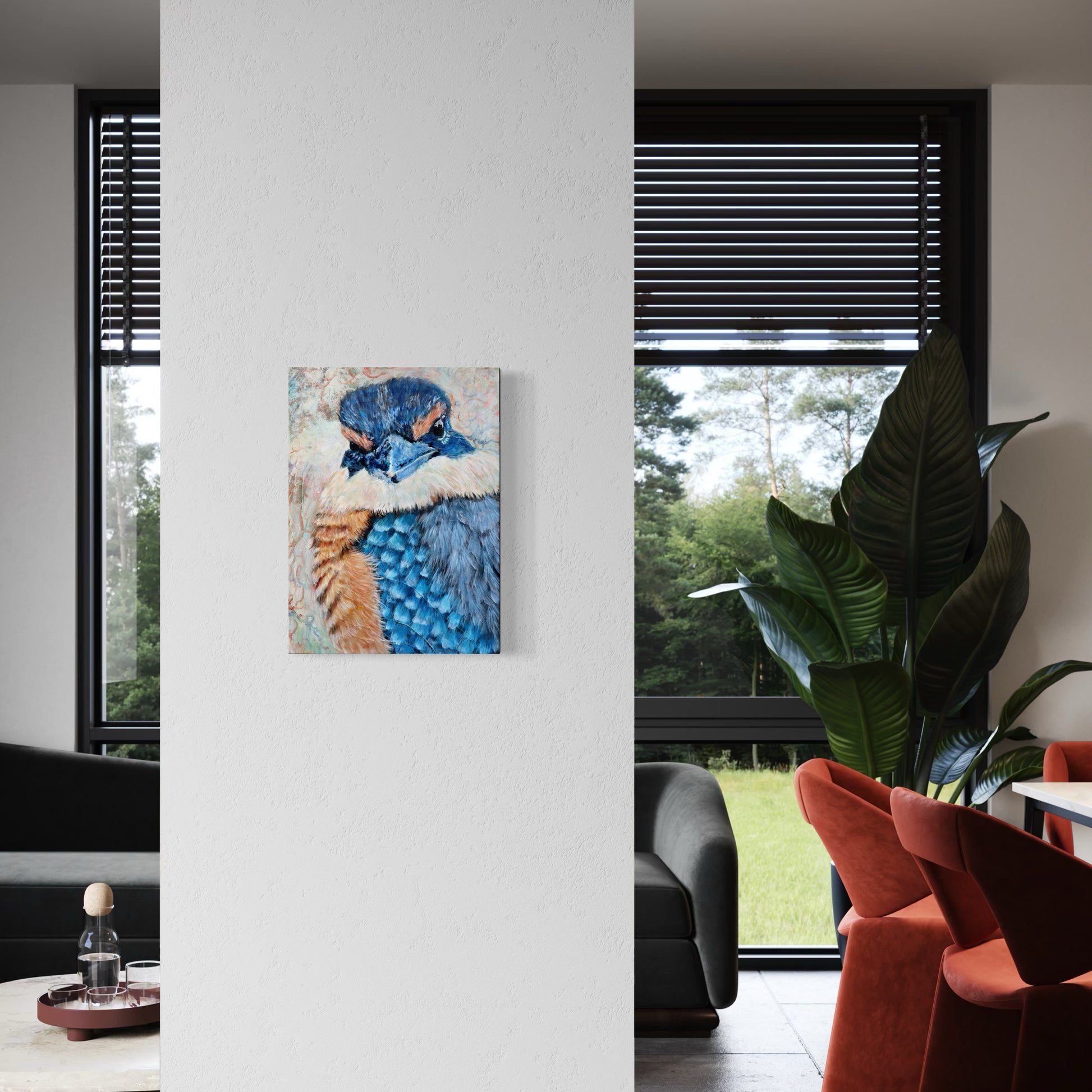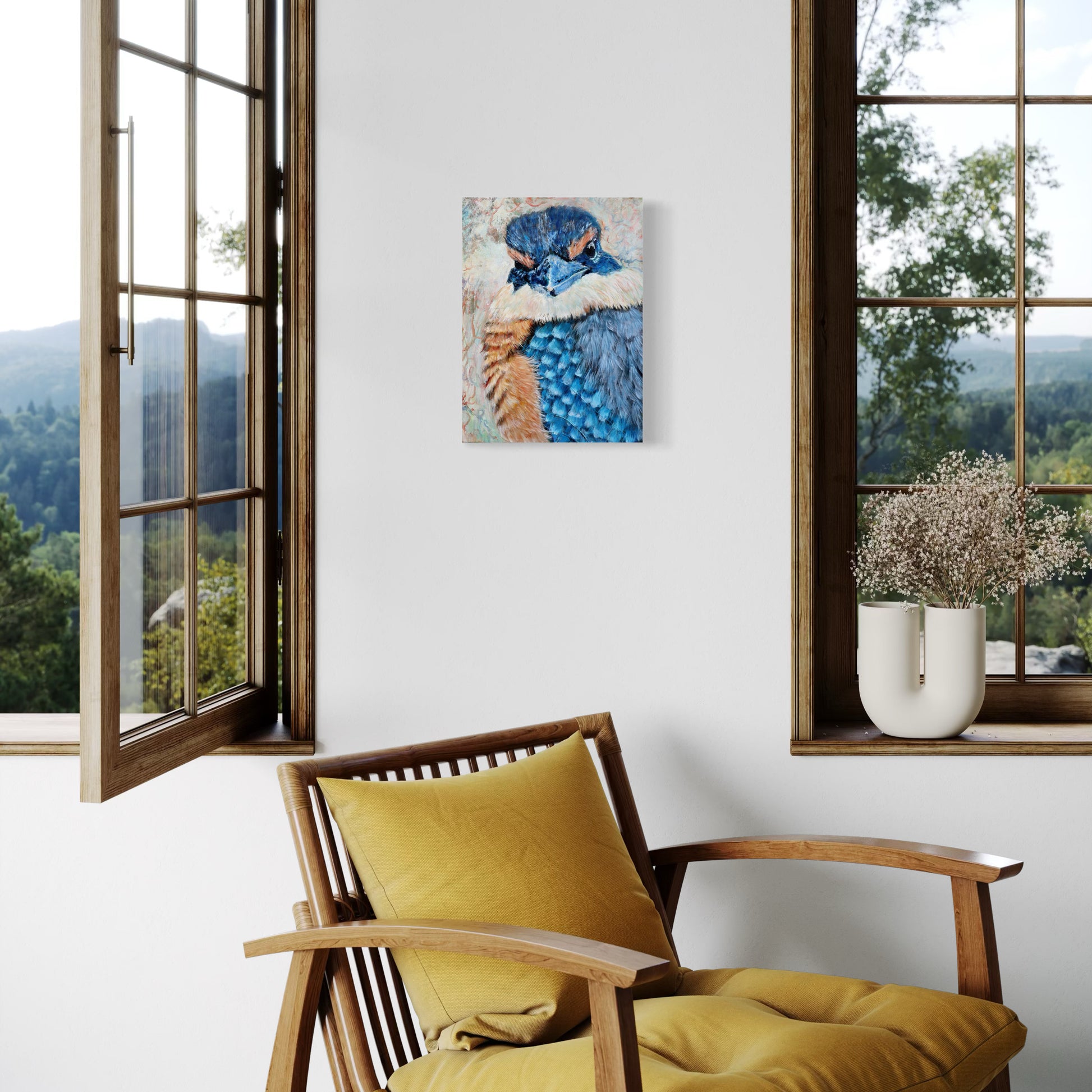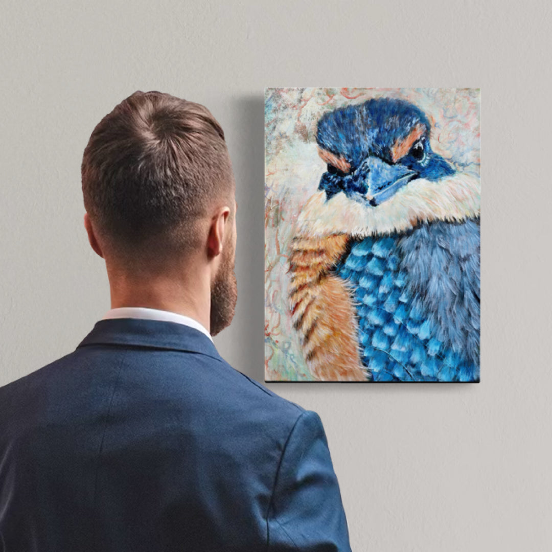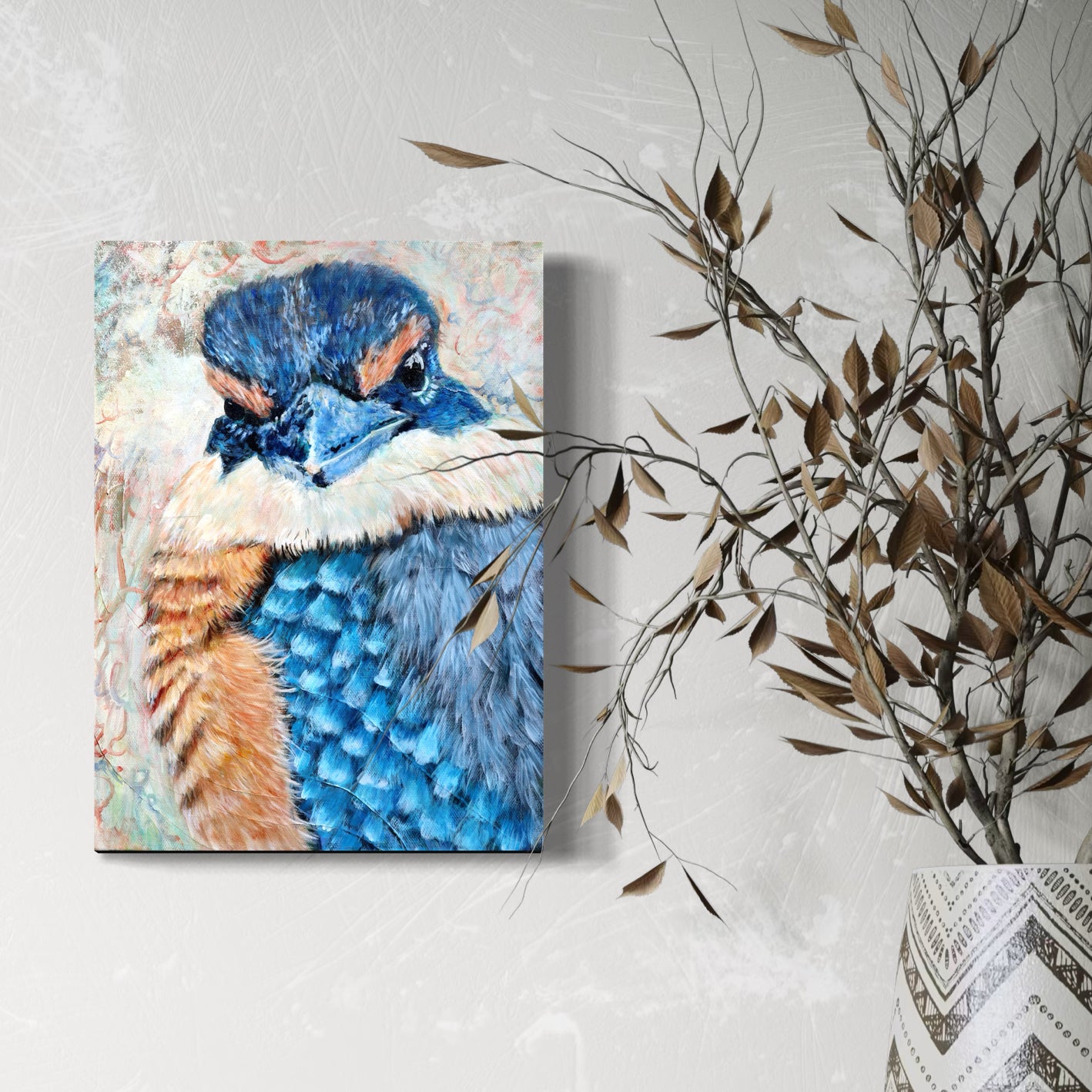 There’s a quiet authority in The Magistrate. With eyes that see far beyond the obvious, this kotare/NZ kingfisher carries the energy of clear sight, discernment, and unapologetic truth. He perches above the noise, steady and sure, weighing what truly matters before striking with precision.
