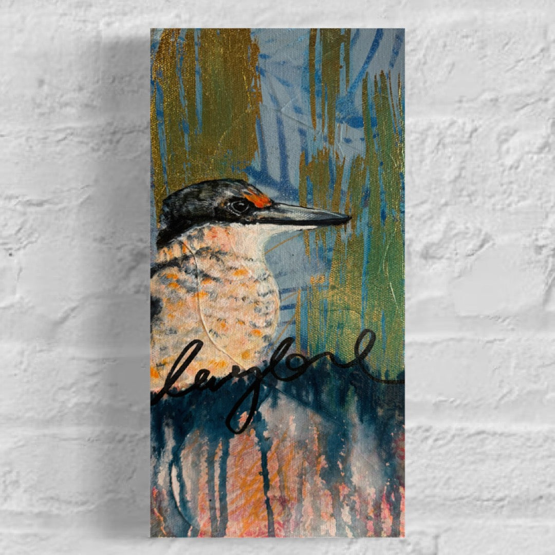This captivating mini painting, part of the Above the Line series, honours the serene and powerful presence of the New Zealand kingfisher (kotare). Revered in Māori mythology as a guardian of waters and a symbol of balance and precision, the kotare embodies strength in stillness and clarity in action.