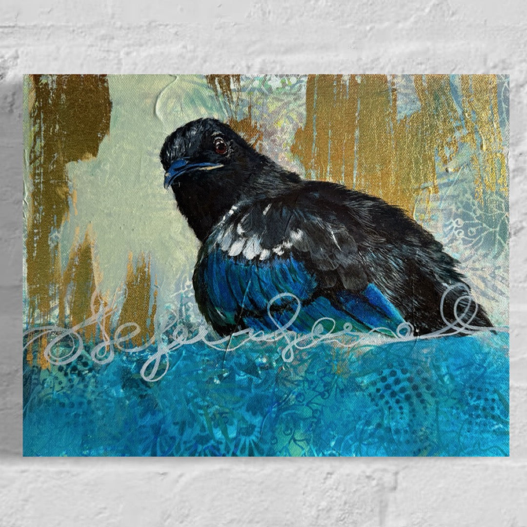 This striking mini painting, part of the Above the Line series, captures the iridescent beauty of the New Zealand tui. Known in Māori mythology as a symbol of strength, freedom, and eloquence, the tui represents the harmonious balance between courage and grace.