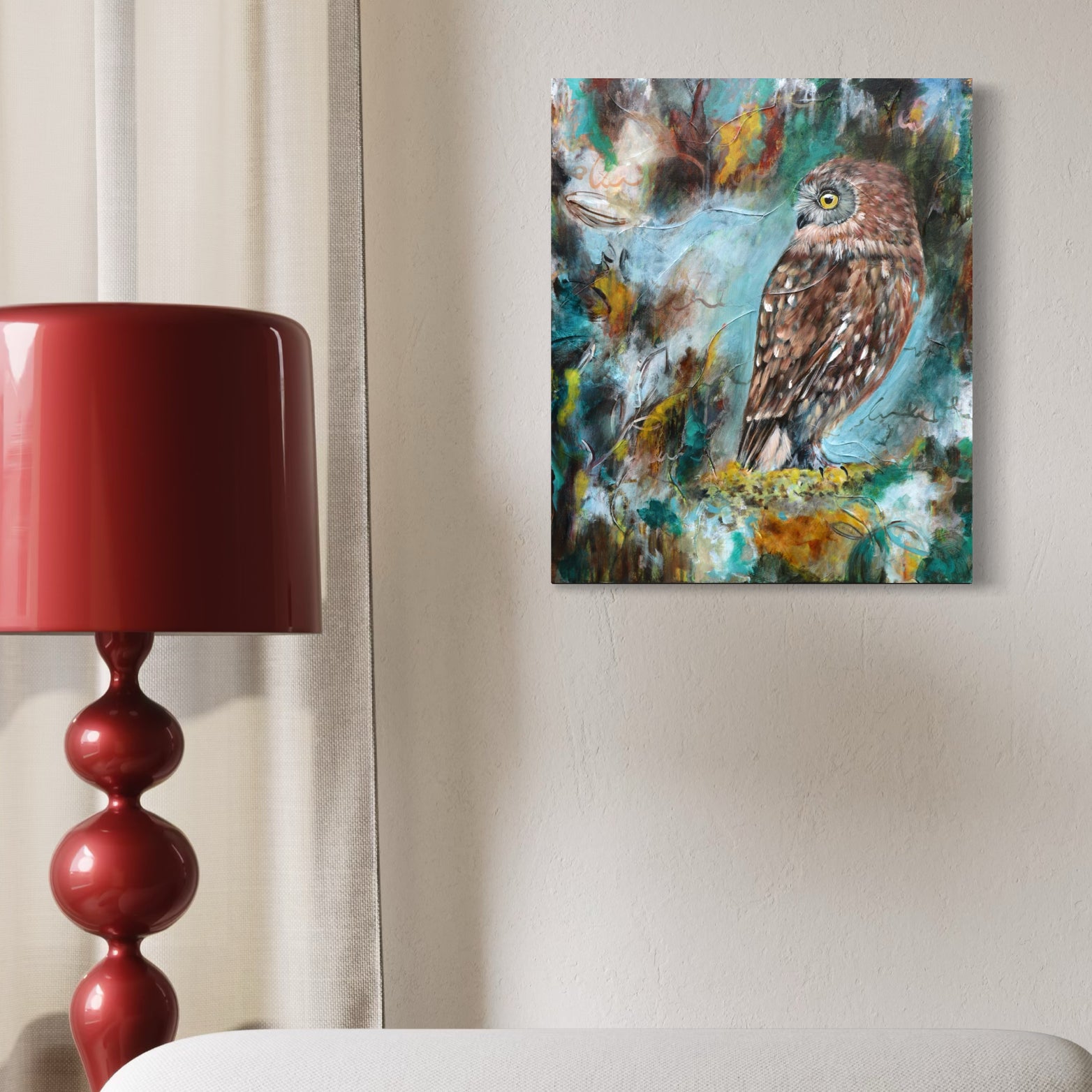 This mixed-media painting is 20 x 24 inches.