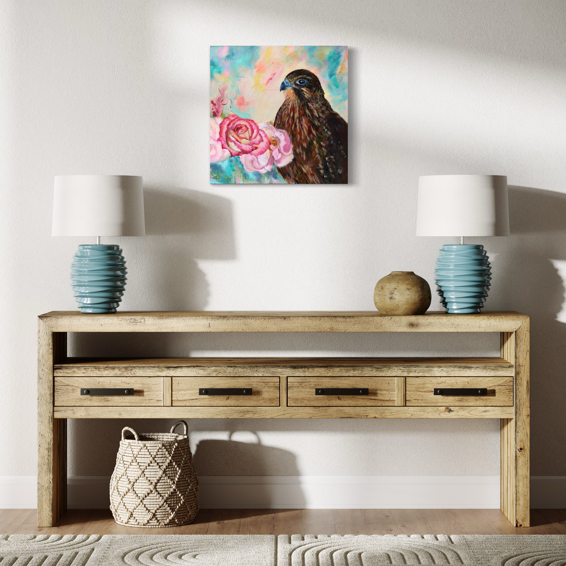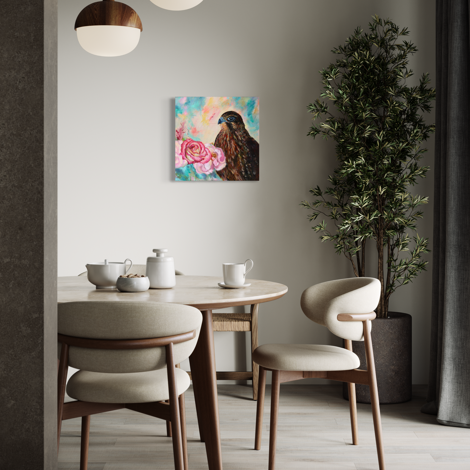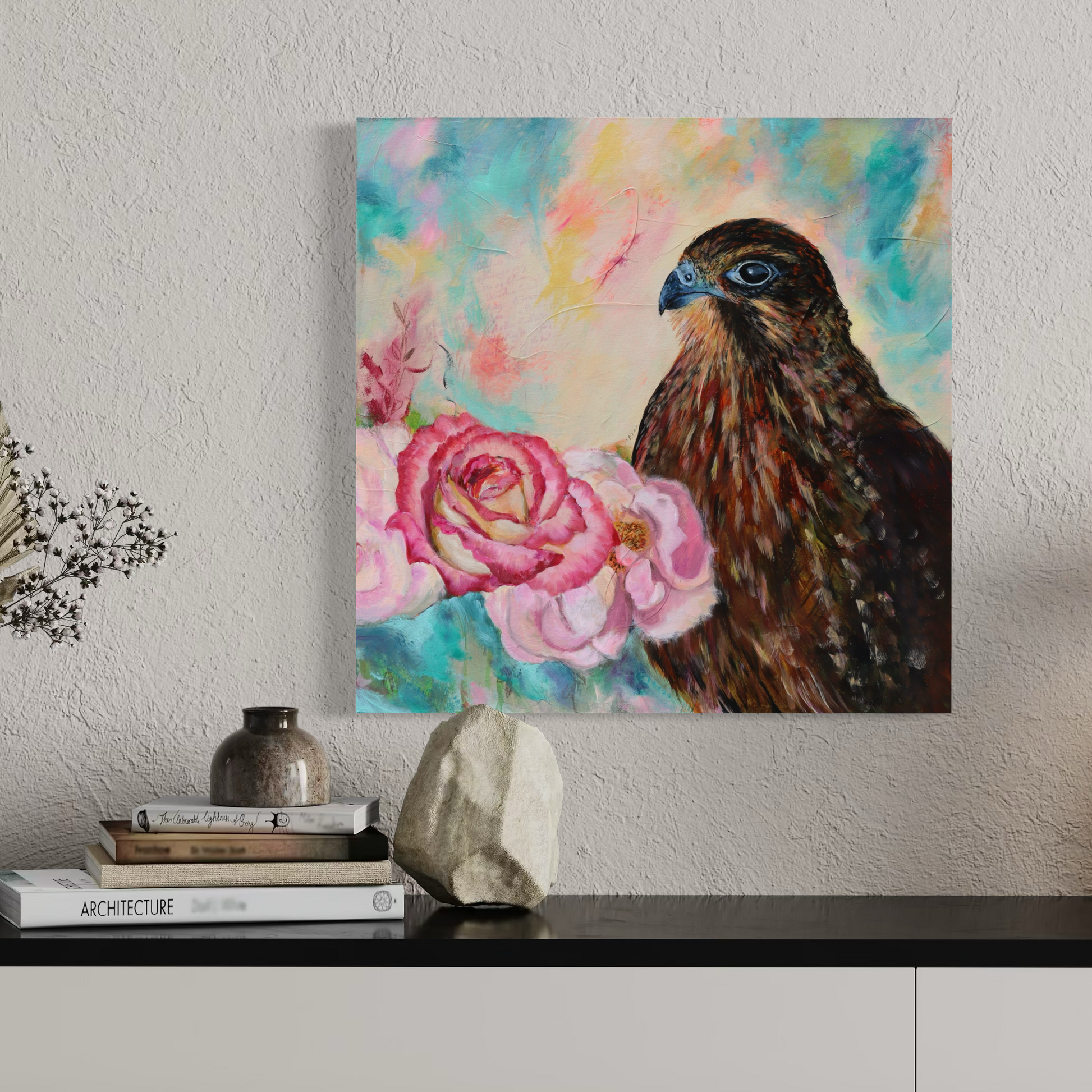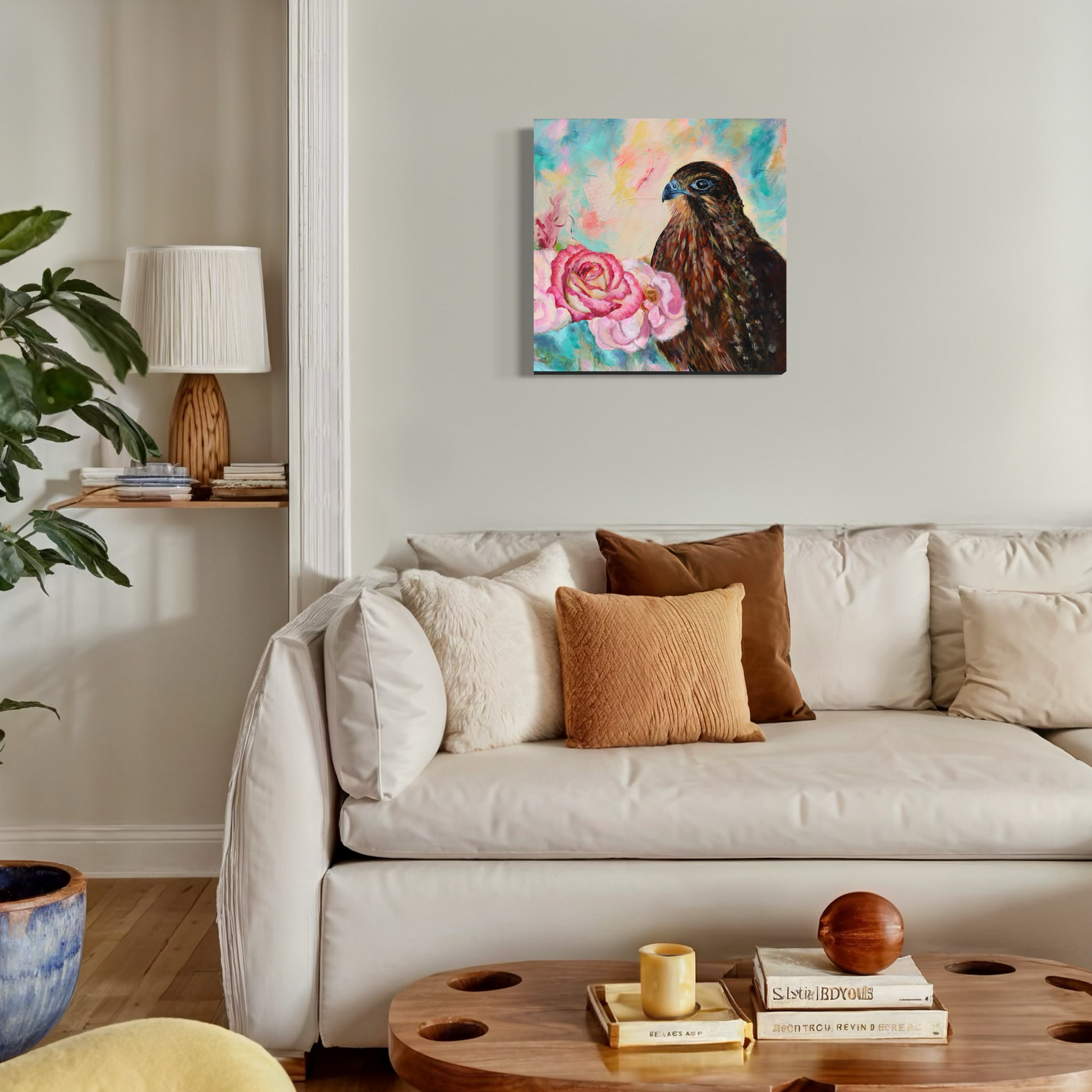 The young kārearea gazes forward, eyes filled with quiet determination. Soft roses bloom at its side, a contrast to its sharp instinct, reminding us that true power is not just about strength, but about balance—grace and fierceness, softness and courage, intuition and action. The background swirls with ethereal hues of gold, pink, and blue, evoking the unseen forces guiding us along our own path of transformation.