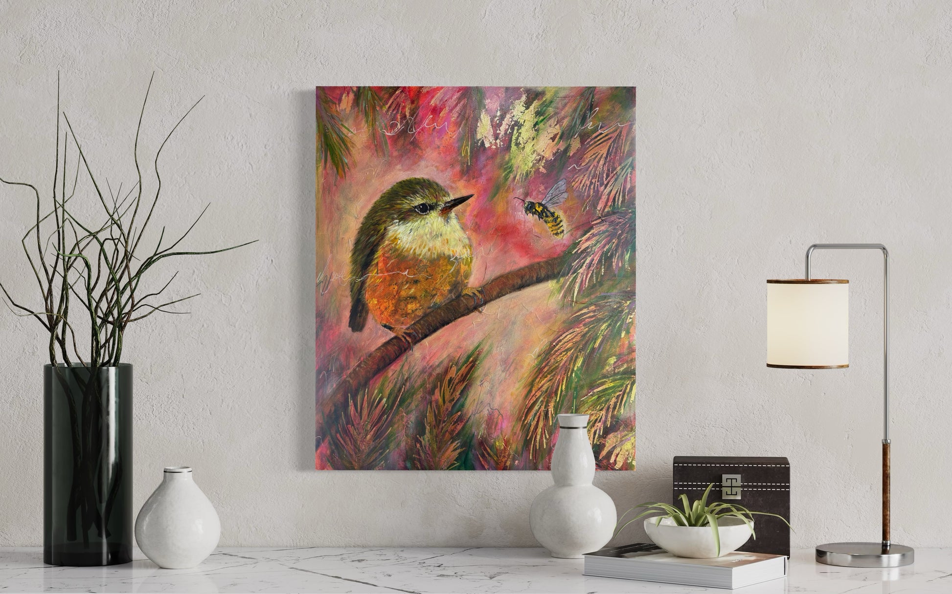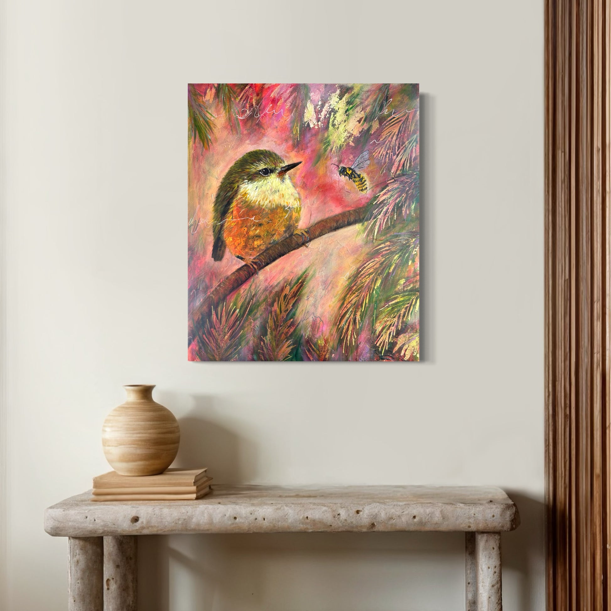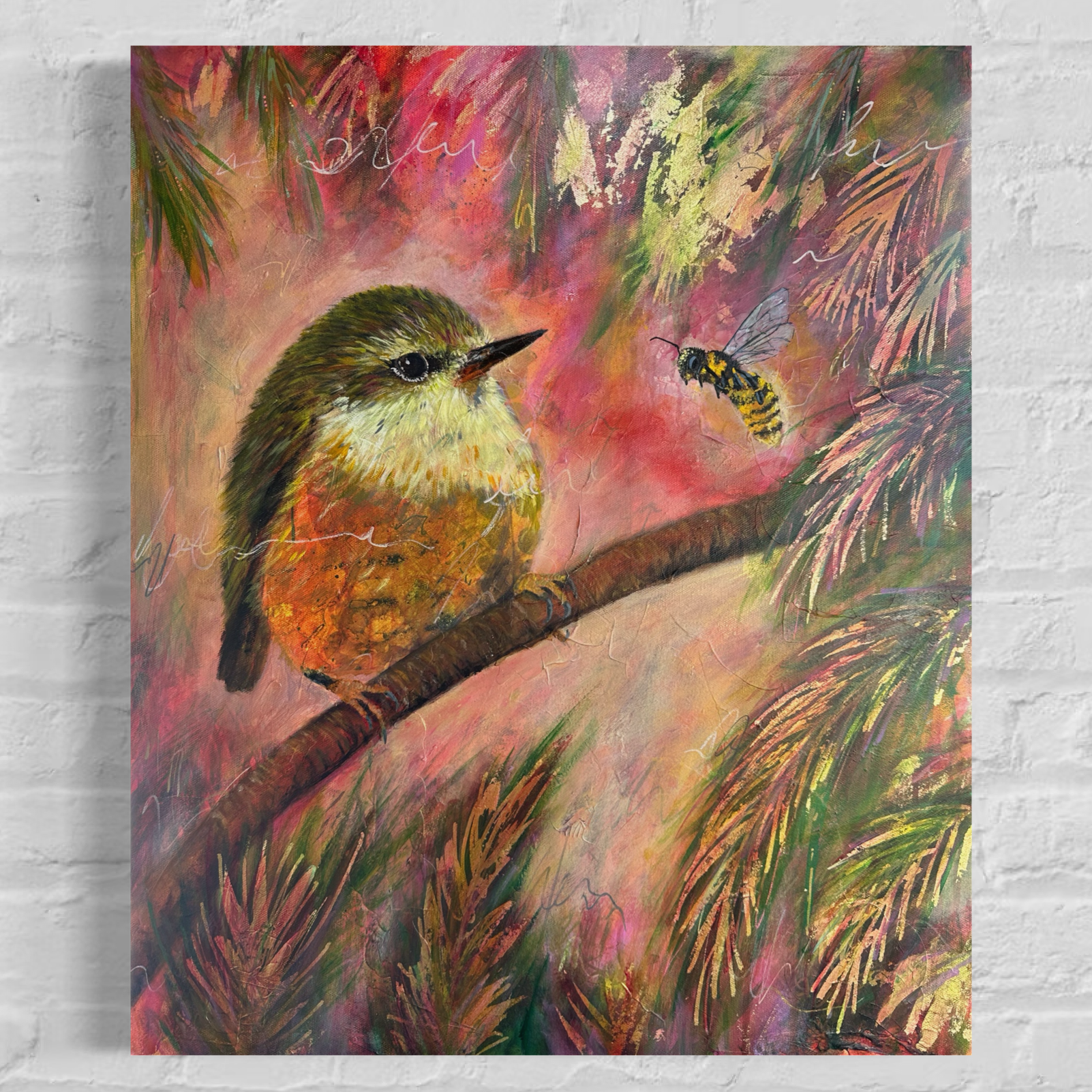 The warmth of this scene invites a sense of ease—an energy of playfulness, freedom, and simply being. The bee hums with purpose, the rifleman perches with gentle curiosity, and together, they exist in effortless balance. There is no need to force, no need to chase—just a natural rhythm, a dance of presence and trust.