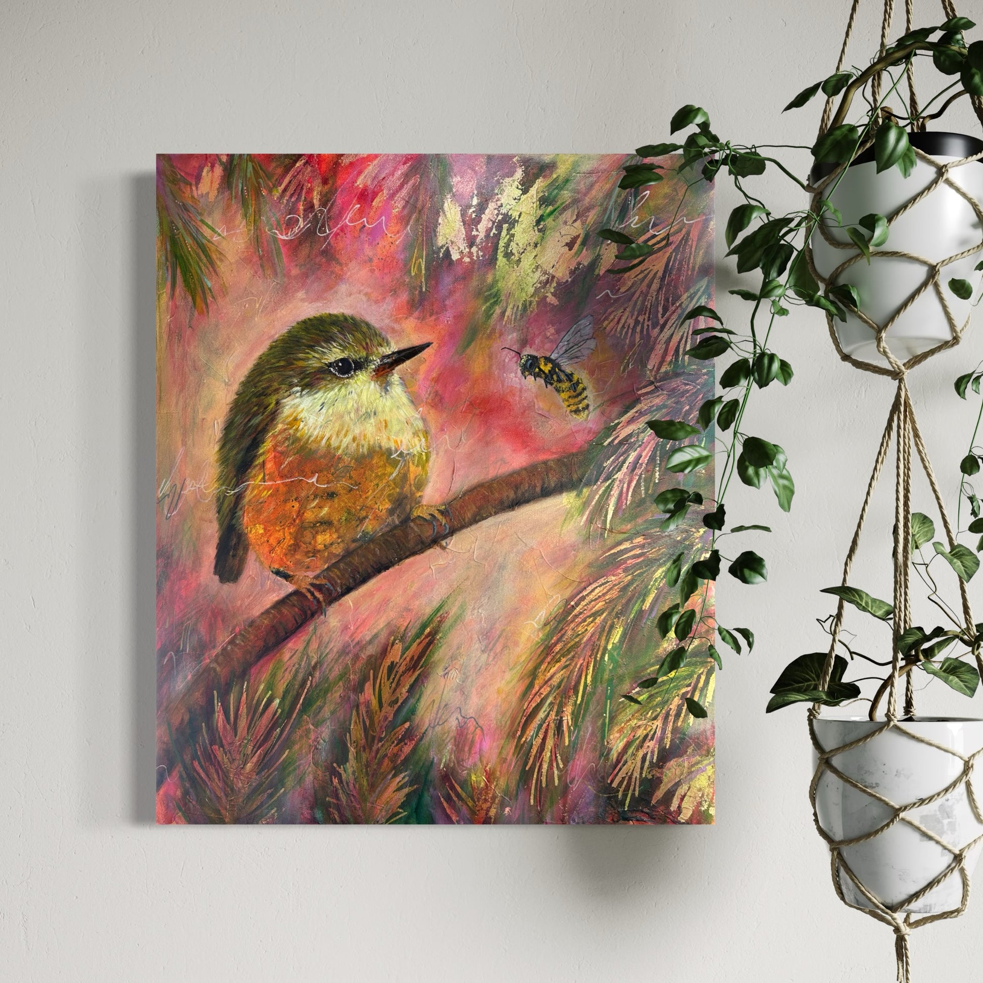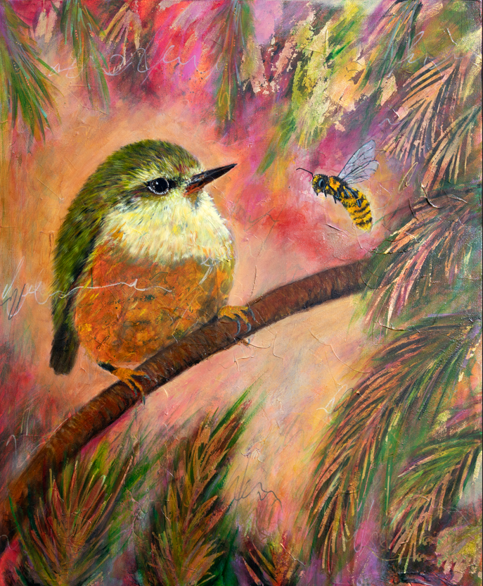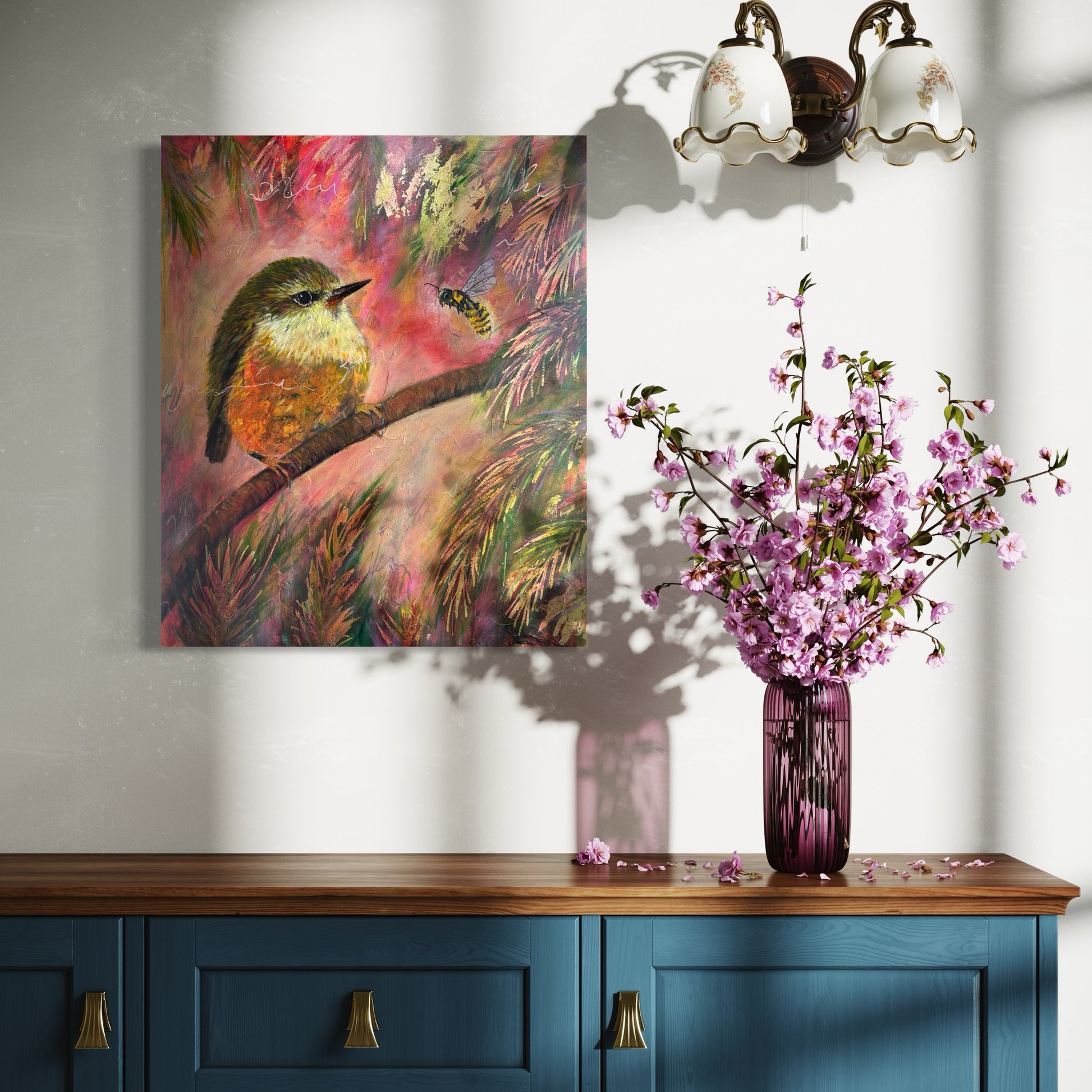 The warmth of this scene invites a sense of ease—an energy of playfulness, freedom, and simply being. The bee hums with purpose, the rifleman perches with gentle curiosity, and together, they exist in effortless balance. There is no need to force, no need to chase—just a natural rhythm, a dance of presence and trust.