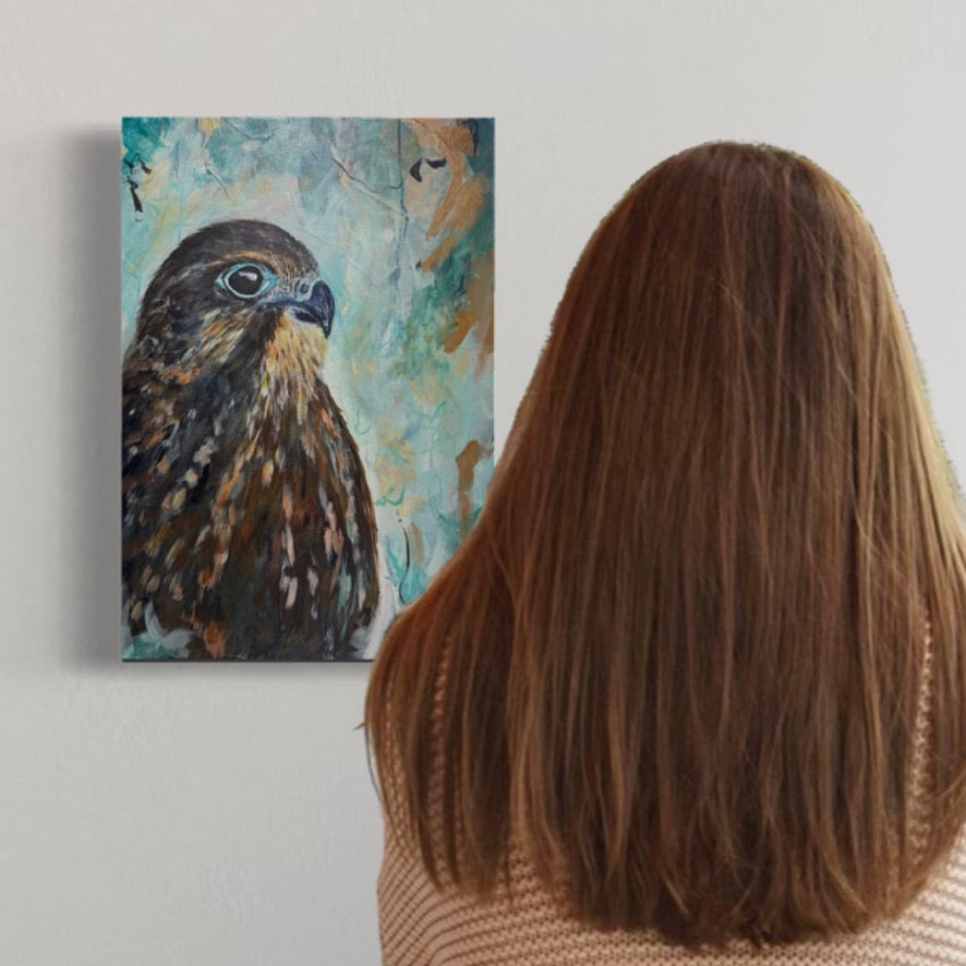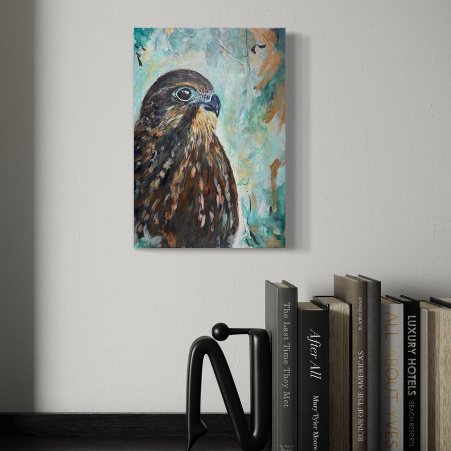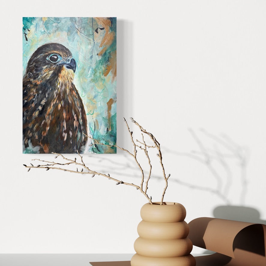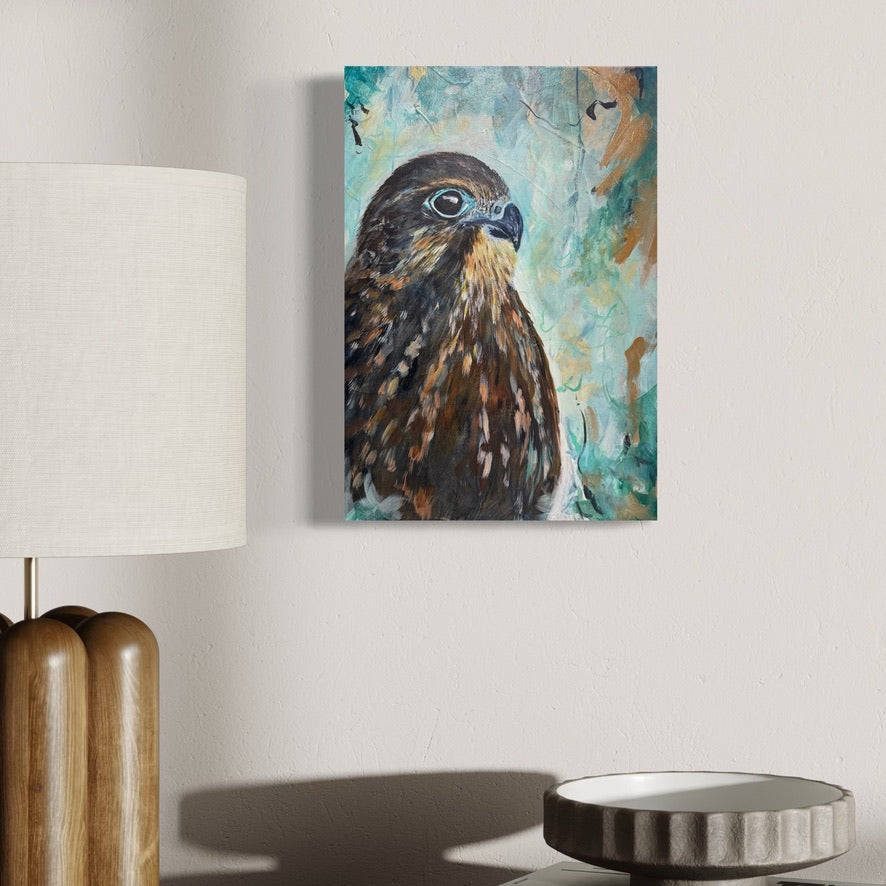 This young kārearea (New Zealand falcon) holds the energy of emergence. Her gaze is steady, forward-facing, fierce with knowing. Though youthful, she carries the ancestral strength of those who have navigated storm winds before her. The abstract background, swirling with teal, ochre and soft mossy greens, echoes the chaos and beauty of change - a sacred terrain of growth and surrender.