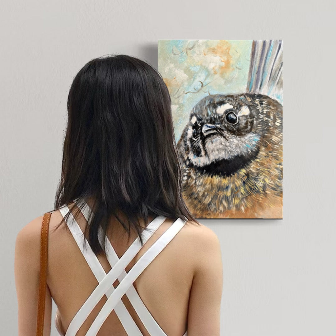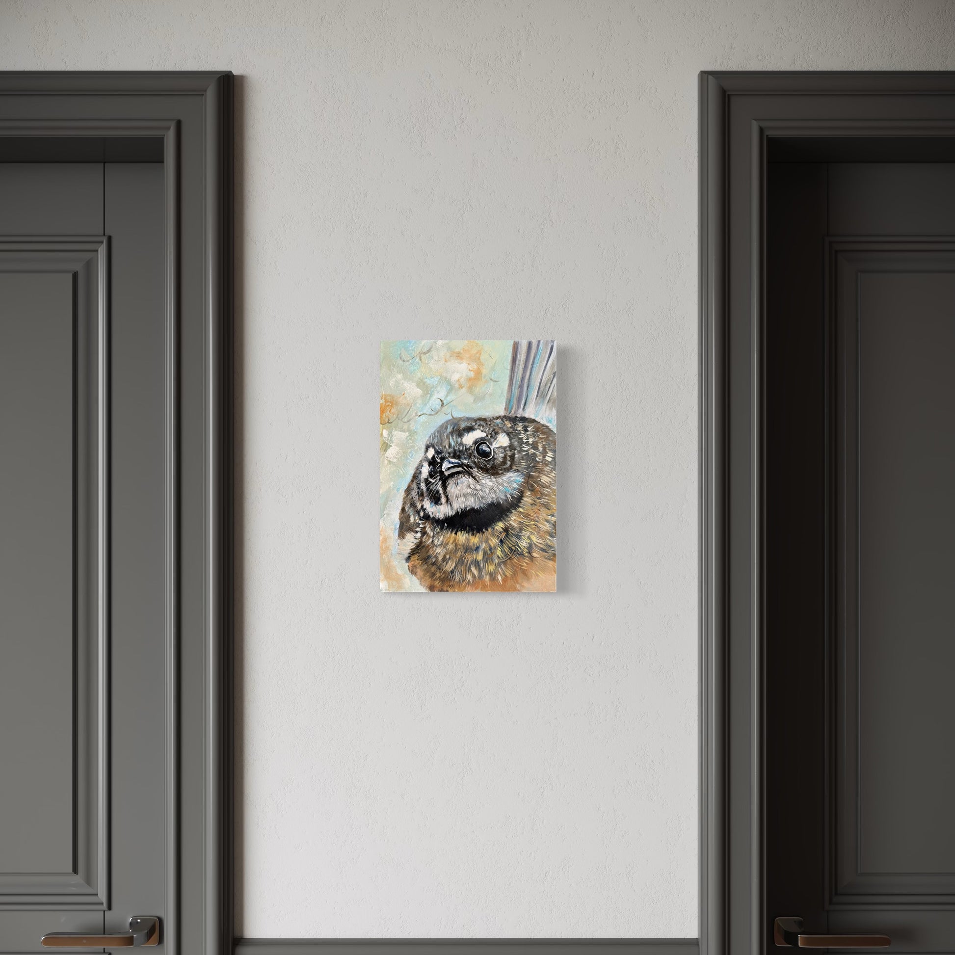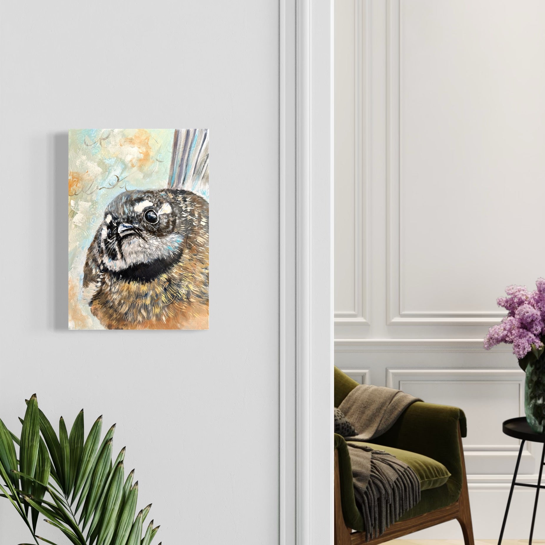 Cheeky, light-hearted, and full of movement, this pīwakawaka practically flits off the canvas. Captured in mid-perch with tail ready to flick, she brings an airy joy and bright energy to any room. A reminder that even in stillness, the soul can dance.