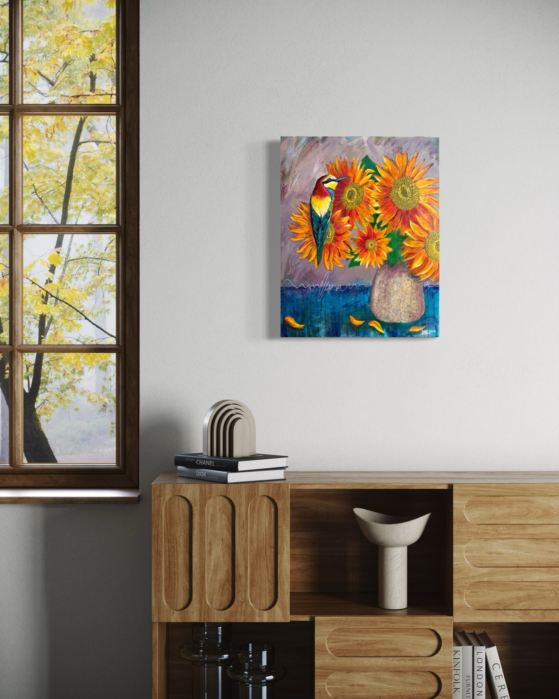 A bright painting to cheer up any space! This South African Bee-Eater sits on a sunflower, contemplating life and the magic surrounding him. How did he get to such a wonderful place!? When you believe in the possibility of anything happening, it can!