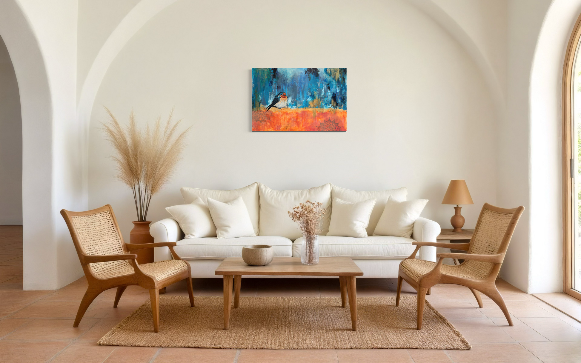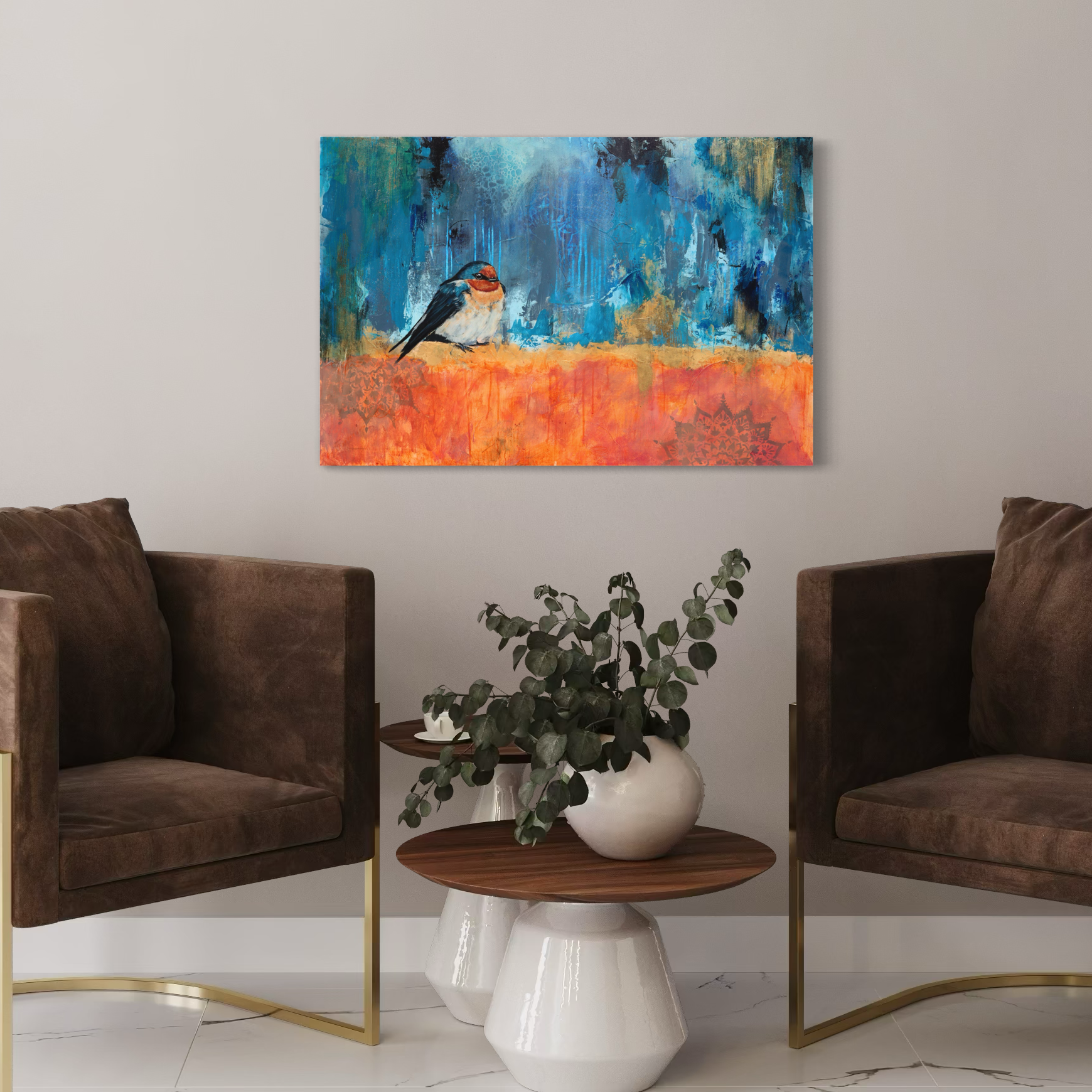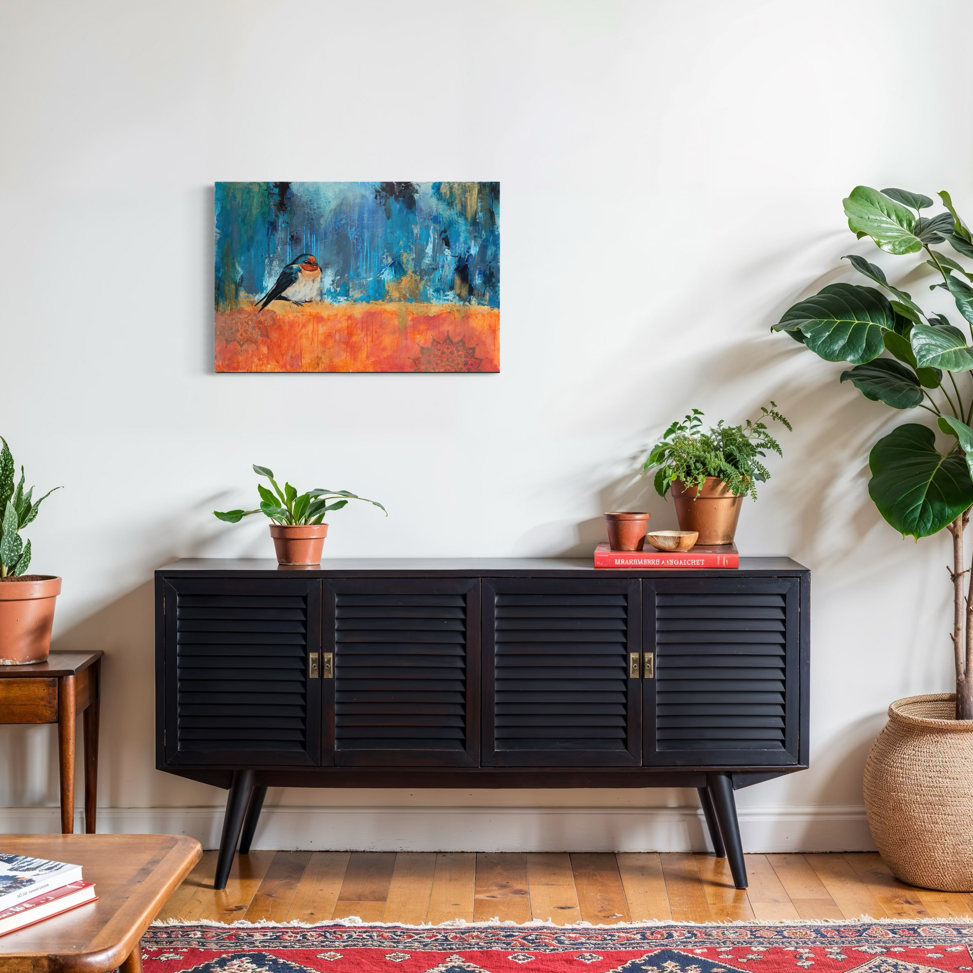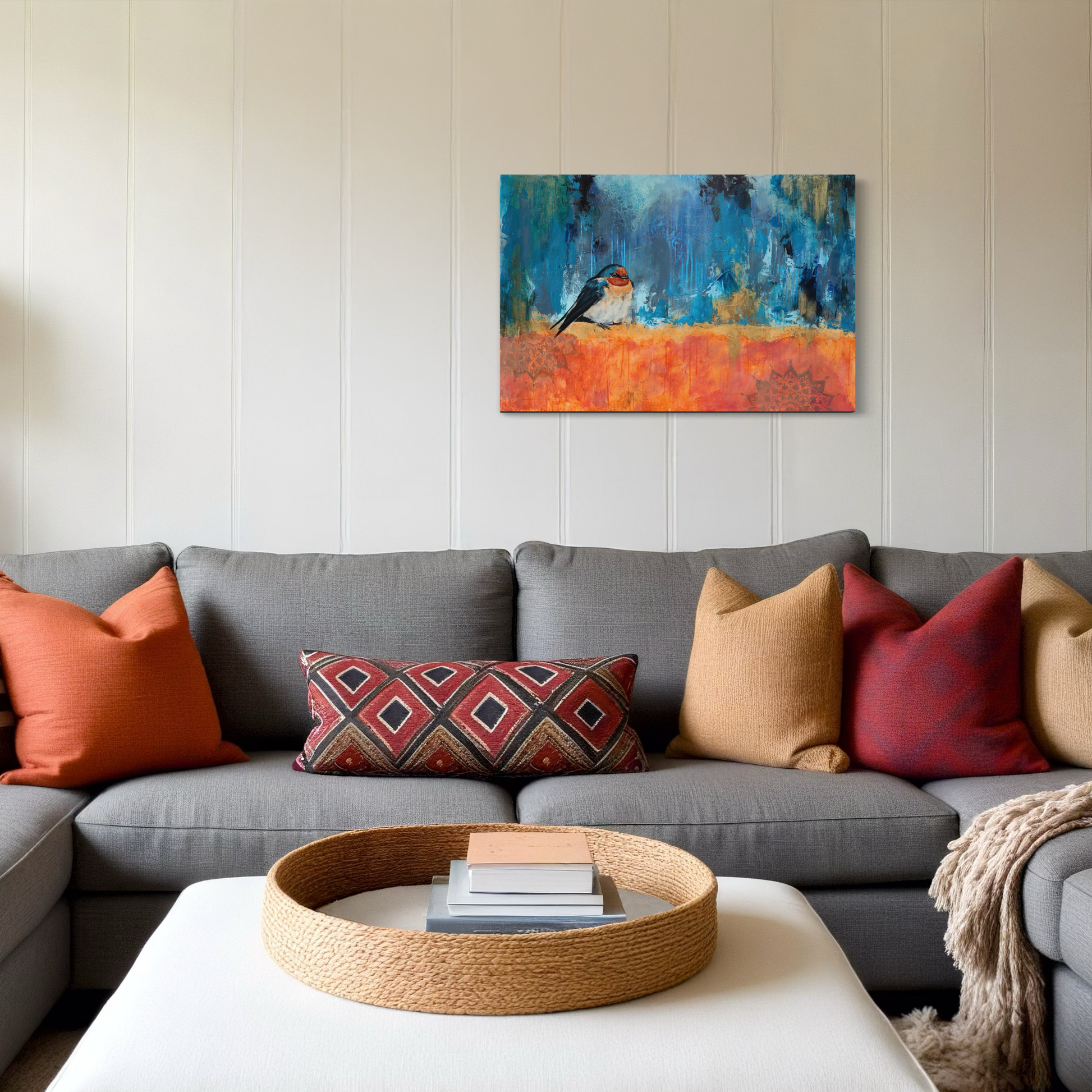 The deep blues of the background, layered with textures and hints of mystery, feel like the vast sky at dusk—an in-between space, where transformation stirs. The fiery oranges and golds ground the painting in warmth, like the last light of the sun before the night unfolds. And the swallow—perched yet poised for flight—holds the energy of trust, adventure, and the unseen currents that guide us.