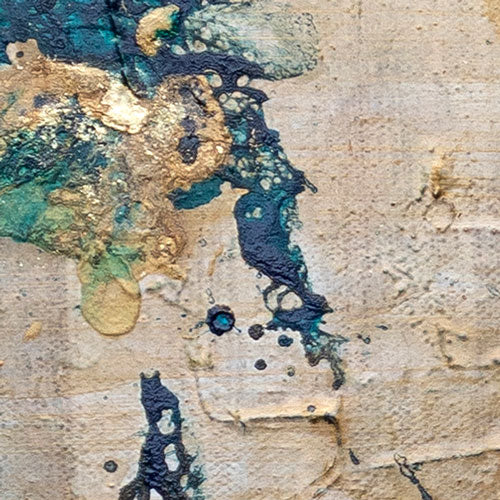 In this painting, the proud Tui claims its place on the right side, a stoic sentinel amid a canvas awash with golds and teals. Each painted stroke is a testament to the bird's regality, capturing a moment frozen in time. The composition weaves a tapestry of sophistication, where the Tui, with dignified poise, becomes a visual anchor. The deliberate choice of colours serves not merely as a backdrop but as a harmonious extension of Tui's majestic aura. "The Enchanting Tui" beckons viewers into a contemplative journey, inviting them to explore the nuanced interplay of form and colour in this captivating avian painting.