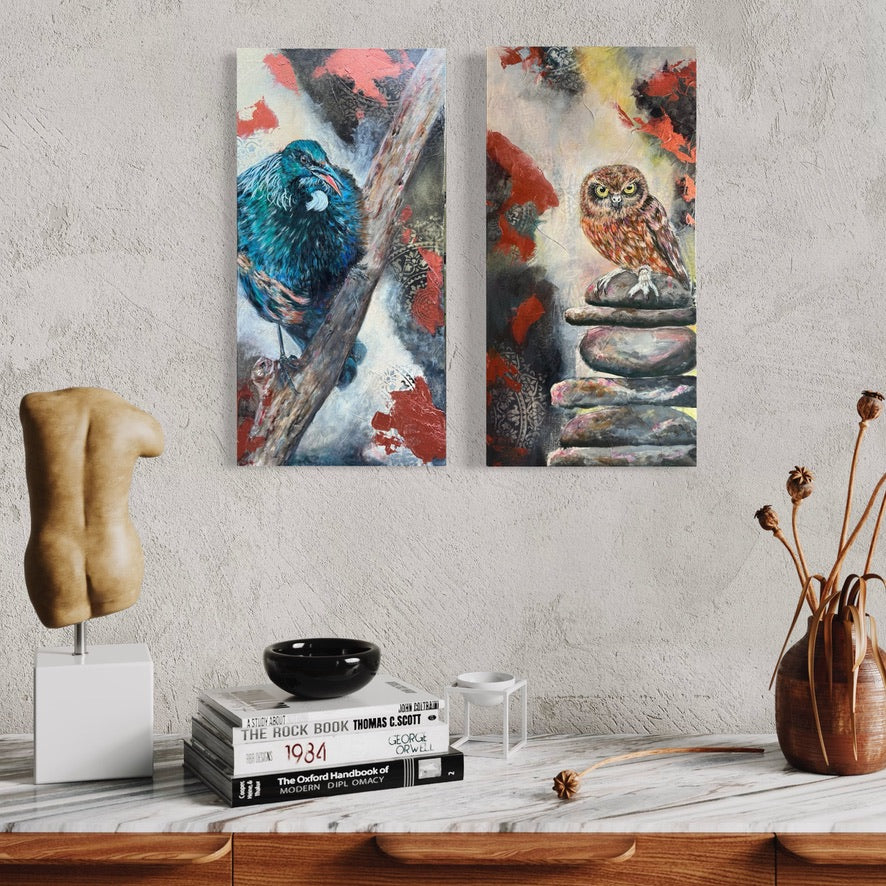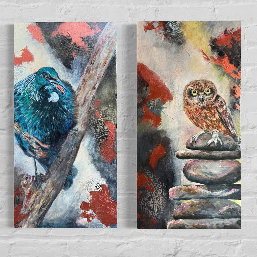 Created as a companion to Watcher at the Edge, this painting brings the voice of the tūī into the unfolding story: a messenger of joy, duality, and sacred connection. Where the ruru sees into the dark, the tūī sings light into it—offering vibrancy, movement, and the reassurance that those who have gone before still walk beside us.