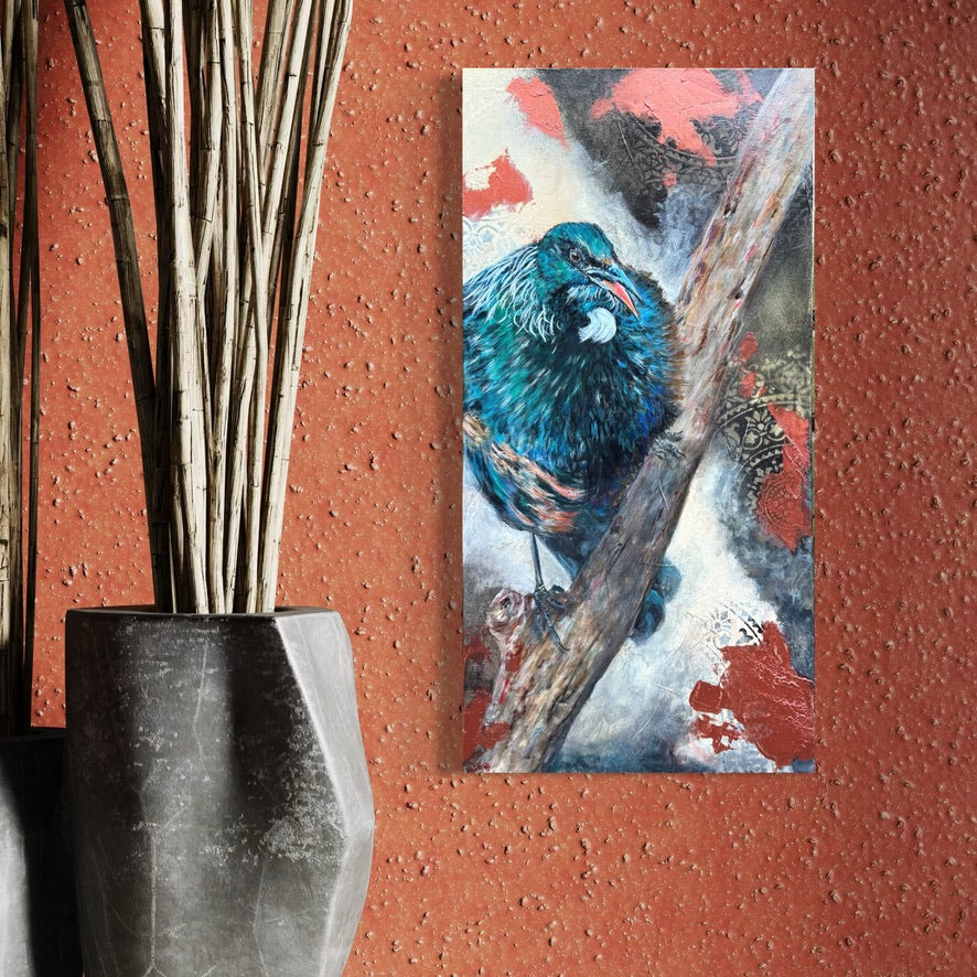 Perched in quiet strength, this tūī embodies the ancestral whisper—not loud, but constant. Not demanding, but devoted. A living echo of those who came before, still watching, still holding, still loving.