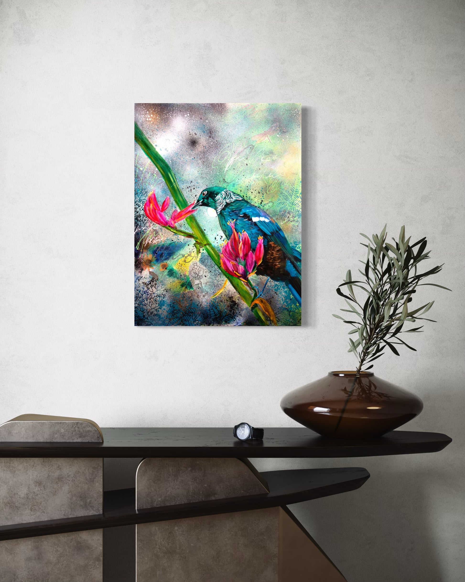 A symphony of colour and texture, Tui’s Blooming Sanctuary invites you into a lush, dreamlike garden where nature and imagination intertwine. At its heart, a New Zealand tui perches delicately on a bright pink flower, its iridescent feathers shimmering against a background alive with movement and depth.