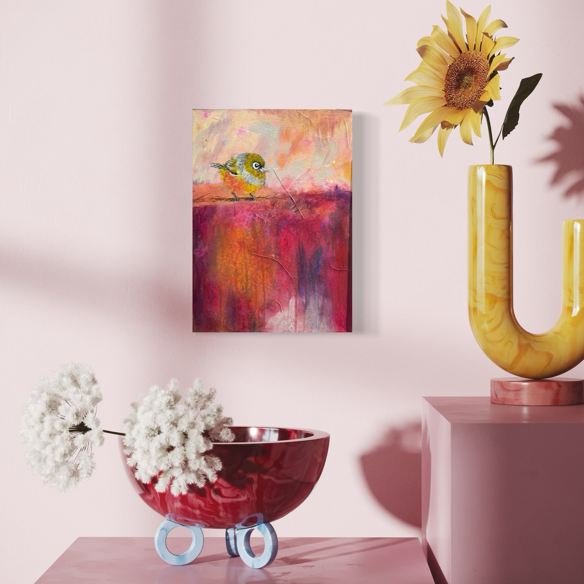 When I created Waxeye Whispers, I wanted to capture the magic and light that the New Zealand Waxeye, or Tauhou in Māori, brings into our world. This little bird, so full of life and symbolism, inspired me to explore themes of connection, exploration, and hidden treasures.