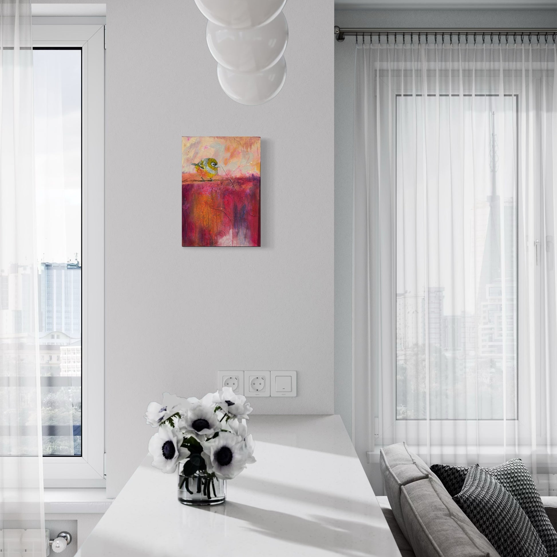 As I worked on this piece, layering hues of gold, soft purples, blush pinks, and creamy whites, I infused every brushstroke with intention and a sense of wonder. For me, this painting is more than just an image—it’s a portal to creativity and spiritual harmony. The Waxeye, with its playful energy, felt like the perfect guide for this journey of possibility.