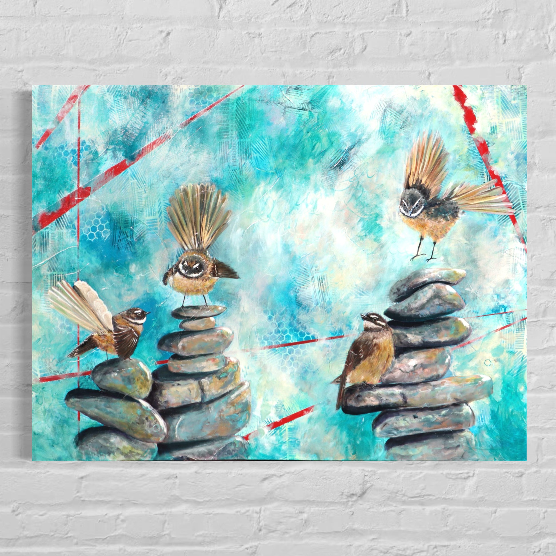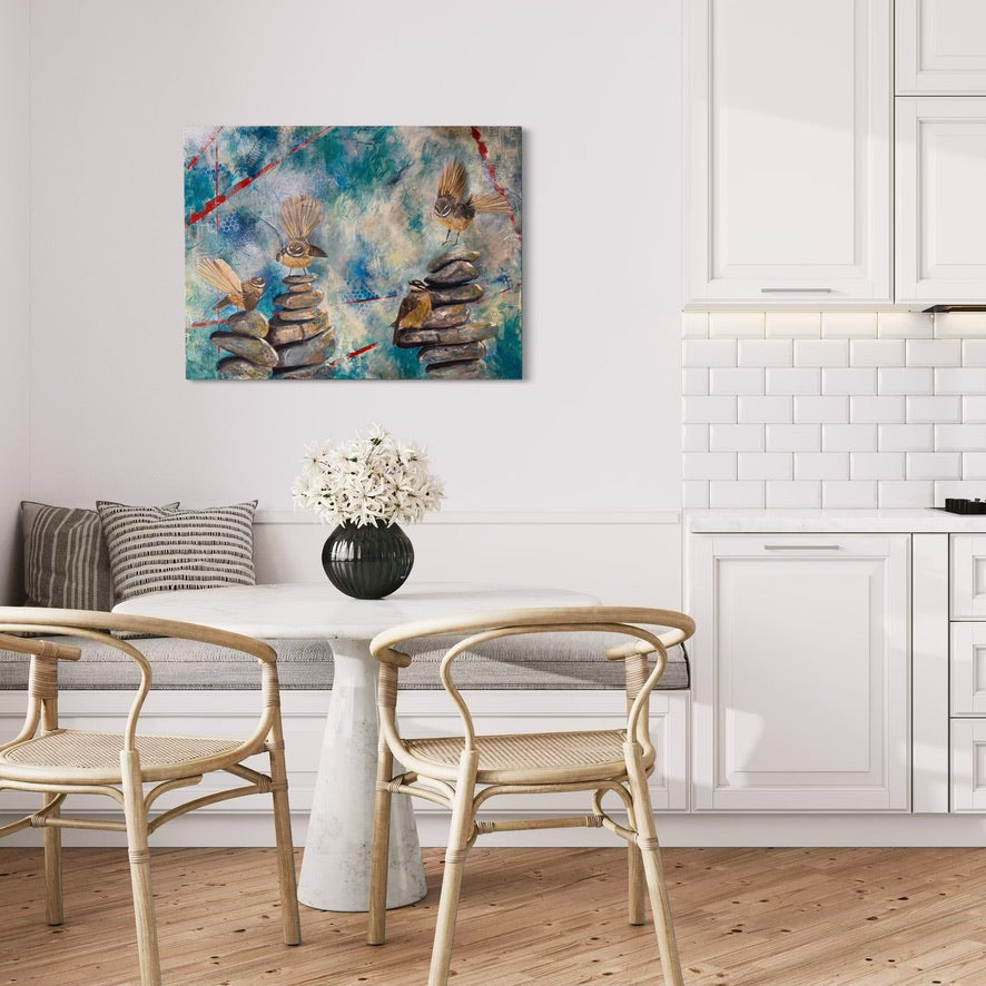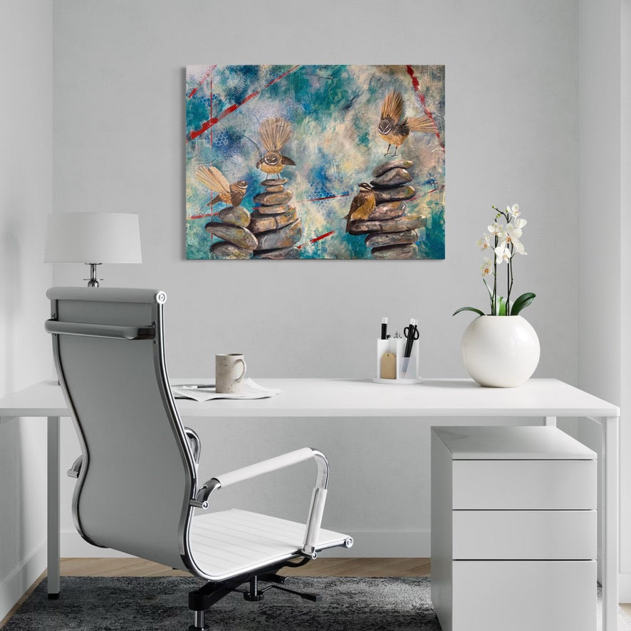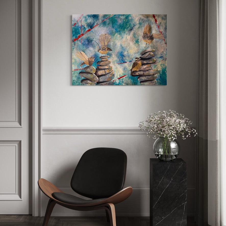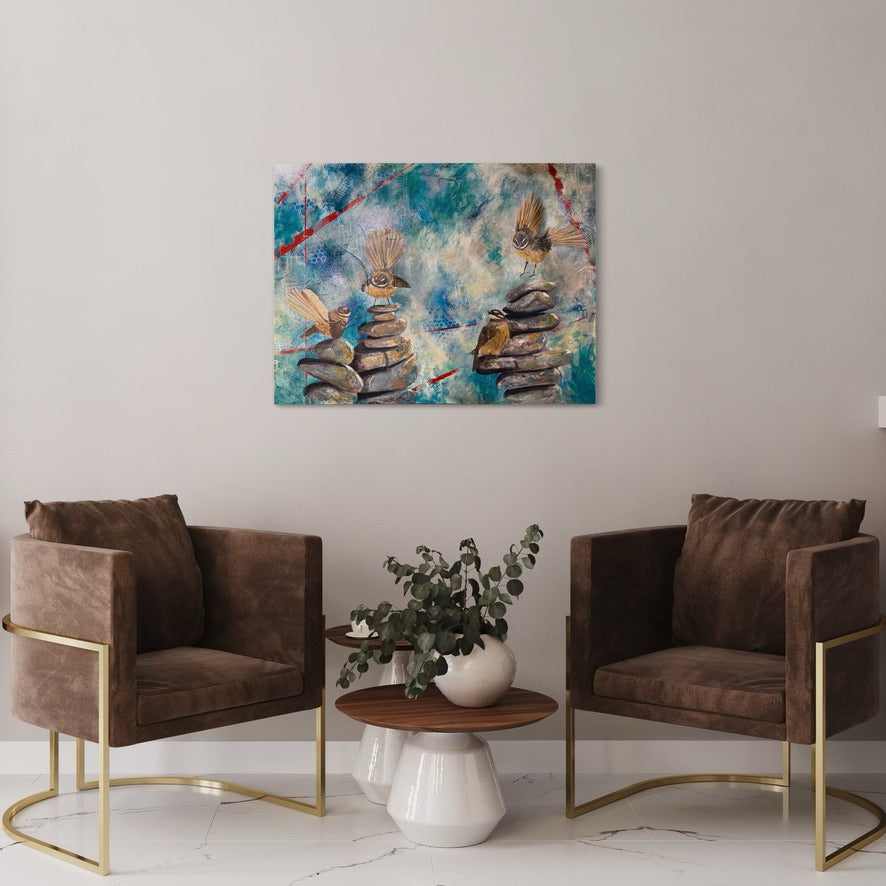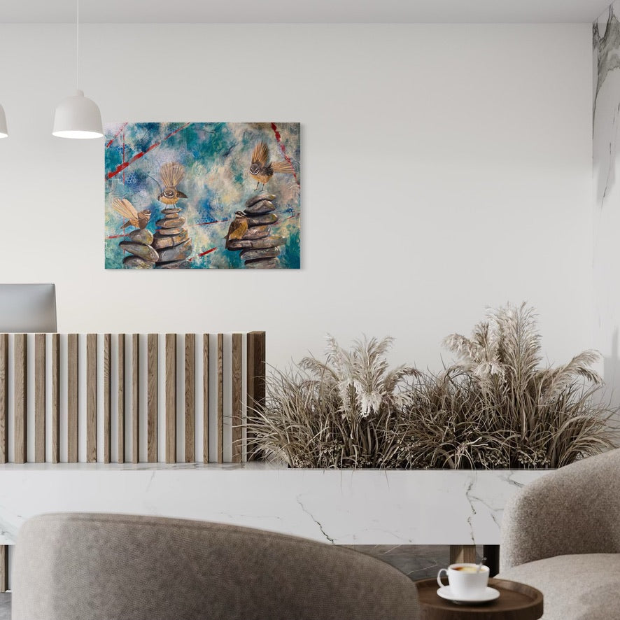 Each pīwakawaka (fantail) represents a different part of the community: the curious spark of the students, the steady presence of the teachers, the guiding support of the staff, principal and board, and the ever-present legacy of those who have gone before. Together, they perch and flutter across cairns of stone—symbols of grounding, intention, and the balance needed to nurture growth.