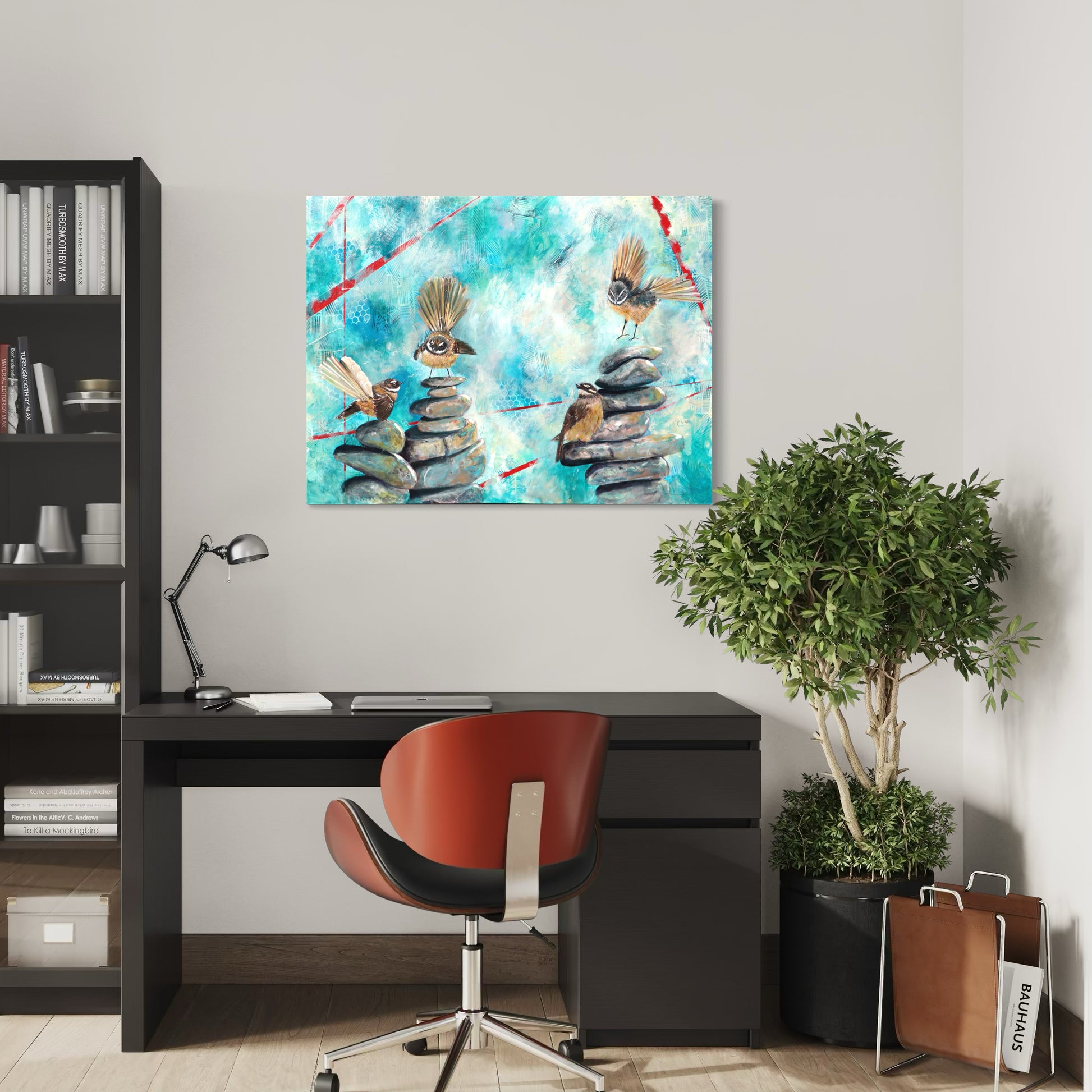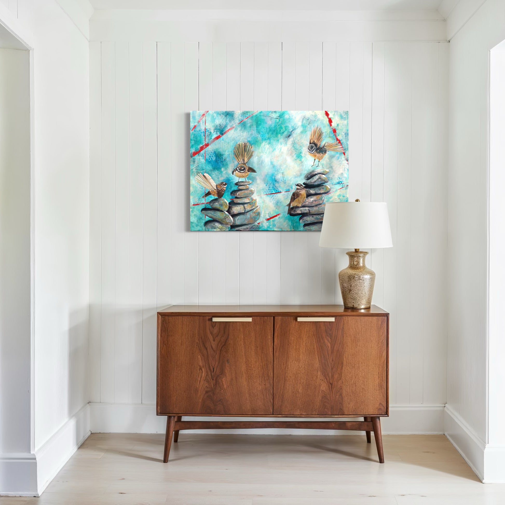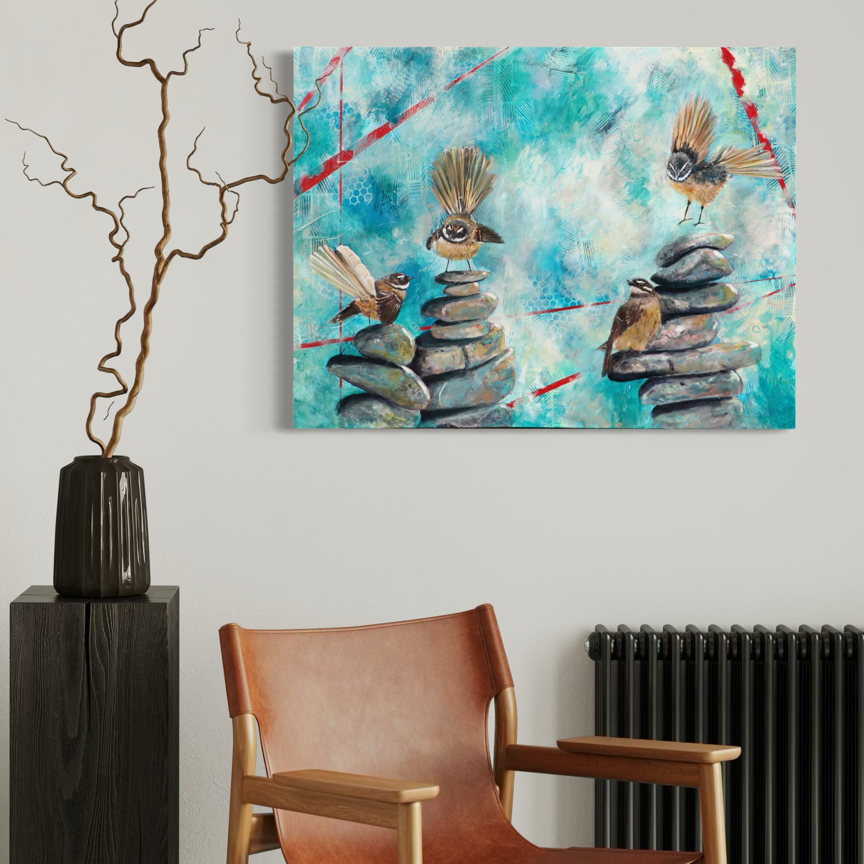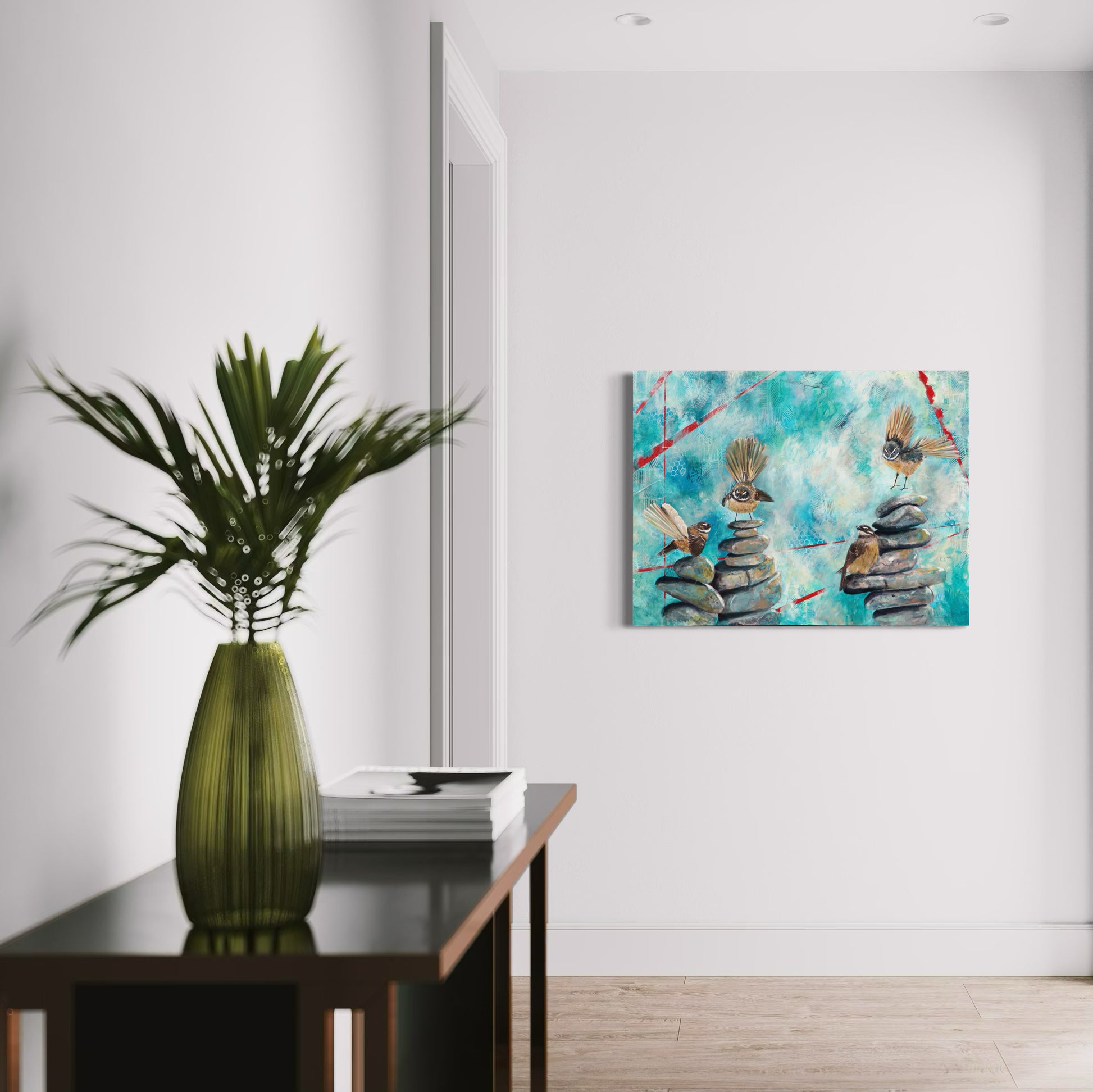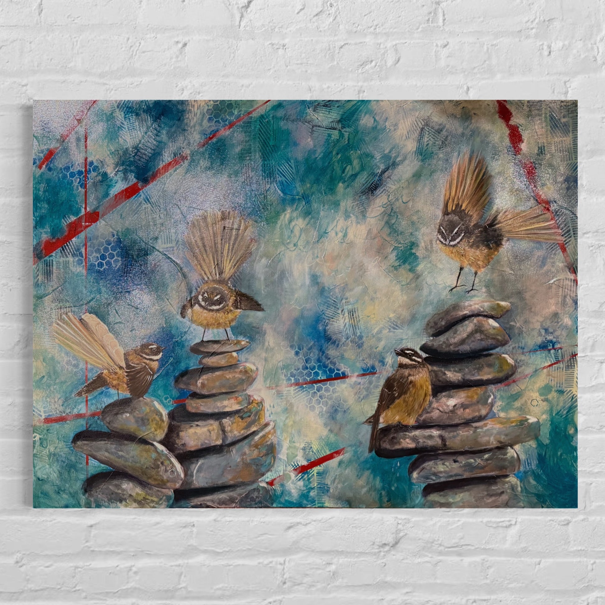 Each pīwakawaka (fantail) represents a different part of the community: the curious spark of the students, the steady presence of the teachers, the guiding support of the staff, principal and board, and the ever-present legacy of those who have gone before. Together, they perch and flutter across cairns of stone—symbols of grounding, intention, and the balance needed to nurture growth.