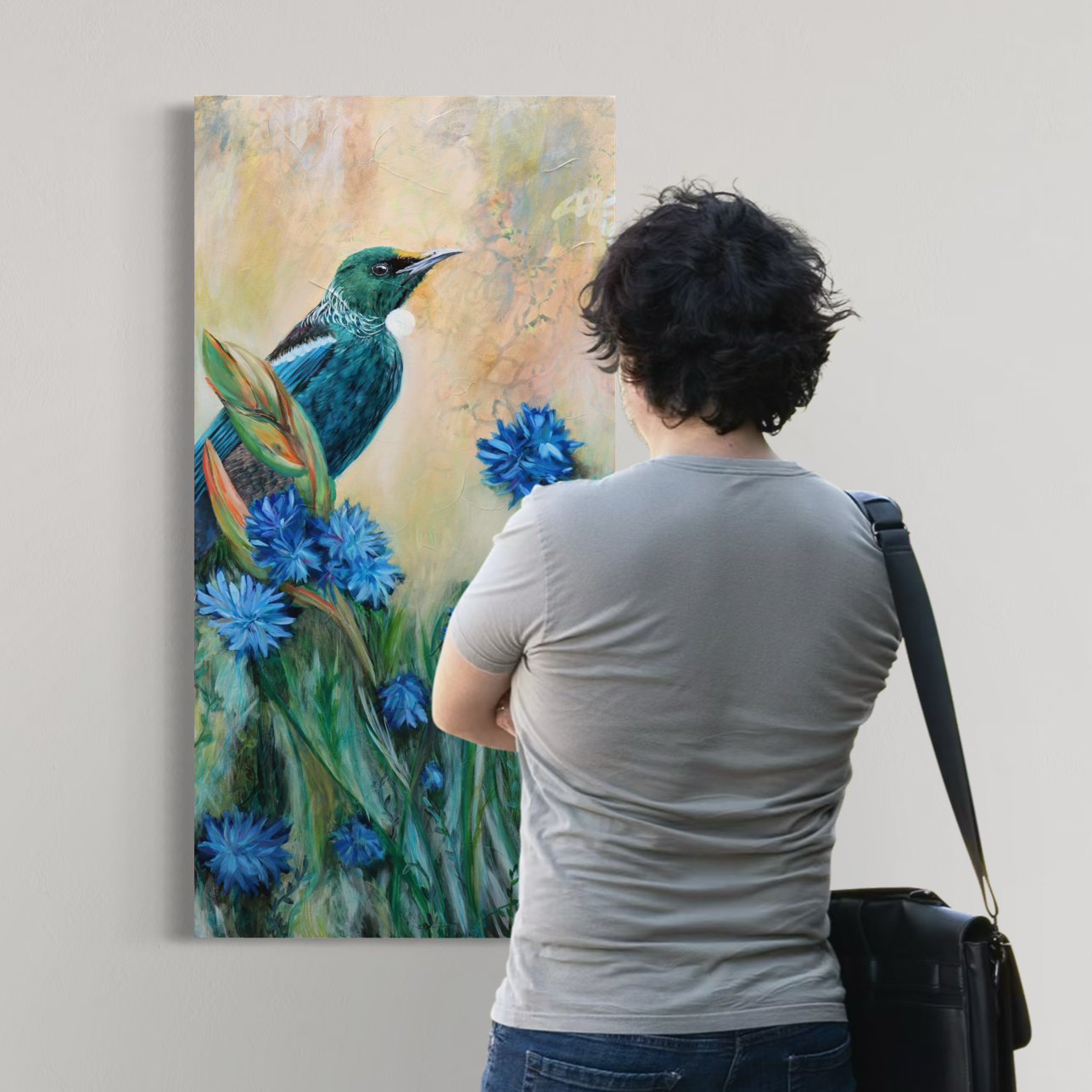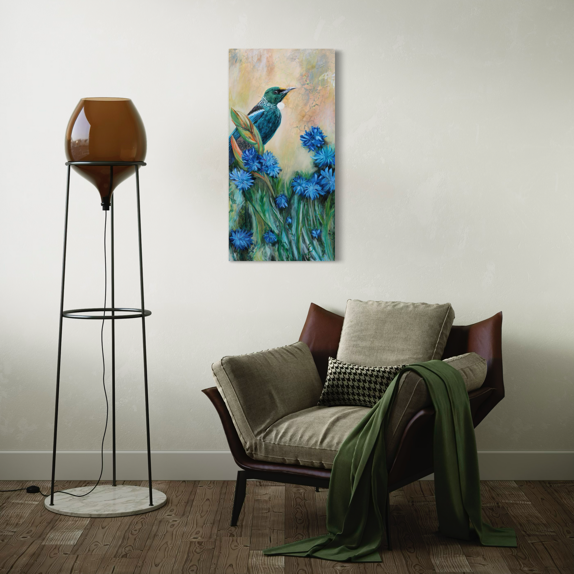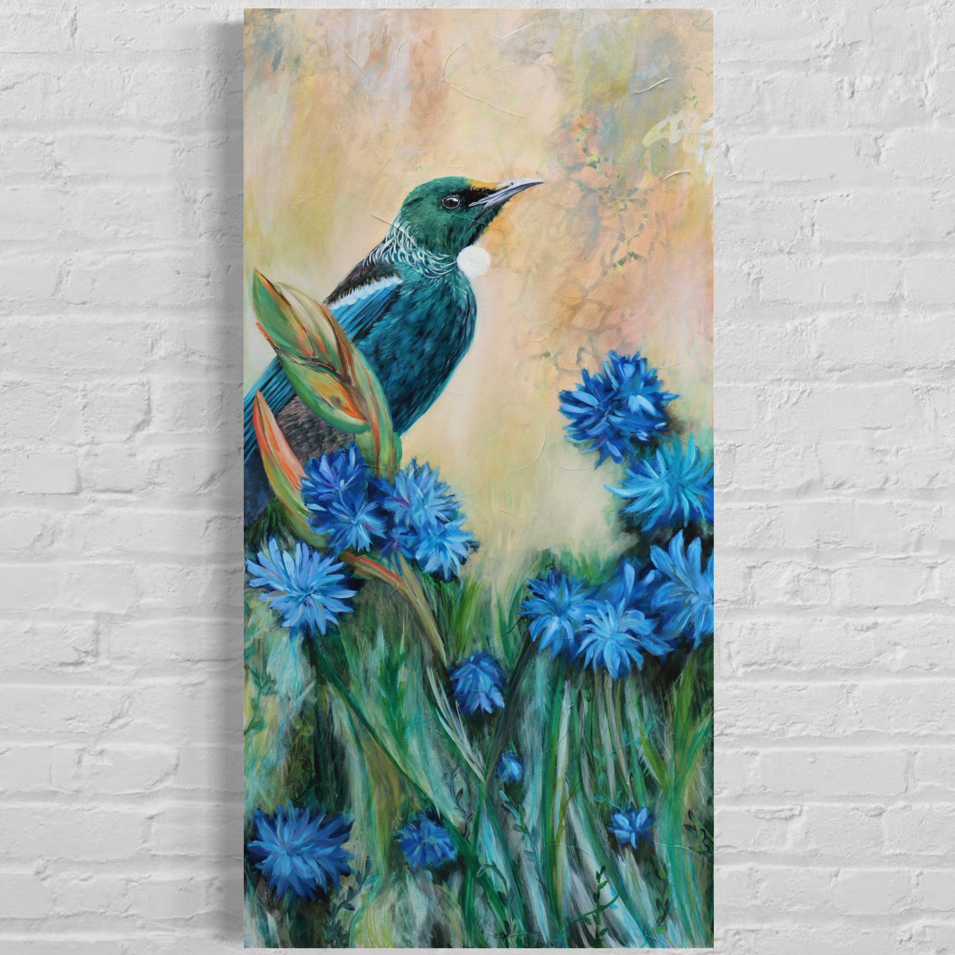In the heart of this piece, a tūī perches with quiet confidence, surrounded by a symphony of blue cornflowers. The deep iridescence of its feathers catches the light, shifting between emerald, sapphire, and ink-black—a reflection of its ever-changing, untamed spirit. The native flax, with its strong, grounding presence, stands as a reminder of home and resilience.