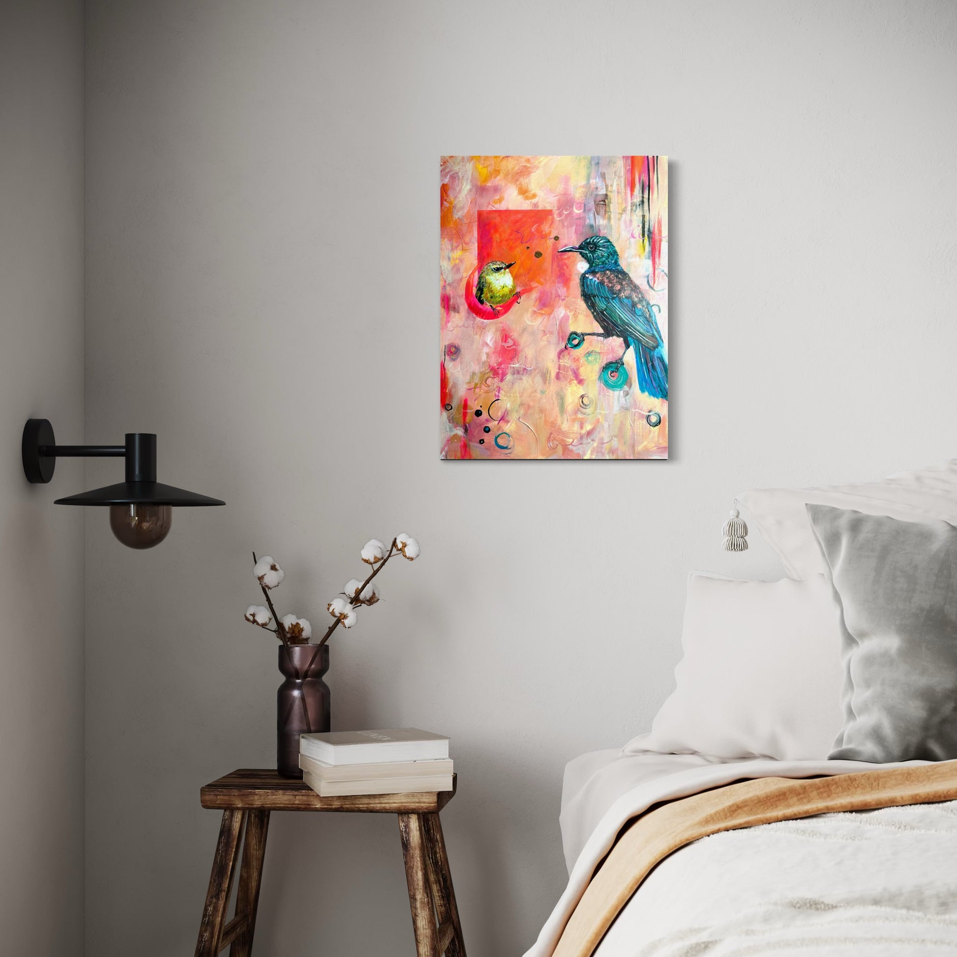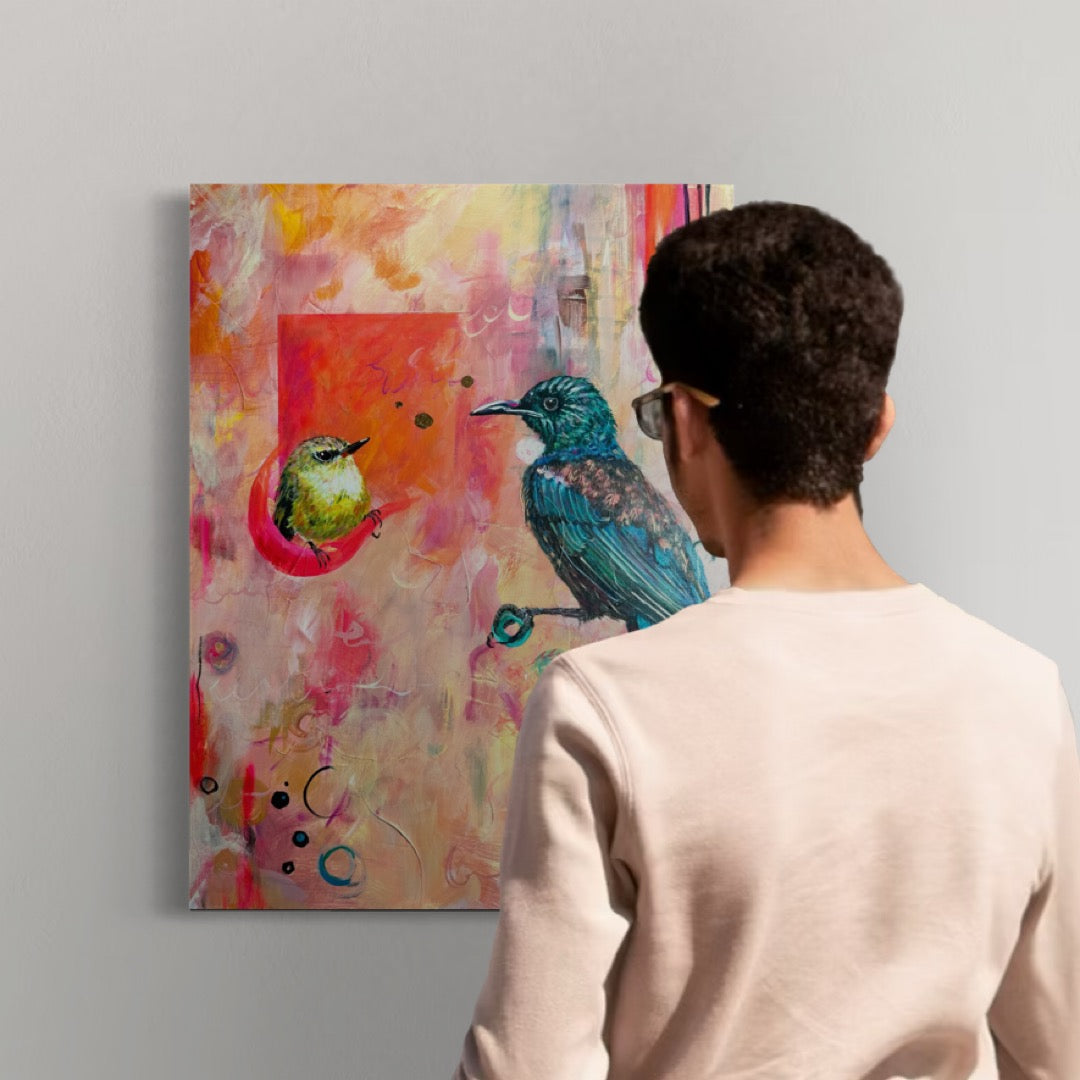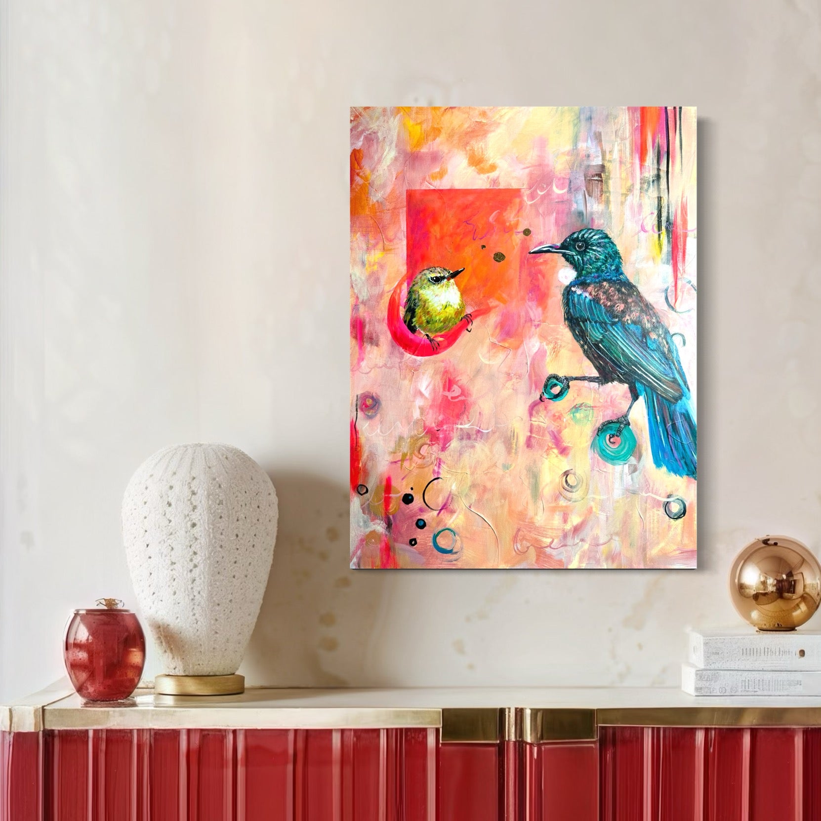 The Colour of Yes captures a surreal moment of connection: a tiny rifleman, luminous and bright-eyed, meets a majestic tūī mid-song. Their encounter floats in a dreamscape of pinks, golden light, and deep turquoise, surrounded by symbols that drift like thoughts, questions, and laughter.