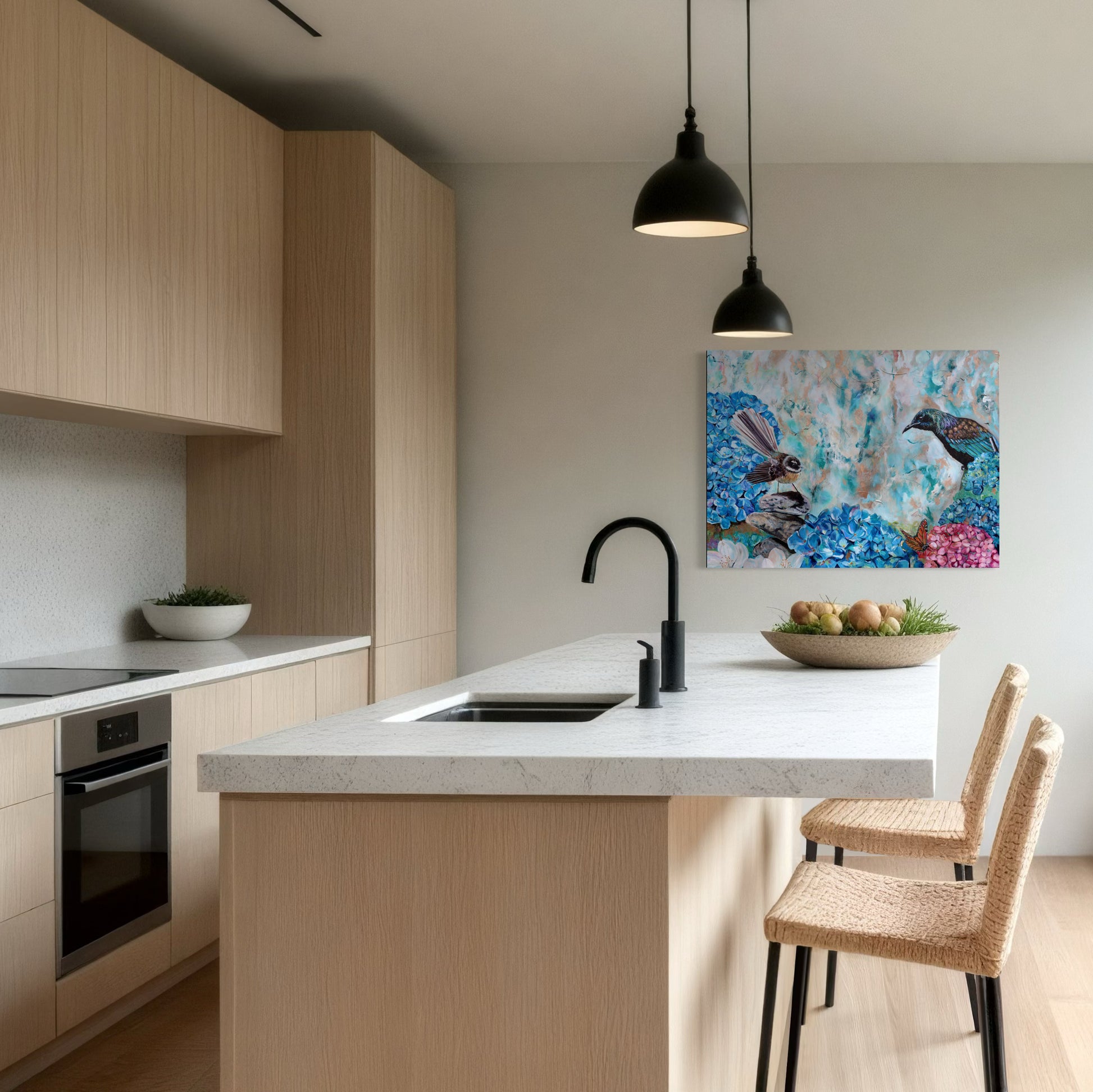 In every home, there’s a place where stories gather - a space that hums with warmth, laughter, and quiet connection. Earth & Soul captures that same energy. The tui, pīwakawaka, and butterfly each hold their own presence, yet they meet here in harmony - between worlds, between moments, between breaths.